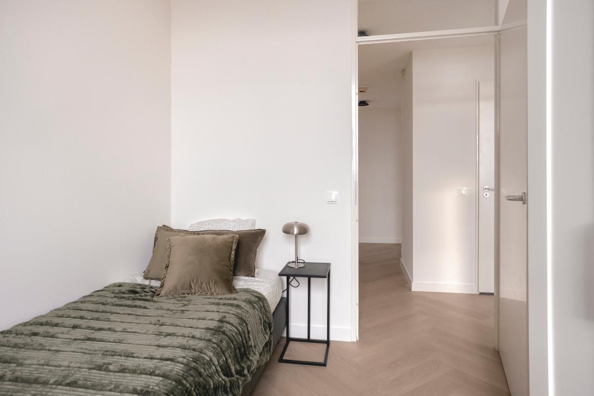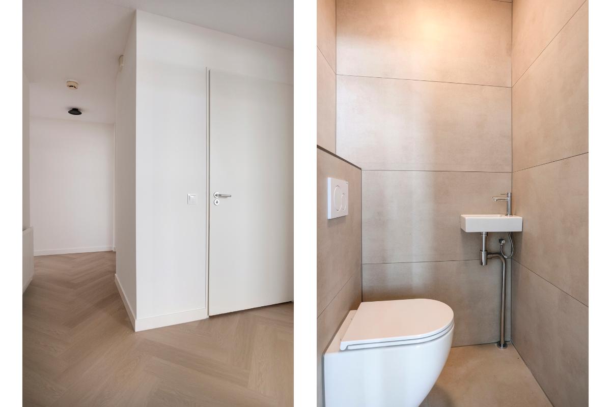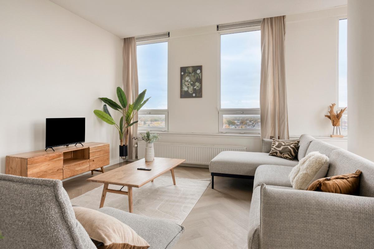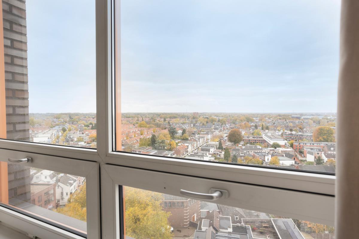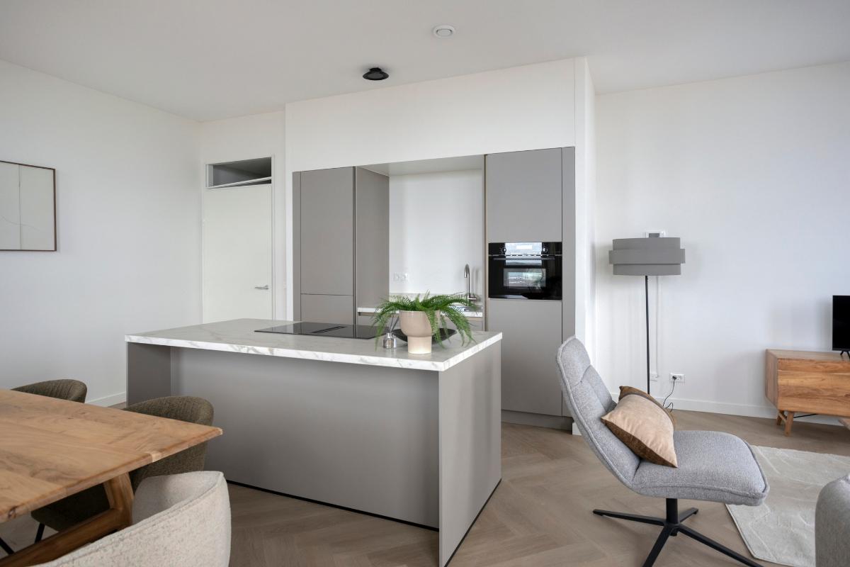 Indeling van het appartement: Op de 10e verdieping bevindt zich dit ruime hoekappartement, dat in 2025 volledig is gerenoveerd en gemoderniseerd. Bij binnenkomst via de entree kom je in een ruime hal met toegang tot een handige berging, het separate toilet, de twee slaapkamers, de badkamer en de woonkamer. De royale woonkamer met hoge plafonds (2,93 meter) is een echte blikvanger. Dankzij de vele grote ramen valt het daglicht rijkelijk naar binnen en geniet je van een vrij, licht en ruim uitzicht over de stad. De moderne open keuken vormt het hart van de woning. Deze is in 2025 geheel vernieuwd en uitgevoerd met een stijlvol kookeiland voorzien van een inductiekookplaat en geïntegreerde afzuiging. De strakke kasten, greeploze fronten en het lichte werkblad geven de keuken een tijdloze, luxe uitstraling. Dankzij de slimme indeling is er veel werk- en opbergruimte, terwijl de open opstelling zorgt voor een natuurlijke verbinding met de eet- en zithoek. De badkamer is eveneens vernieuwd en uitgevoerd met een dubbele wastafel, een inloopdouche, toilet en modern tegelwerk. Het tweede toilet is separaat en in dezelfde stijl afgewerkt. Het appartement beschikt over twee slaapkamers, beide met grote ramen en veel lichtinval. Tot slot is er een eigen berging in de onderbouw, ideaal voor het stallen van fietsen of het opbergen van spullen.
