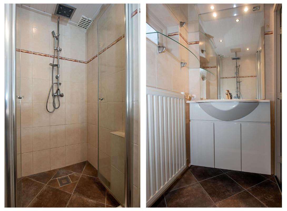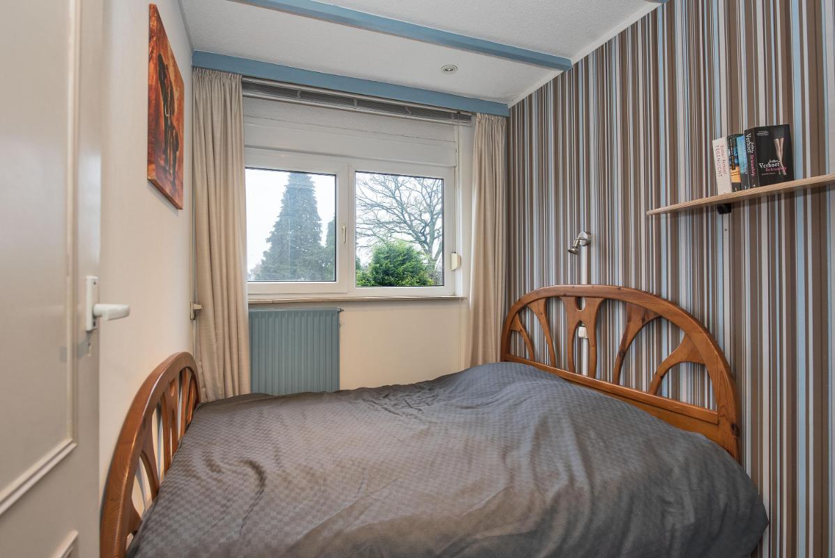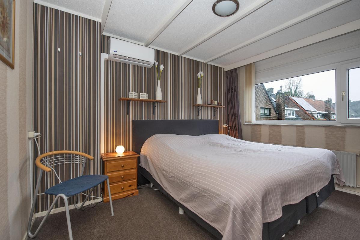 1e verdieping: Op de eerste verdieping liggen drie slaapkamers die elk beschikken over brede ramen en vaste kasten. De grootste kamer heeft twee ingebouwde kasten en biedt volop ruimte voor een comfortabele indeling. De overige kamers kunnen naar wens worden ingericht als slaap- werk- of hobbykamer. De badkamer is afgewerkt met een combinatie van donkere vloertegels en lichte wanden met een stijlvol accent. De inloopdouche is uitgerust met een regendouche en handdouche. Het wasmeubel heeft praktische kastruimte en een royale spiegel. Dankzij het aanwezige raam blijft de ruimte fris en goed te ventileren.