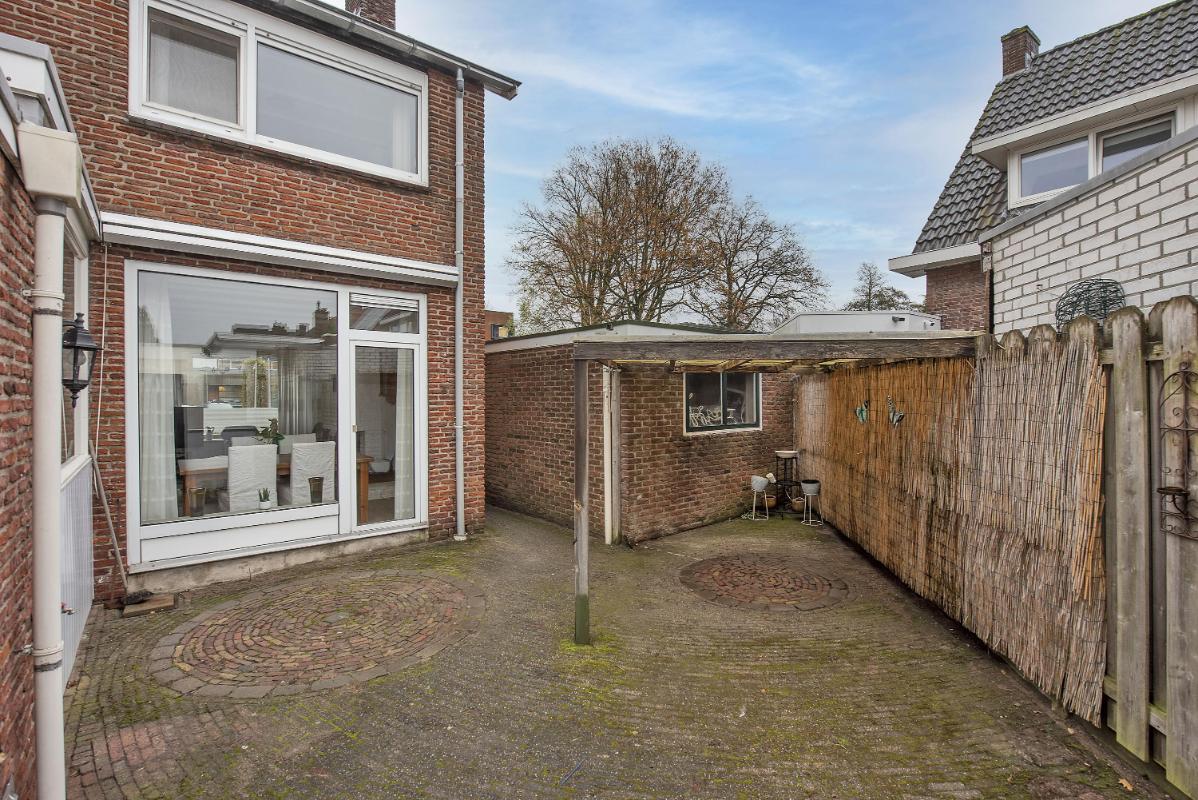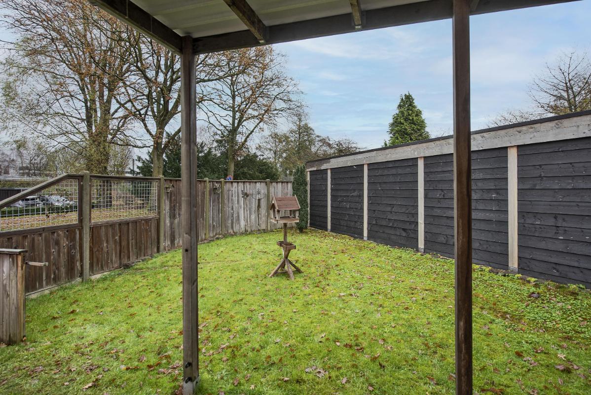 Tuin: De voortuin is onderhoudsvriendelijk aangelegd, afgezet met een laag hek en heeft een pad dat leidt naar de voordeur. Aan de voorzijde beschikt de woning over een eigen oprit met ruime garage. In de tuin staan twee overkappingen die zorgen voor schaduwrijke zitplekken of plek voor extra beschutting. Een groot deel van de tuin is betegeld en heeft een patroon met cirkelvormige accenten die een speelse uitstraling geven. Daarnaast ligt er in de punt van de tuin een verzorgd gazon. Door de verschillende hoeken is de tuin naar eigen wensen in te richten en ontstaan er verrassende mogelijkheden.