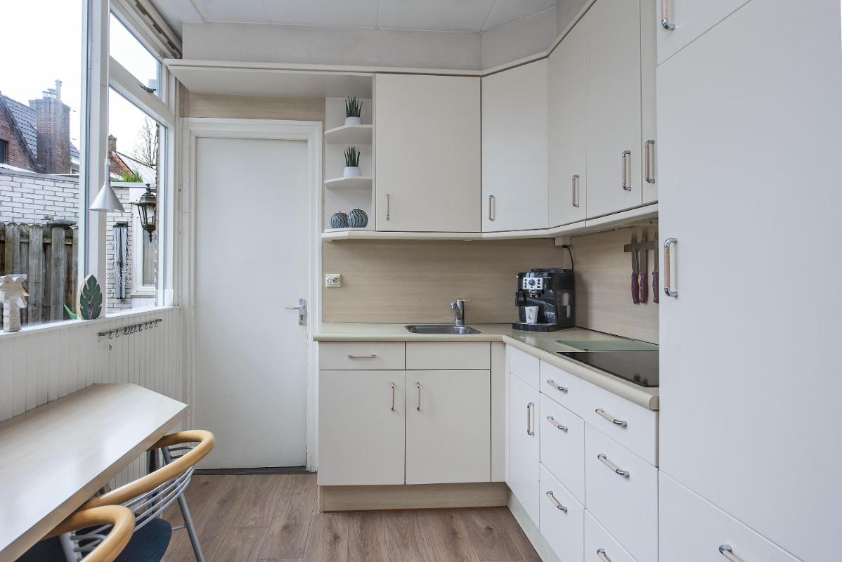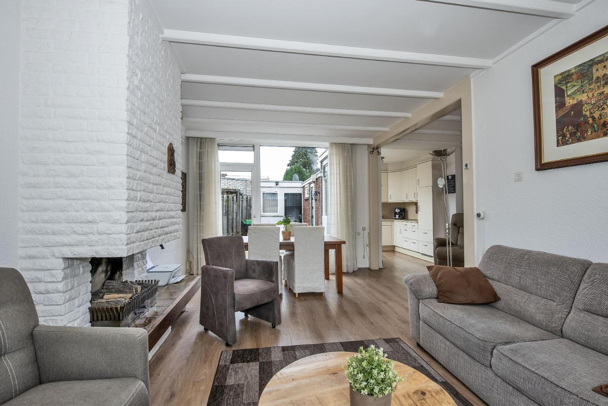 Begane grond: Onder de gezellige luifel met dakpannen is de voordeur. Bij binnenkomst sta je in een lichte hal met toegang tot de woonkamer, het toilet en de trap naar de eerste verdieping. De lange living ademt ruimte en de open haard vormt een warm middelpunt. Grote ramen zorgen voor natuurlijk licht en zicht op zowel de voor als achterkant van het huis. Er is ruimte voor een royale zithoek en een eettafel. De woonkamer loopt door in de open keuken. Deze is ingericht met een inductiekookplaat en een ingebouwde koelkast en beschikt over zowel boven als onder keukenkasten die praktische opbergruimte bieden. Tegenover de keuken bevindt zich een plek voor een smalle eettafel of bar tegen het raam. Achterin de keuken leidt een deur naar de bijkeuken. Dit extra kook- en werkdeel is uitgerust met een gasfornuis, combi oven en een wasbak met kraan. Hier is tevens plaats voor de wasmachine en droger, zodat alles netjes uit het zicht staat. Aan het huis op de begane grond bevindt zich een aparte berging die bereikbaar is via de achtertuin.