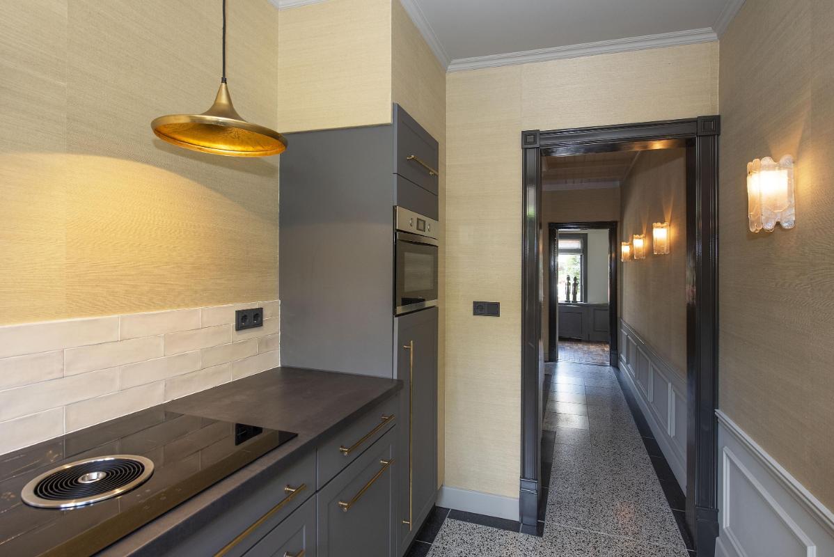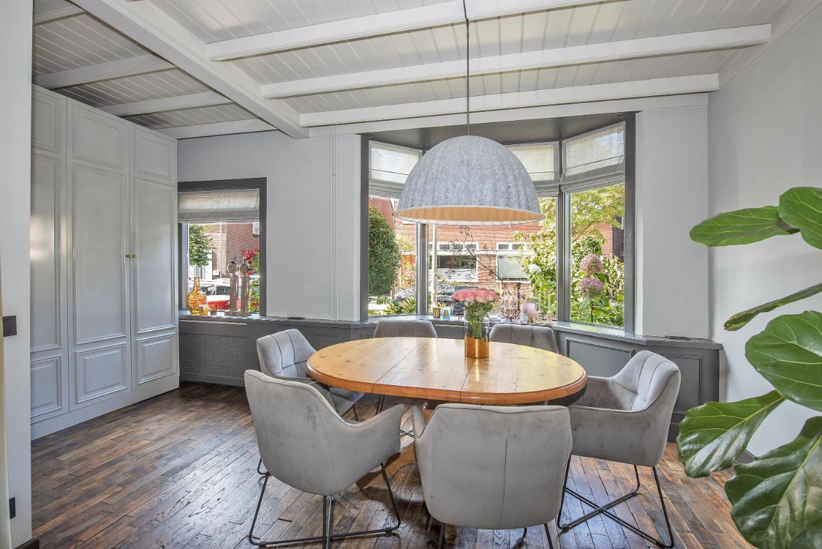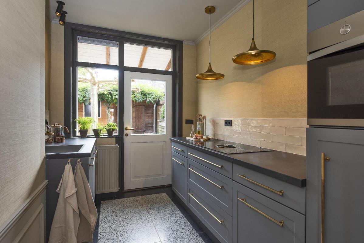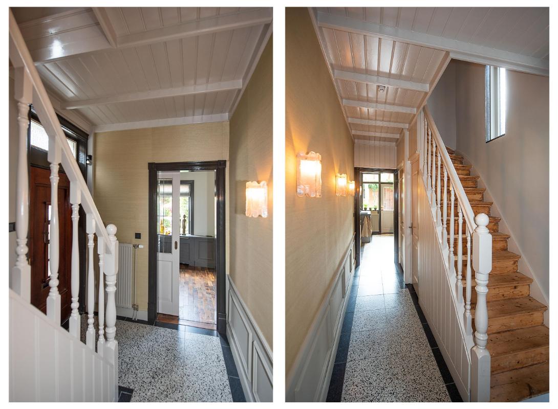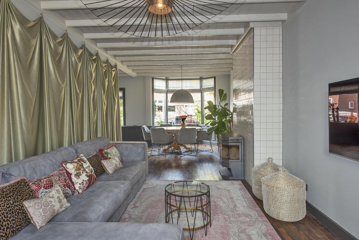 Begane grond: Via de overdekte entree kom je binnen in de woning en hier word je verwelkomd in een stijlvolle hal met klassieke details. De hal is afgewerkt met een mooie terrazzo vloer en een houten trap die naar de eerste verdieping leidt. Hier bevinden zich tevens de moderne toiletruimte en een handige trapkast voor extra bergruimte. Via een schuifdeur met glas-in-loodpanelen stap je de woonkamer binnen, een sfeervolle en verrassend ruime leefruimte met authentieke elementen. De karakteristieke houten vloer geeft de kamer een warme uitstraling, terwijl de grote ramen zorgen voor veel daglicht. Aan de voorzijde bij de erker bevindt zich een gezellige eethoek, met voldoende ruimte voor een royale eettafel. Het zitgedeelte aan de achterzijde nodigt uit tot ontspannen. De houtkachel vormt hier het knusse middelpunt van de kamer, terwijl de openslaande deuren met glas-in-lood bovenramen direct toegang geven tot de achtertuin. Langs de wand hangt een decoratief gordijn dat de ruimte een elegante sfeer geeft. De keuken bevindt zich aan de achterzijde en is modern afgewerkt. Met donkergrijze fronten, goudkleurige handgrepen, en subtiel glanzende wandtegels. De keuken is voorzien van moderne inbouwapparatuur, waaronder een inductiekookplaat met geïntegreerde afzuiging, een oven, vaatwasser, koelkast en een spoelbak met wandkraan. De keuken biedt daarnaast ook direct toegang tot de tuin via de achterdeur. De combinatie van stijl, functionaliteit en licht maakt dit een heerlijke plek om te koken en te genieten.