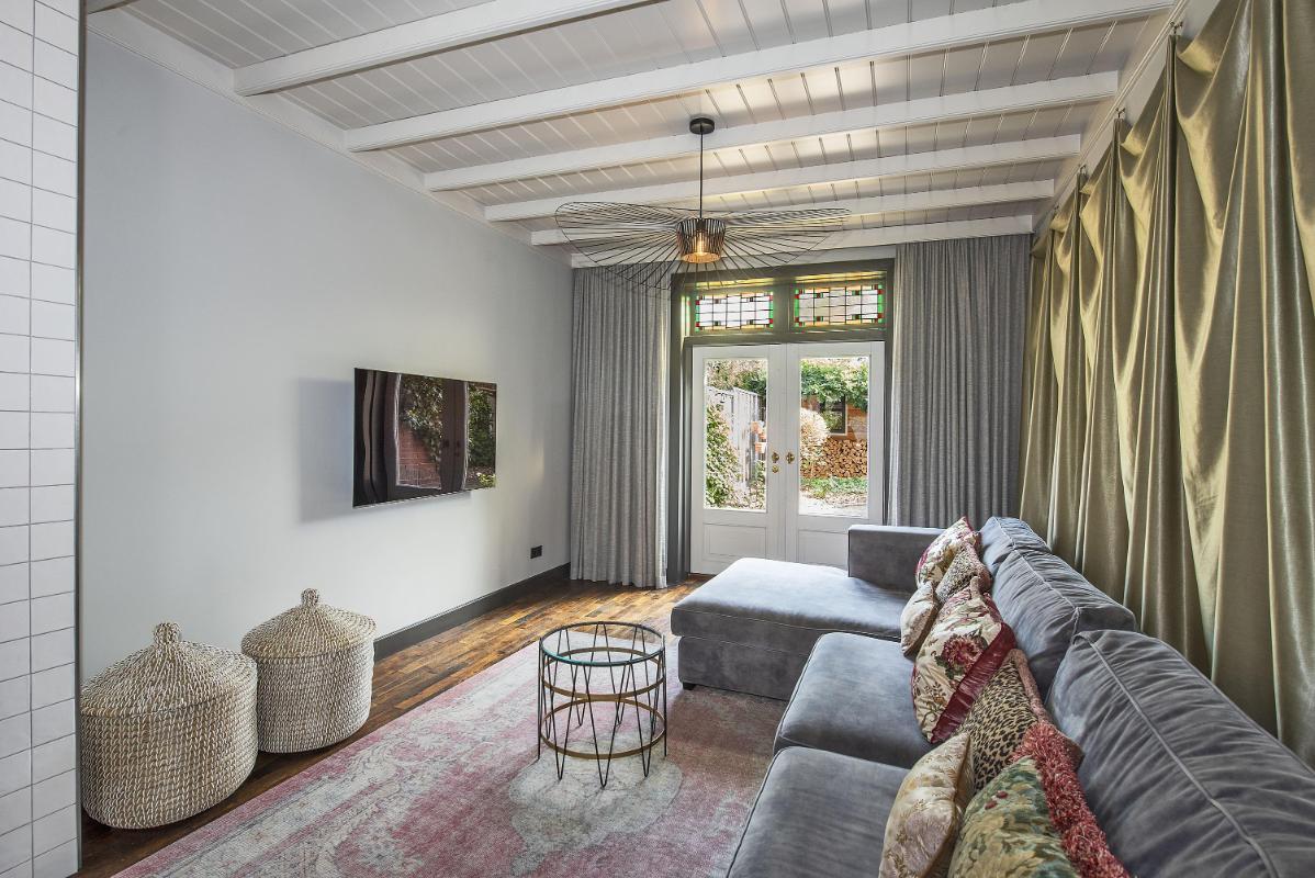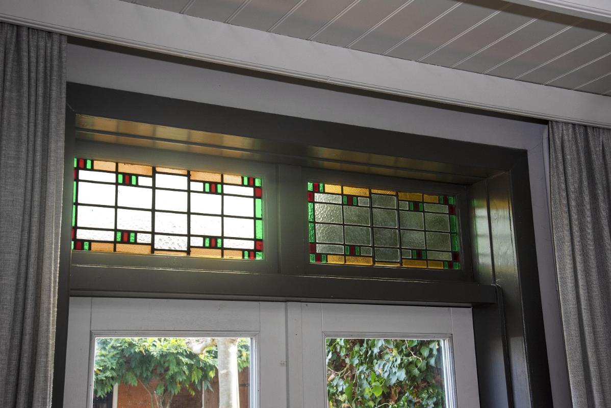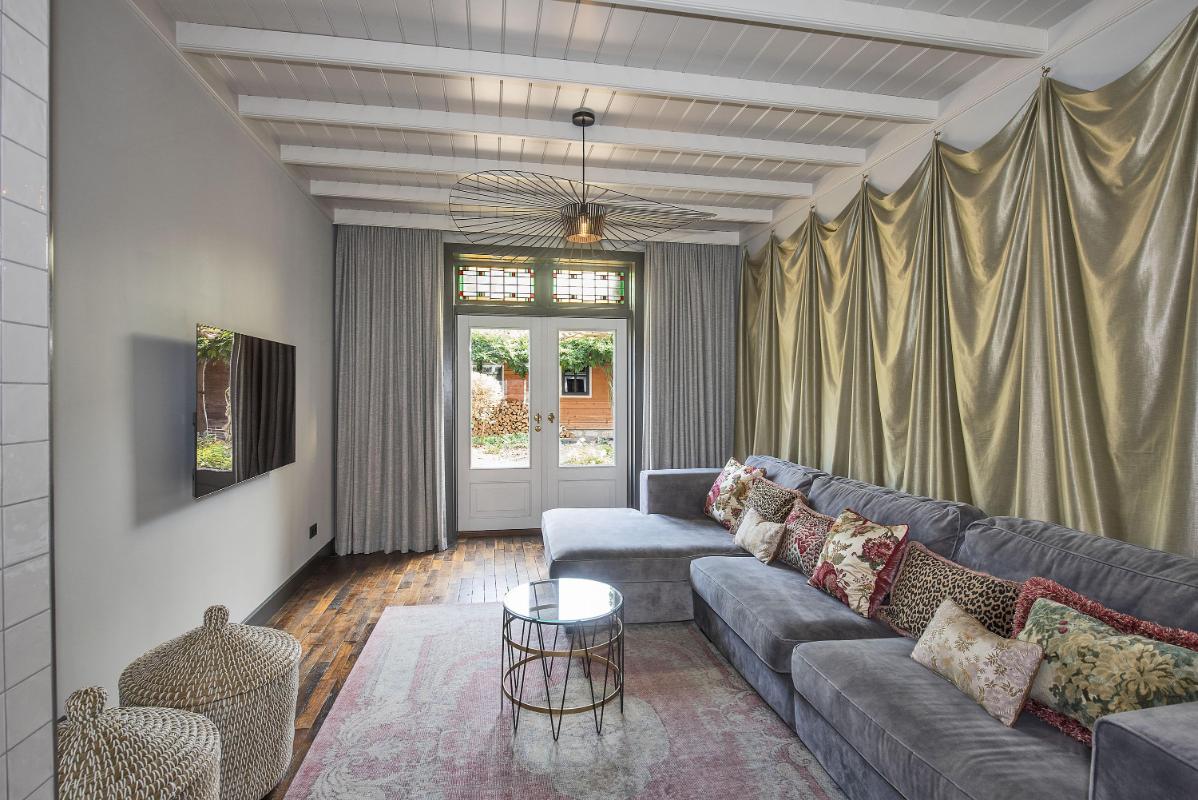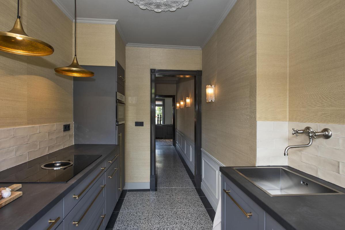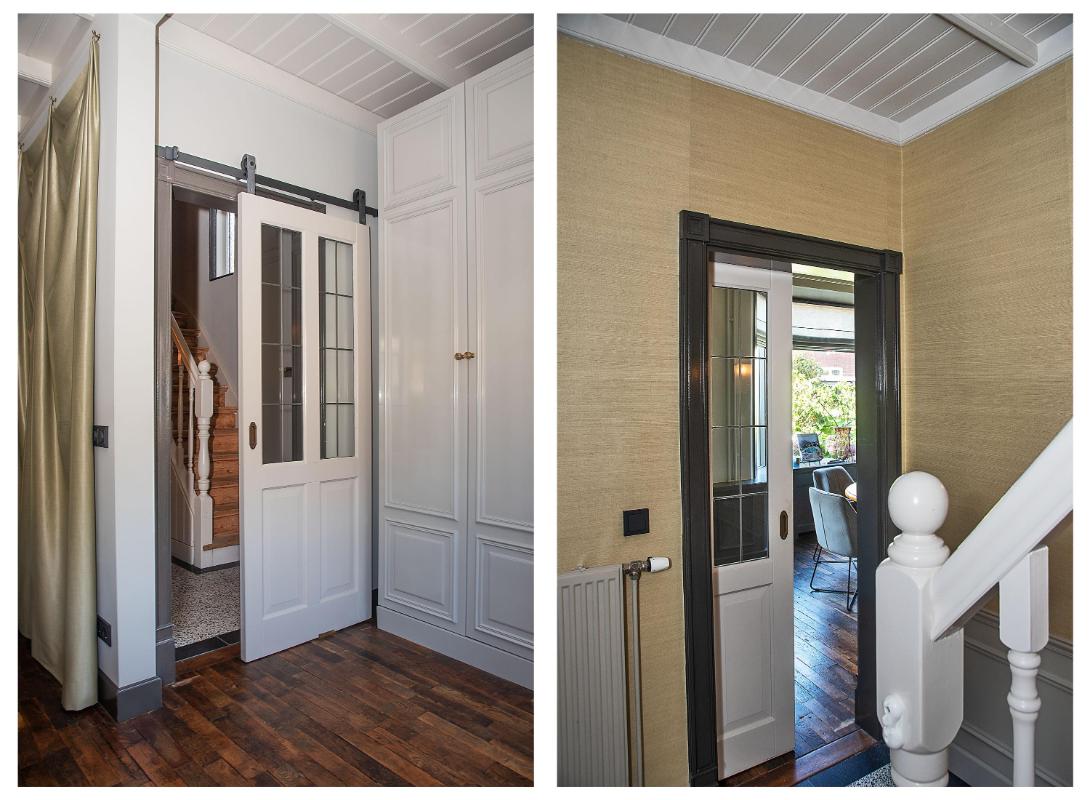 Begane grond: Via de overdekte entree kom je binnen in de woning en hier word je verwelkomd in een stijlvolle hal met klassieke details. De hal is afgewerkt met een mooie terrazzo vloer en een houten trap die naar de eerste verdieping leidt. Hier bevinden zich tevens de moderne toiletruimte en een handige trapkast voor extra bergruimte. Via een schuifdeur met glas-in-loodpanelen stap je de woonkamer binnen, een sfeervolle en verrassend ruime leefruimte met authentieke elementen. De karakteristieke houten vloer geeft de kamer een warme uitstraling, terwijl de grote ramen zorgen voor veel daglicht. Aan de voorzijde bij de erker bevindt zich een gezellige eethoek, met voldoende ruimte voor een royale eettafel. Het zitgedeelte aan de achterzijde nodigt uit tot ontspannen. De houtkachel vormt hier het knusse middelpunt van de kamer, terwijl de openslaande deuren met glas-in-lood bovenramen direct toegang geven tot de achtertuin. Langs de wand hangt een decoratief gordijn dat de ruimte een elegante sfeer geeft. De keuken bevindt zich aan de achterzijde en is modern afgewerkt. Met donkergrijze fronten, goudkleurige handgrepen, en subtiel glanzende wandtegels. De keuken is voorzien van moderne inbouwapparatuur, waaronder een inductiekookplaat met geïntegreerde afzuiging, een oven, vaatwasser, koelkast en een spoelbak met wandkraan. De keuken biedt daarnaast ook direct toegang tot de tuin via de achterdeur. De combinatie van stijl, functionaliteit en licht maakt dit een heerlijke plek om te koken en te genieten.
