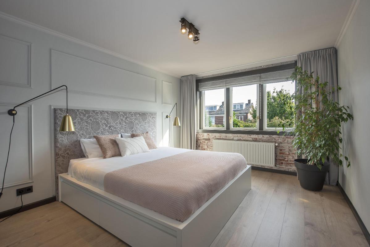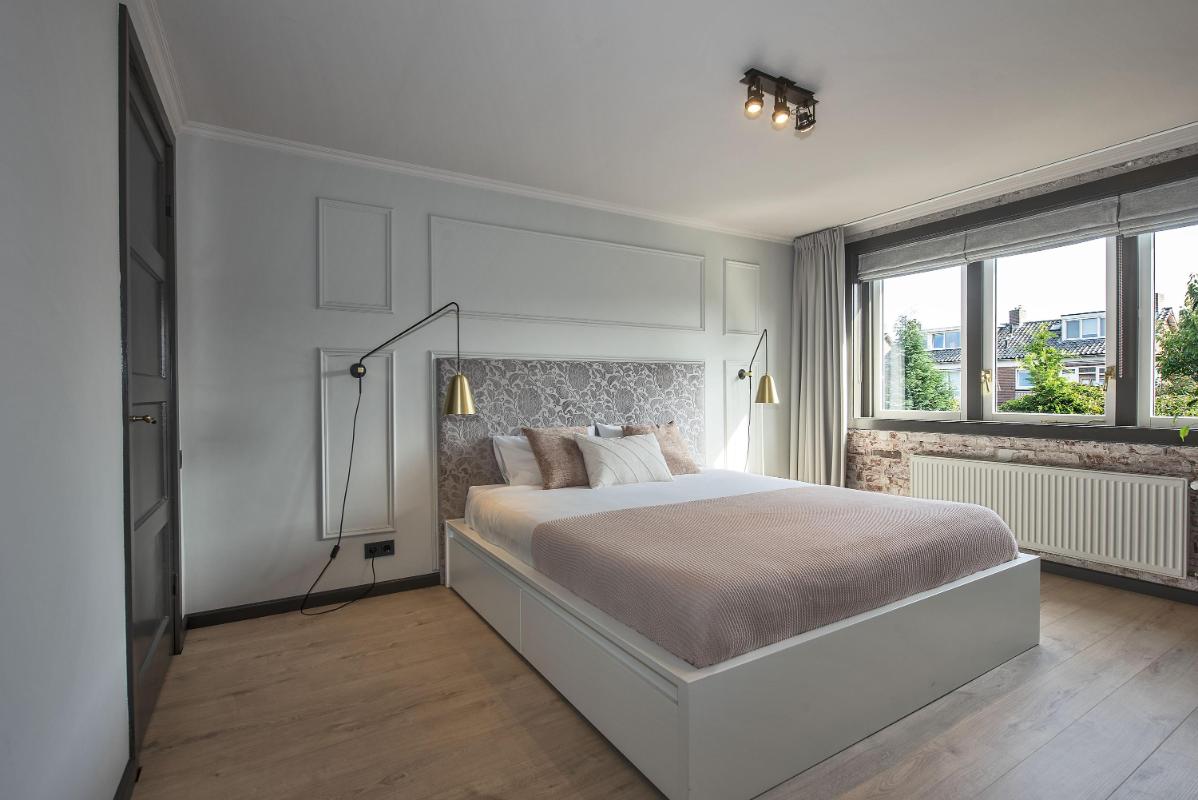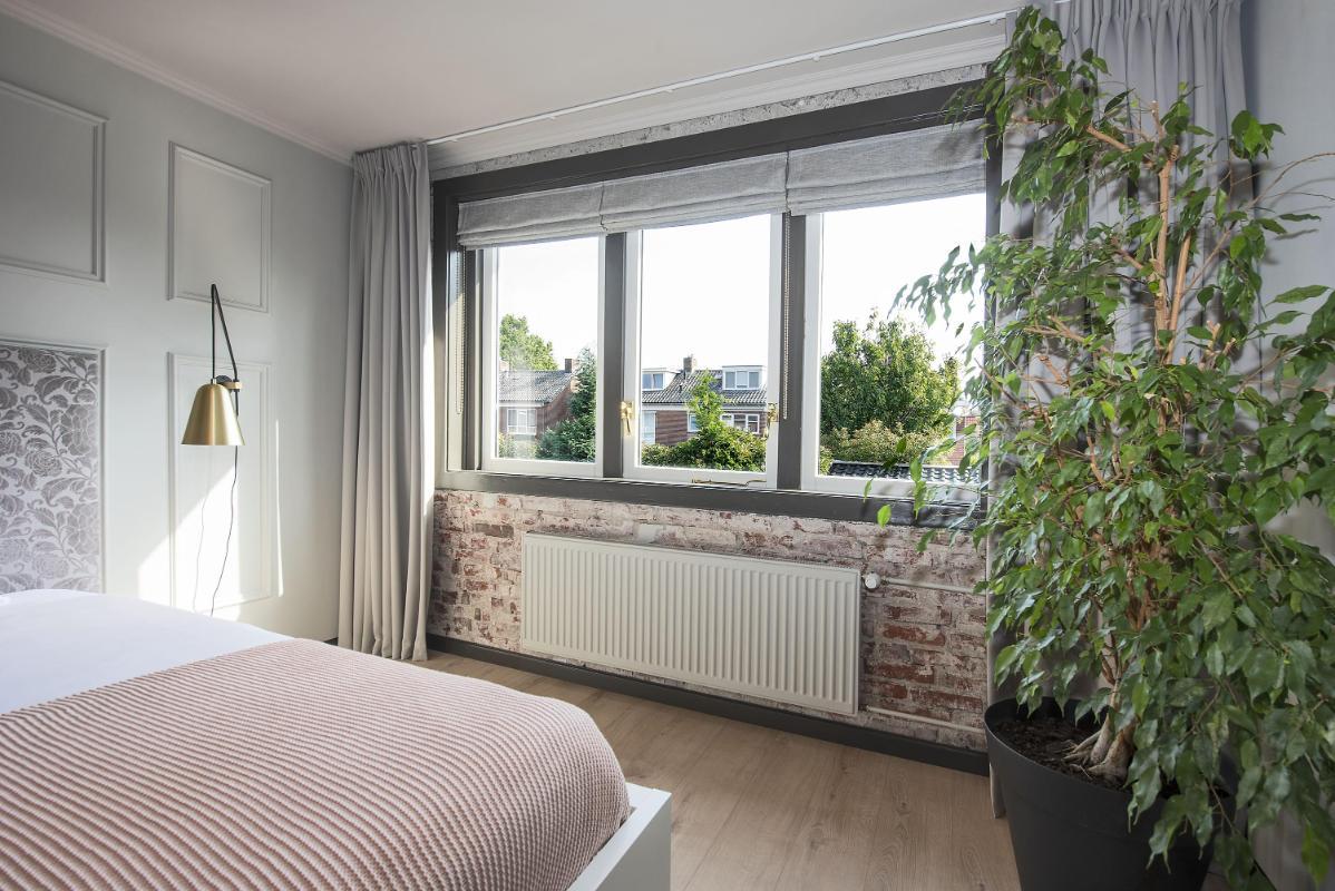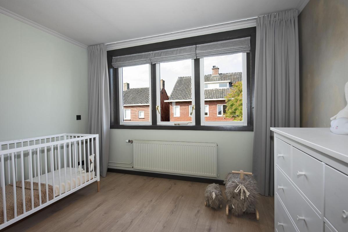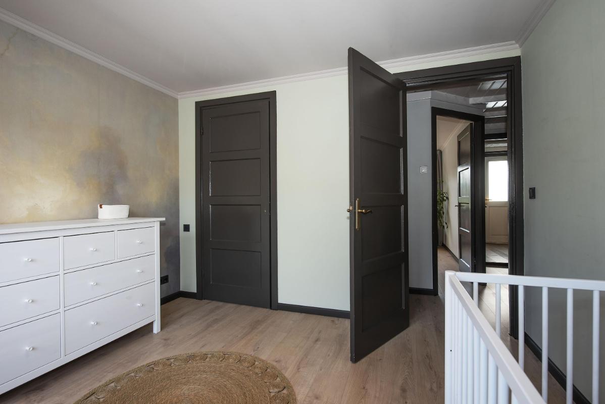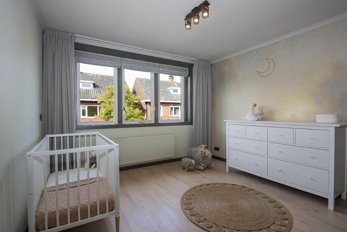 1e verdieping: Via de trap naar de eerste verdieping kom je uit op een lichte overloop met moderne, stijlvolle zwarte deuren. Vanuit hier zijn drie ruime slaapkamers en de badkamer bereikbaar. De grootste slaapkamer, gelegen aan de achterzijde, is een mooie ruimte met veel lichtinval dankzij de brede raampartij. De combinatie van subtiele sierlijsten en een accentwand van bakstenen geeft deze kamer een warme en karaktervolle uitstraling. Er is voldoende plek voor een groot bed en een royale kledingkast, en vanuit hier heb je uitzicht op de groene achtertuin. Aan de voorzijde bevinden zich twee extra slaapkamers. De eerste is momenteel ingericht als kinderkamer, met een zachte, rustige uitstraling en voldoende ruimte voor een bed, commode en opbergkast. De tweede kamer is in gebruik als kleedkamer maar kan ook als werkkamer ingericht worden en beschikt over vaste kastruimte. De badkamer is modern en instapklaar. De wanden zijn afgewerkt met natuursteenlook tegels in een warme grijstint en de houten elementen. De ruimte is voorzien van een inloopdouche met regendouche, wastafelmeubel met opbergruimte, zwevend toilet en designradiator. Een deur biedt direct toegang tot het balkon aan de achterzijde, ideaal om even een frisse neus te halen of even te genieten van de zon.