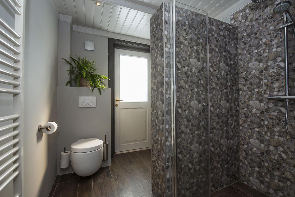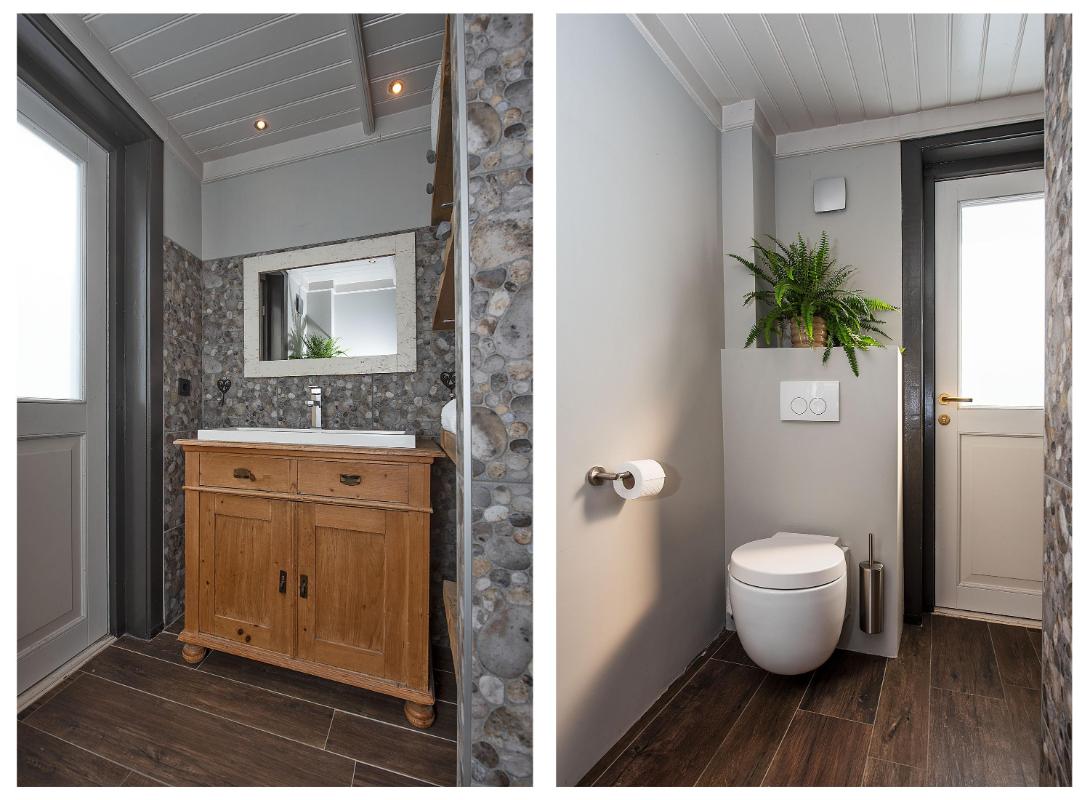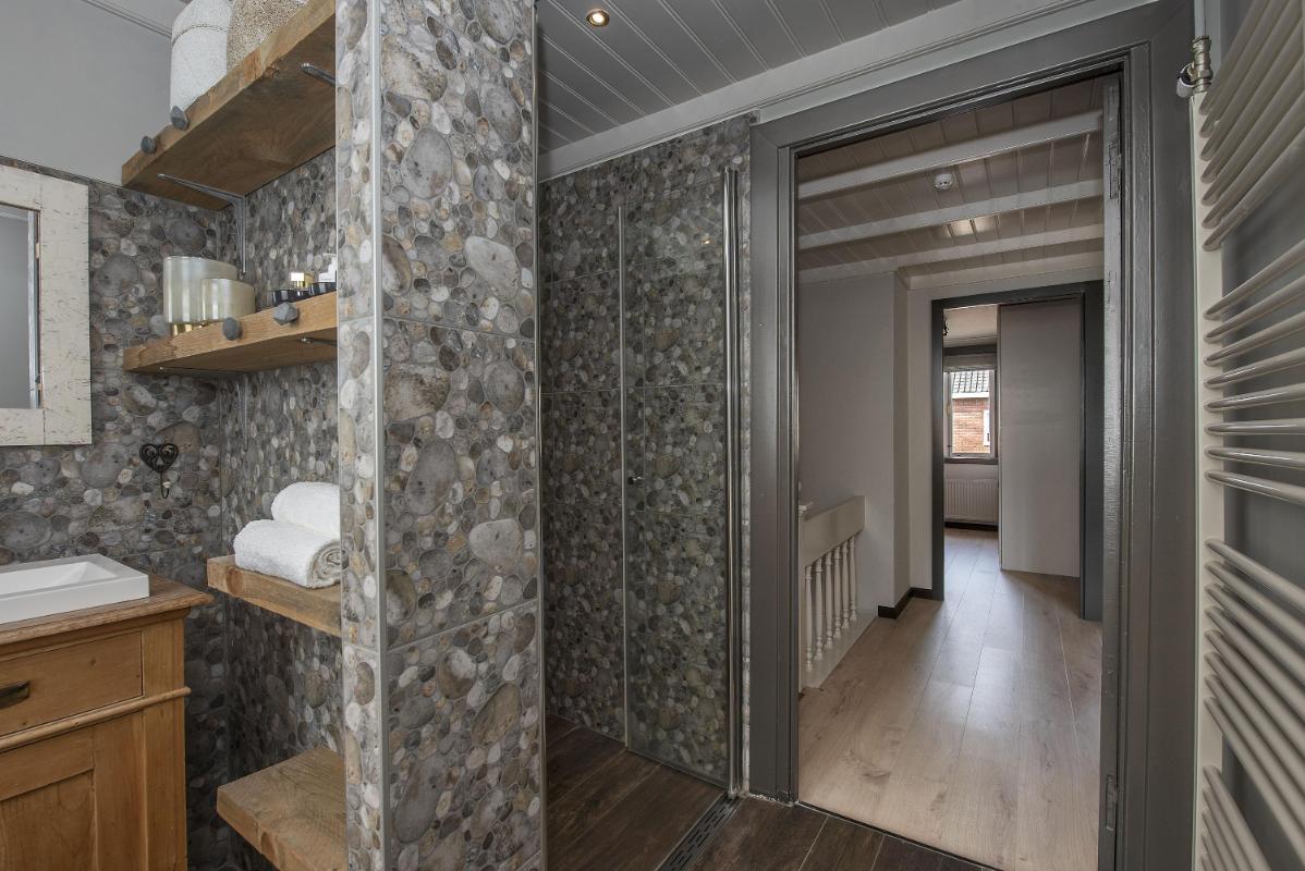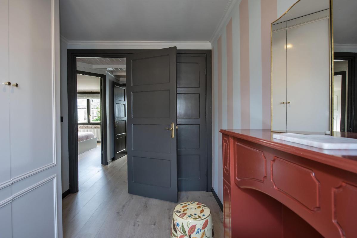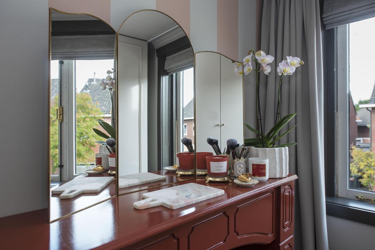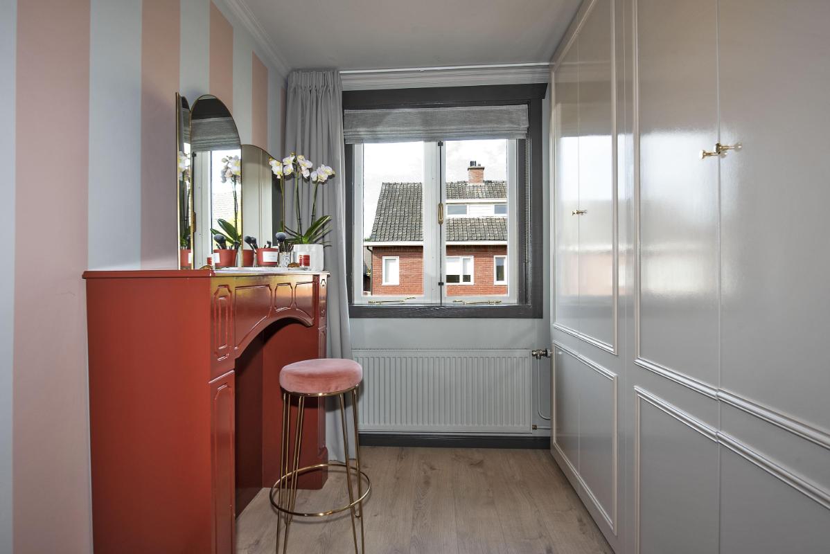 1e verdieping: Via de trap naar de eerste verdieping kom je uit op een lichte overloop met moderne, stijlvolle zwarte deuren. Vanuit hier zijn drie ruime slaapkamers en de badkamer bereikbaar. De grootste slaapkamer, gelegen aan de achterzijde, is een mooie ruimte met veel lichtinval dankzij de brede raampartij. De combinatie van subtiele sierlijsten en een accentwand van bakstenen geeft deze kamer een warme en karaktervolle uitstraling. Er is voldoende plek voor een groot bed en een royale kledingkast, en vanuit hier heb je uitzicht op de groene achtertuin. Aan de voorzijde bevinden zich twee extra slaapkamers. De eerste is momenteel ingericht als kinderkamer, met een zachte, rustige uitstraling en voldoende ruimte voor een bed, commode en opbergkast. De tweede kamer is in gebruik als kleedkamer maar kan ook als werkkamer ingericht worden en beschikt over vaste kastruimte. De badkamer is modern en instapklaar. De wanden zijn afgewerkt met natuursteenlook tegels in een warme grijstint en de houten elementen. De ruimte is voorzien van een inloopdouche met regendouche, wastafelmeubel met opbergruimte, zwevend toilet en designradiator. Een deur biedt direct toegang tot het balkon aan de achterzijde, ideaal om even een frisse neus te halen of even te genieten van de zon.