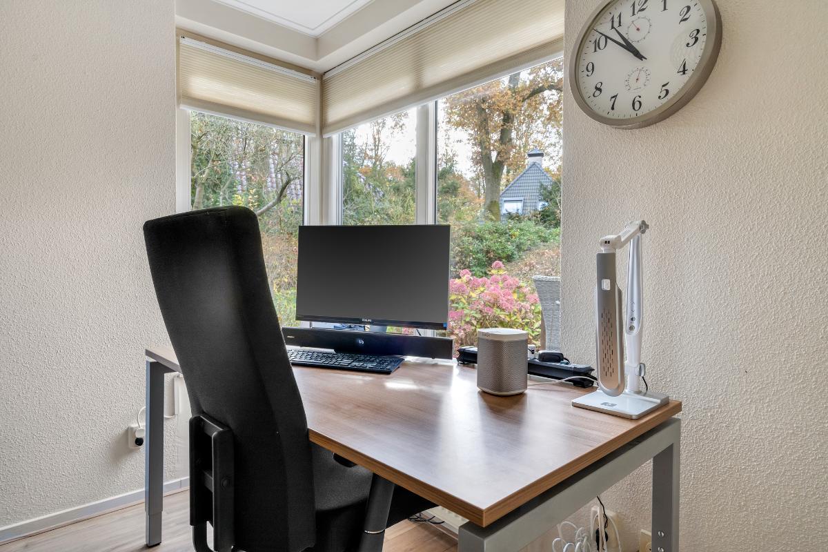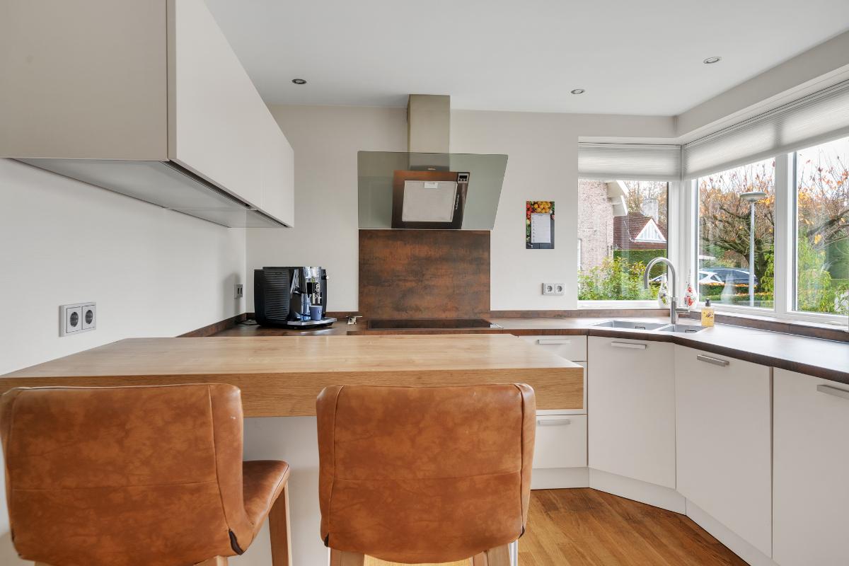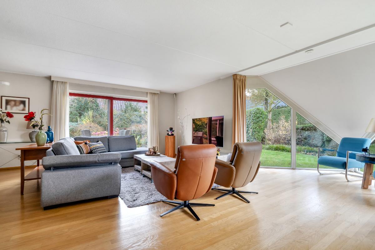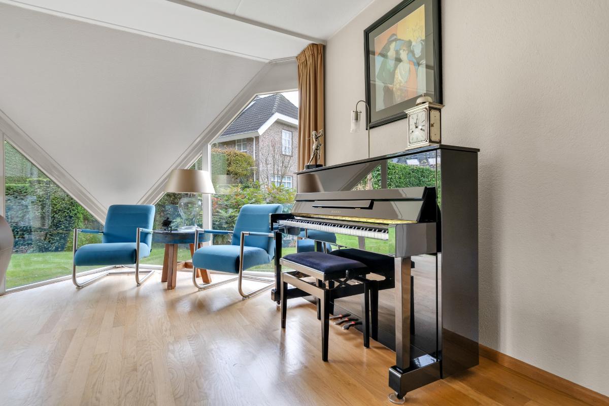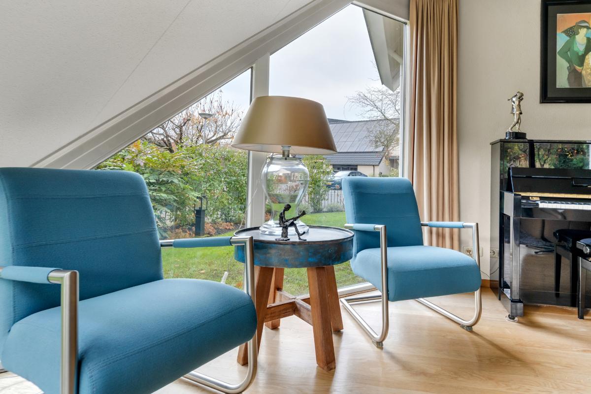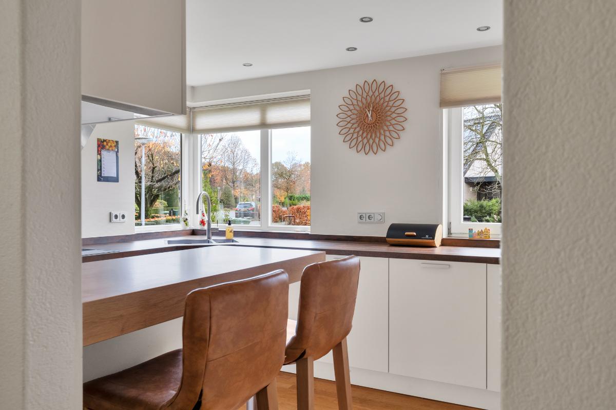 Begane grond: Nog voordat je binnen bent, ervaar je al hoe vriendelijk en toegankelijk het huis aanvoelt. De ruim opgezette wijk draagt daaraan bij, maar ook het perceel straalt rust en welkom uit. De brede oprit, waar je drie auto’s kwijt kunt, leidt je naar de overdekte entree. Onder de overkapping vind je aan één zijde de houten deuren van de garage en aan de andere kant de voordeur. Achter de grote houten garagedeuren schuilt een verrassend diepe ruimte waar fietsen, gereedschap en zelfs een auto hun plek vinden, en waar je bovendien toegang hebt tot de woning en de achtertuin. Maar voor nu nodigen we je uit om de woning te betreden via de voordeur. Eenmaal binnen valt de parketvloer op, die doorloopt over vrijwel de hele begane grond. Dit maakt het warme welkom meteen compleet. Het toilet in de hal, met raam, is modern uitgevoerd. Fraaie zandkleurige betegeling tot aan het plafond en fris wit sanitair met mooie ronde vormen zorgen voor een tijdloos en rustig geheel. Een deur met glas, recht tegenover de voordeur, laat het daglicht van de woonkamer alvast naar je toe glijden en geeft een subtiele hint van wat er nog komt. Dus stap maar gauw binnen. Hier opent de woonkamer zich volledig. Grote raampartijen links en recht vooruit reiken van vloer tot plafond en laten de tuin als een levend schilderij naar binnen komen. De ruimte is royaal, vriendelijk en verrassend flexibel in te delen. Links in de woonkamer is een grote, relaxte zithoek gerealiseerd, waar de schuifpui de grens tussen binnen en buiten bijna laat verdwijnen. Rechtdoor is een erker, speels van vorm, met schuine lijnen, waar het licht vanuit meerdere kanten naar binnen valt. Het is een plek die iets met je doet en waar je alle kanten mee op kunt: een extra zithoek voor je koffiemoment, een leeshoek of de speelhoek voor de kinderen. Of kies ervoor om hier de eettafel neer te zetten, de keuze is aan jou. Aan de linkerzijde van de woonkamer ligt een afsluitbare, ruime kamer, met ook hier grote raampartijen. Door het vele licht en de rustige ligging in huis kun je met deze ruimte werkelijk alle kanten op: werken, studeren, spelen of creëren. Tevens is er via deze ruimte een binnendoorgang naar de aangrenzende berging. Aan de rechterkant van de woonkamer, aan de straatzijde, is de halfopen keuken, tijdloos en tegelijk heerlijk praktisch. De U-opstelling biedt alle werkruimte die je je kunt wensen, terwijl de vier ramen zorgen voor een open en lichte sfeer. De combinatie van witte fronten, rvs-details, een houtlook werkblad en de verhoogde bar maken het beleving van de keuken compleet. Het is zo’n keuken waar aan opbergruimte en aanrechtblad geen gebrek is, waar de moderne apparatuur, waaronder ook de Quooker, ervoor zorgt dat functionaliteit en gemak samenkomen. Direct naast de keuken ligt de praktische bijkeuken met aansluitingen voor wasmachine en droger, waardoor het dagelijkse leven hier moeiteloos georganiseerd voelt.
