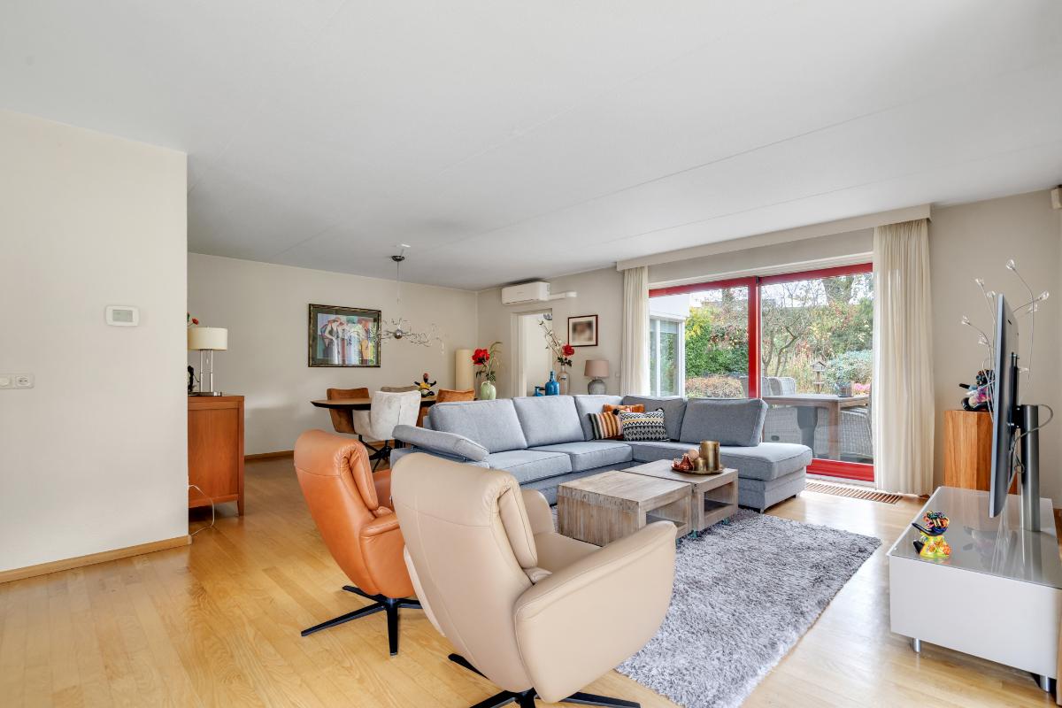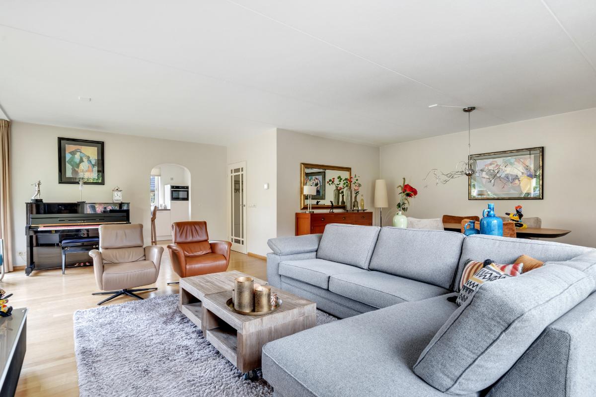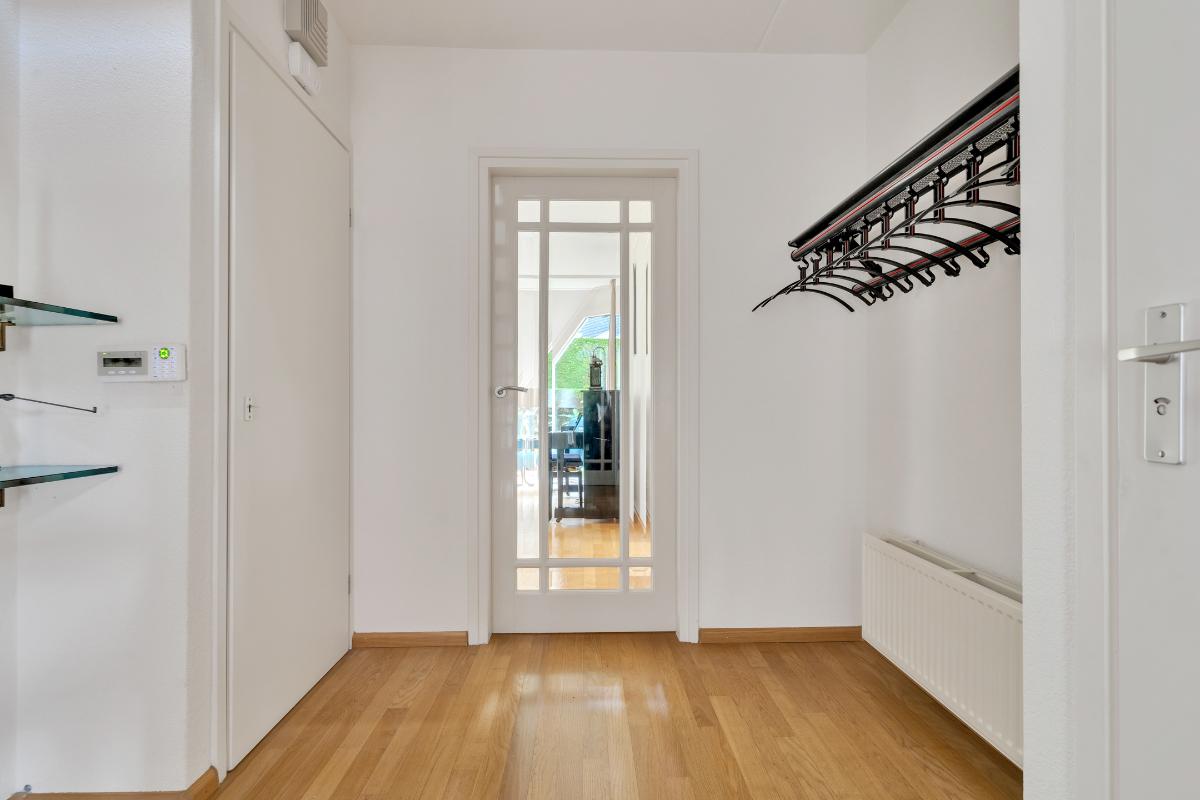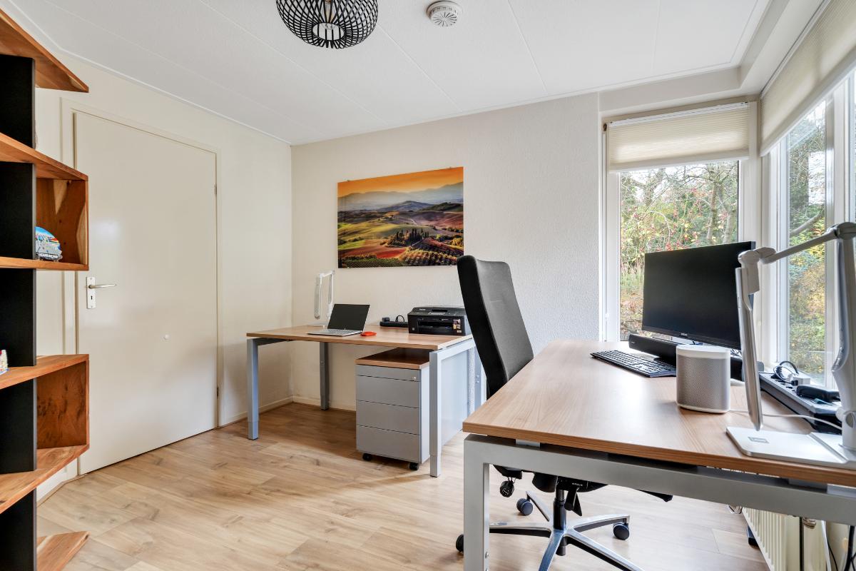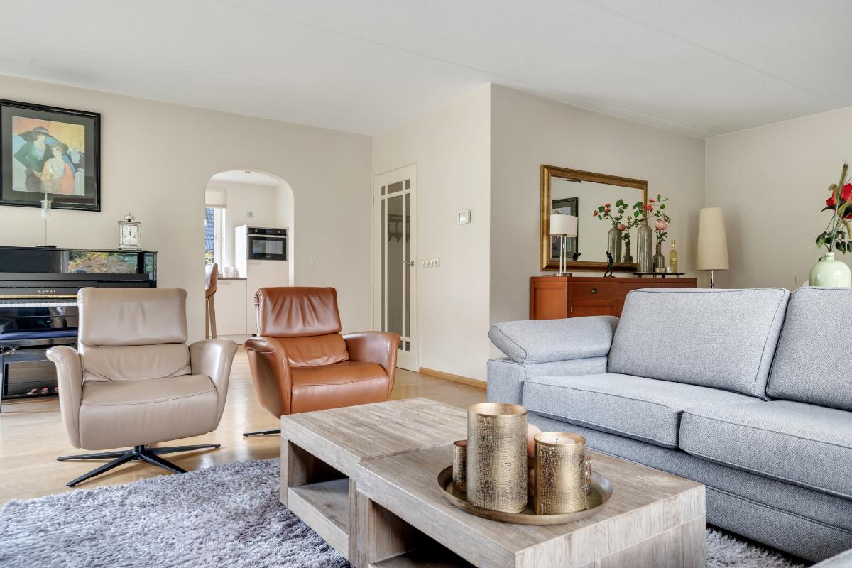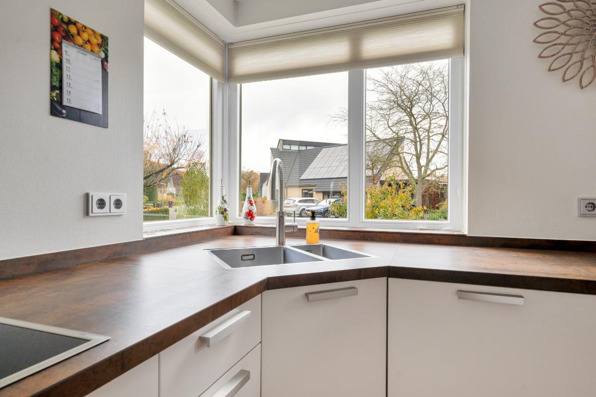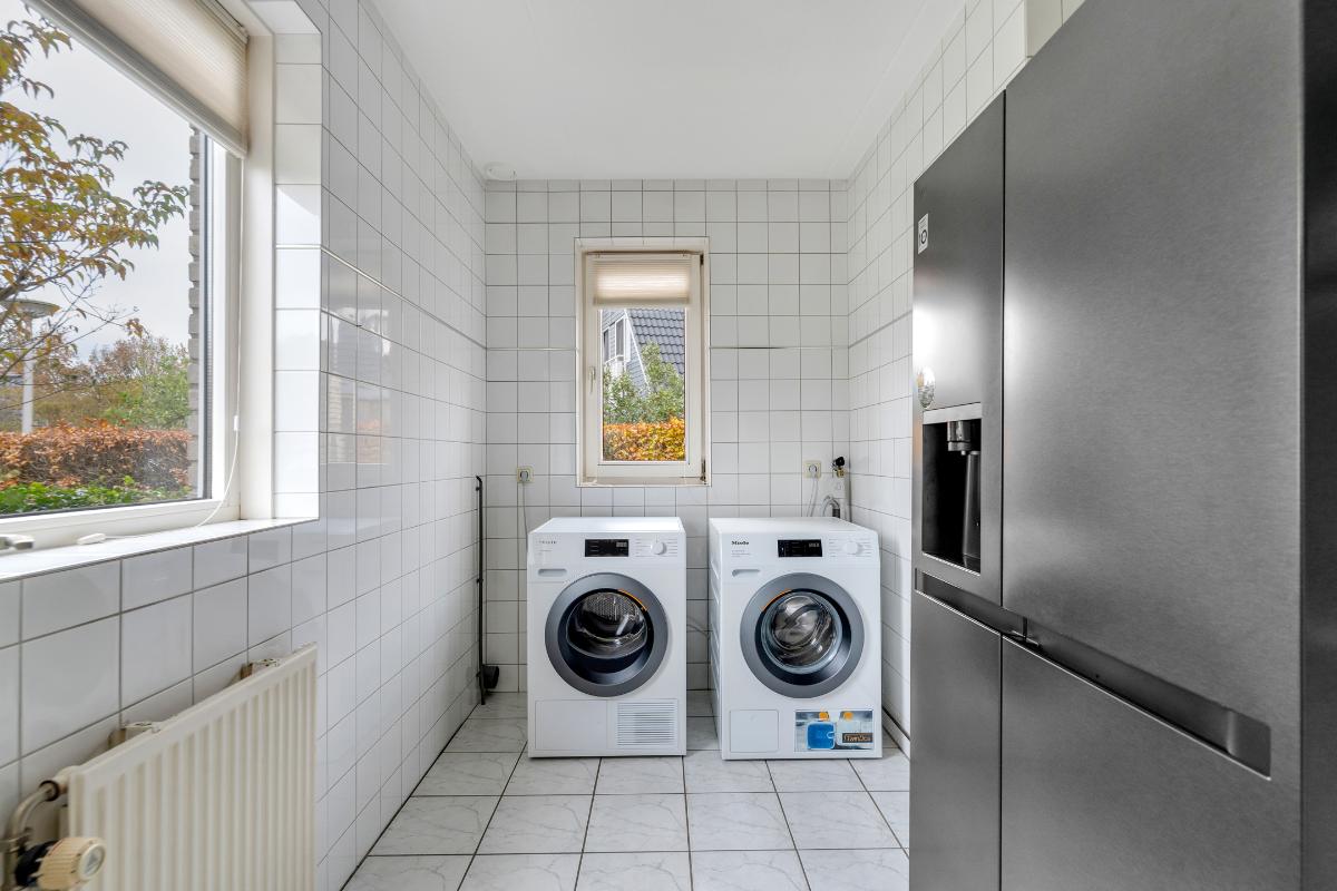 Begane grond: Nog voordat je binnen bent, ervaar je al hoe vriendelijk en toegankelijk het huis aanvoelt. De ruim opgezette wijk draagt daaraan bij, maar ook het perceel straalt rust en welkom uit. De brede oprit, waar je drie auto’s kwijt kunt, leidt je naar de overdekte entree. Onder de overkapping vind je aan één zijde de houten deuren van de garage en aan de andere kant de voordeur. Achter de grote houten garagedeuren schuilt een verrassend diepe ruimte waar fietsen, gereedschap en zelfs een auto hun plek vinden, en waar je bovendien toegang hebt tot de woning en de achtertuin. Maar voor nu nodigen we je uit om de woning te betreden via de voordeur. Eenmaal binnen valt de parketvloer op, die doorloopt over vrijwel de hele begane grond. Dit maakt het warme welkom meteen compleet. Het toilet in de hal, met raam, is modern uitgevoerd. Fraaie zandkleurige betegeling tot aan het plafond en fris wit sanitair met mooie ronde vormen zorgen voor een tijdloos en rustig geheel. Een deur met glas, recht tegenover de voordeur, laat het daglicht van de woonkamer alvast naar je toe glijden en geeft een subtiele hint van wat er nog komt. Dus stap maar gauw binnen. Hier opent de woonkamer zich volledig. Grote raampartijen links en recht vooruit reiken van vloer tot plafond en laten de tuin als een levend schilderij naar binnen komen. De ruimte is royaal, vriendelijk en verrassend flexibel in te delen. Links in de woonkamer is een grote, relaxte zithoek gerealiseerd, waar de schuifpui de grens tussen binnen en buiten bijna laat verdwijnen. Rechtdoor is een erker, speels van vorm, met schuine lijnen, waar het licht vanuit meerdere kanten naar binnen valt. Het is een plek die iets met je doet en waar je alle kanten mee op kunt: een extra zithoek voor je koffiemoment, een leeshoek of de speelhoek voor de kinderen. Of kies ervoor om hier de eettafel neer te zetten, de keuze is aan jou. Aan de linkerzijde van de woonkamer ligt een afsluitbare, ruime kamer, met ook hier grote raampartijen. Door het vele licht en de rustige ligging in huis kun je met deze ruimte werkelijk alle kanten op: werken, studeren, spelen of creëren. Tevens is er via deze ruimte een binnendoorgang naar de aangrenzende berging. Aan de rechterkant van de woonkamer, aan de straatzijde, is de halfopen keuken, tijdloos en tegelijk heerlijk praktisch. De U-opstelling biedt alle werkruimte die je je kunt wensen, terwijl de vier ramen zorgen voor een open en lichte sfeer. De combinatie van witte fronten, rvs-details, een houtlook werkblad en de verhoogde bar maken het beleving van de keuken compleet. Het is zo’n keuken waar aan opbergruimte en aanrechtblad geen gebrek is, waar de moderne apparatuur, waaronder ook de Quooker, ervoor zorgt dat functionaliteit en gemak samenkomen. Direct naast de keuken ligt de praktische bijkeuken met aansluitingen voor wasmachine en droger, waardoor het dagelijkse leven hier moeiteloos georganiseerd voelt.
