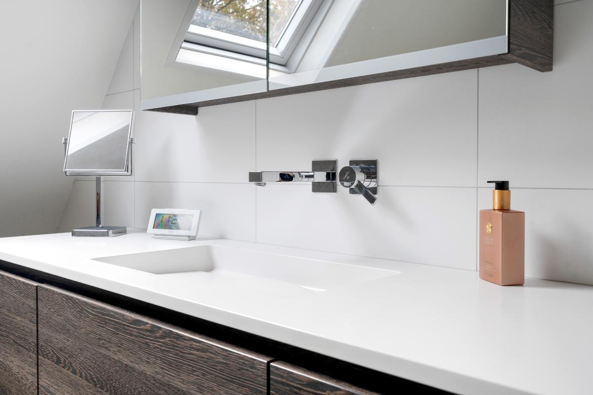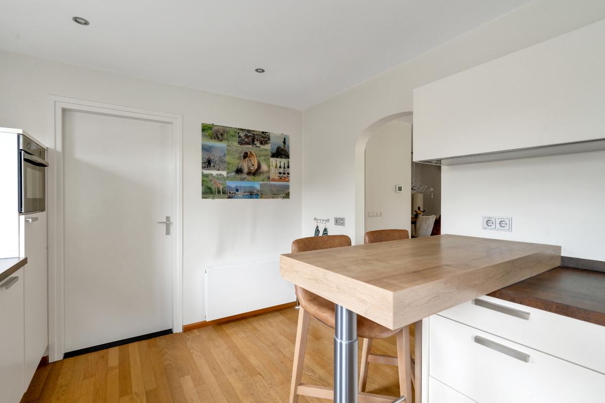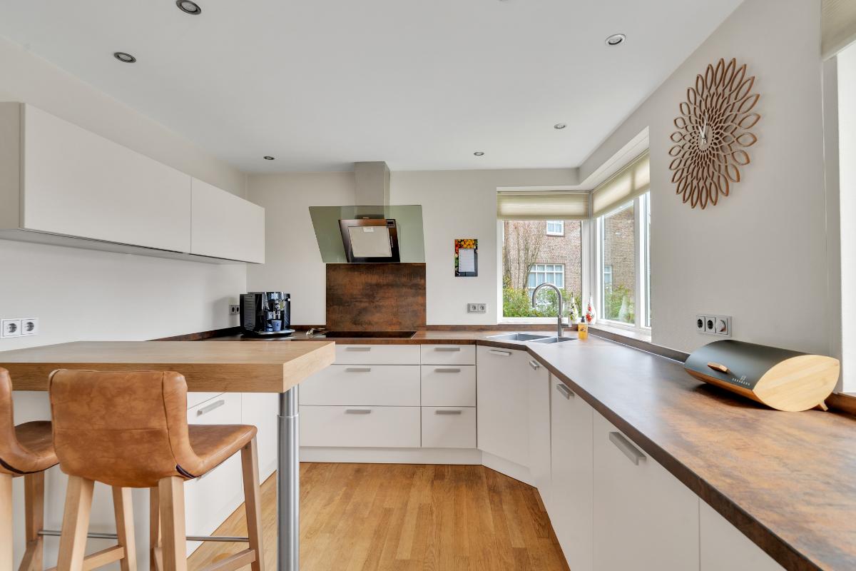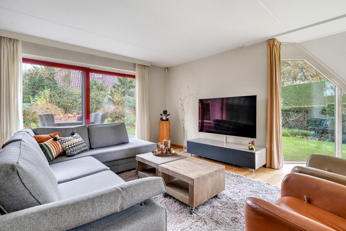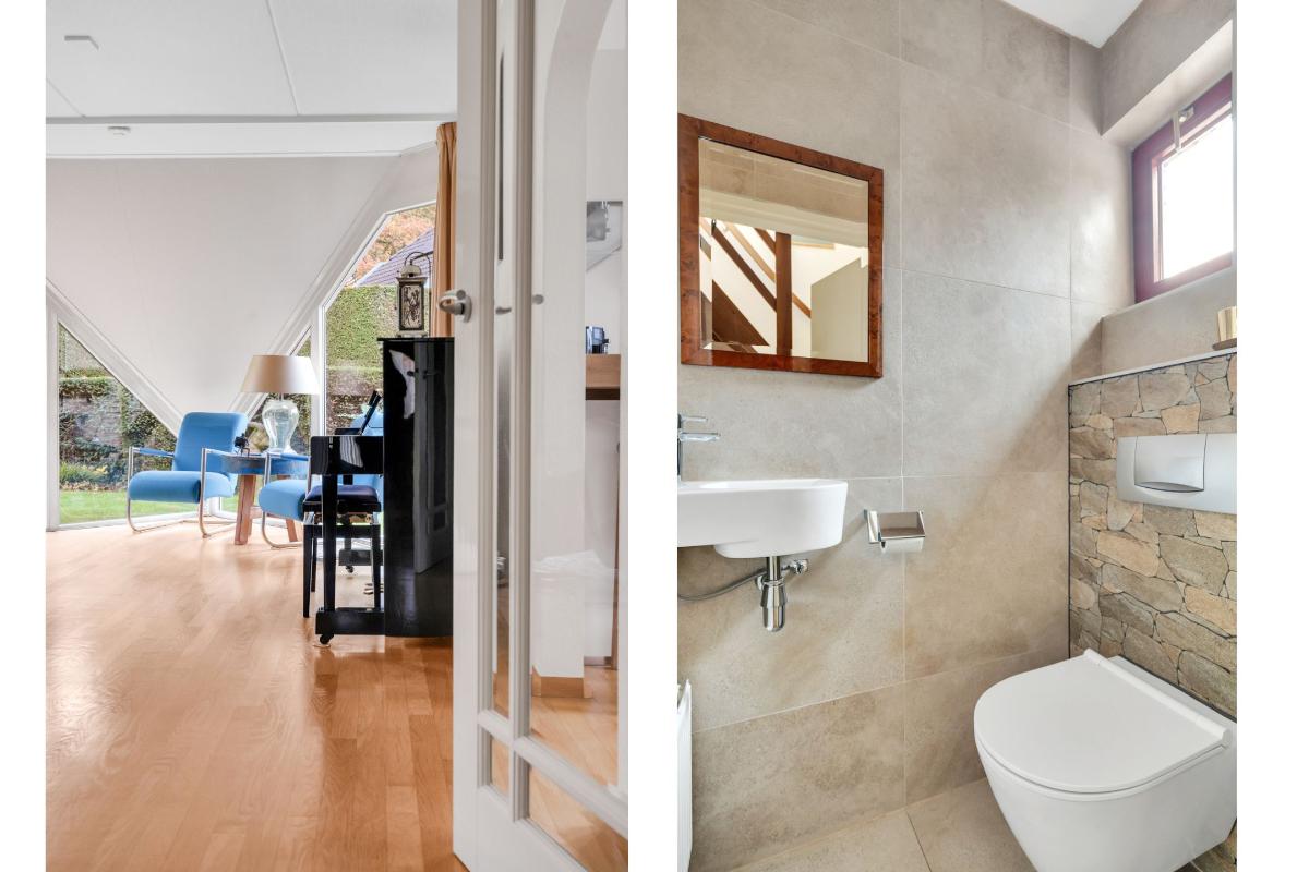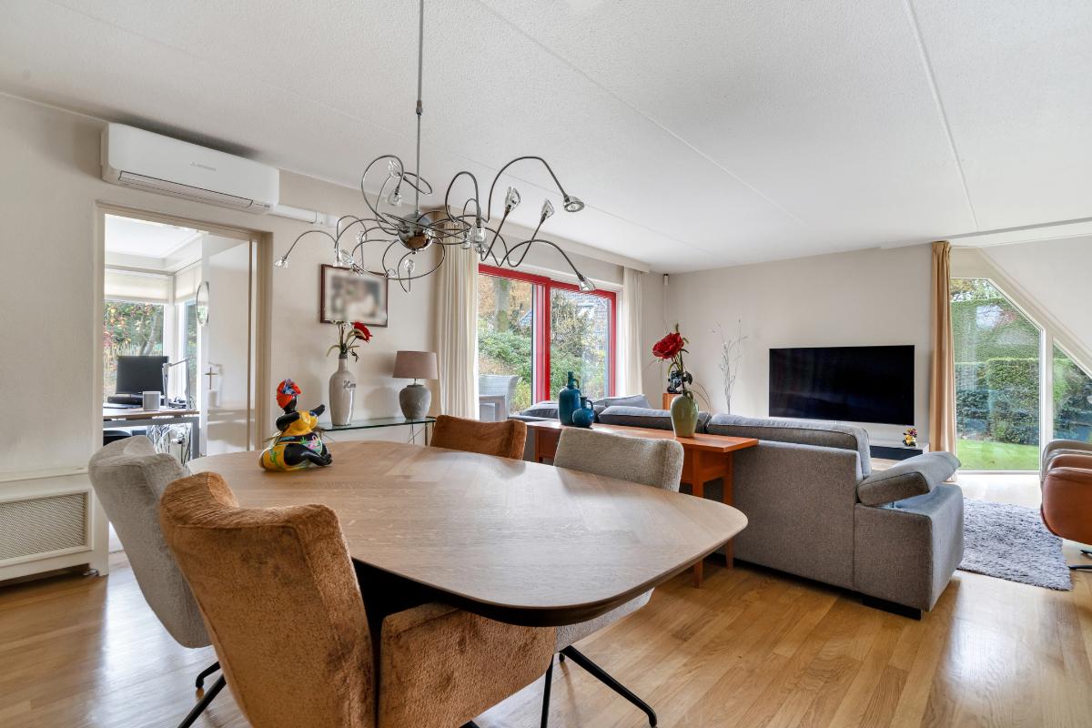 Begane grond: Nog voordat je binnen bent, ervaar je al hoe vriendelijk en toegankelijk het huis aanvoelt. De ruim opgezette wijk draagt daaraan bij, maar ook het perceel straalt rust en welkom uit. De brede oprit, waar je drie auto’s kwijt kunt, leidt je naar de overdekte entree. Onder de overkapping vind je aan één zijde de houten deuren van de garage en aan de andere kant de voordeur. Achter de grote houten garagedeuren schuilt een verrassend diepe ruimte waar fietsen, gereedschap en zelfs een auto hun plek vinden, en waar je bovendien toegang hebt tot de woning en de achtertuin. Maar voor nu nodigen we je uit om de woning te betreden via de voordeur. Eenmaal binnen valt de parketvloer op, die doorloopt over vrijwel de hele begane grond. Dit maakt het warme welkom meteen compleet. Het toilet in de hal, met raam, is modern uitgevoerd. Fraaie zandkleurige betegeling tot aan het plafond en fris wit sanitair met mooie ronde vormen zorgen voor een tijdloos en rustig geheel. Een deur met glas, recht tegenover de voordeur, laat het daglicht van de woonkamer alvast naar je toe glijden en geeft een subtiele hint van wat er nog komt. Dus stap maar gauw binnen. Hier opent de woonkamer zich volledig. Grote raampartijen links en recht vooruit reiken van vloer tot plafond en laten de tuin als een levend schilderij naar binnen komen. De ruimte is royaal, vriendelijk en verrassend flexibel in te delen. Links in de woonkamer is een grote, relaxte zithoek gerealiseerd, waar de schuifpui de grens tussen binnen en buiten bijna laat verdwijnen. Rechtdoor is een erker, speels van vorm, met schuine lijnen, waar het licht vanuit meerdere kanten naar binnen valt. Het is een plek die iets met je doet en waar je alle kanten mee op kunt: een extra zithoek voor je koffiemoment, een leeshoek of de speelhoek voor de kinderen. Of kies ervoor om hier de eettafel neer te zetten, de keuze is aan jou. Aan de linkerzijde van de woonkamer ligt een afsluitbare, ruime kamer, met ook hier grote raampartijen. Door het vele licht en de rustige ligging in huis kun je met deze ruimte werkelijk alle kanten op: werken, studeren, spelen of creëren. Tevens is er via deze ruimte een binnendoorgang naar de aangrenzende berging. Aan de rechterkant van de woonkamer, aan de straatzijde, is de halfopen keuken, tijdloos en tegelijk heerlijk praktisch. De U-opstelling biedt alle werkruimte die je je kunt wensen, terwijl de vier ramen zorgen voor een open en lichte sfeer. De combinatie van witte fronten, rvs-details, een houtlook werkblad en de verhoogde bar maken het beleving van de keuken compleet. Het is zo’n keuken waar aan opbergruimte en aanrechtblad geen gebrek is, waar de moderne apparatuur, waaronder ook de Quooker, ervoor zorgt dat functionaliteit en gemak samenkomen. Direct naast de keuken ligt de praktische bijkeuken met aansluitingen voor wasmachine en droger, waardoor het dagelijkse leven hier moeiteloos georganiseerd voelt.