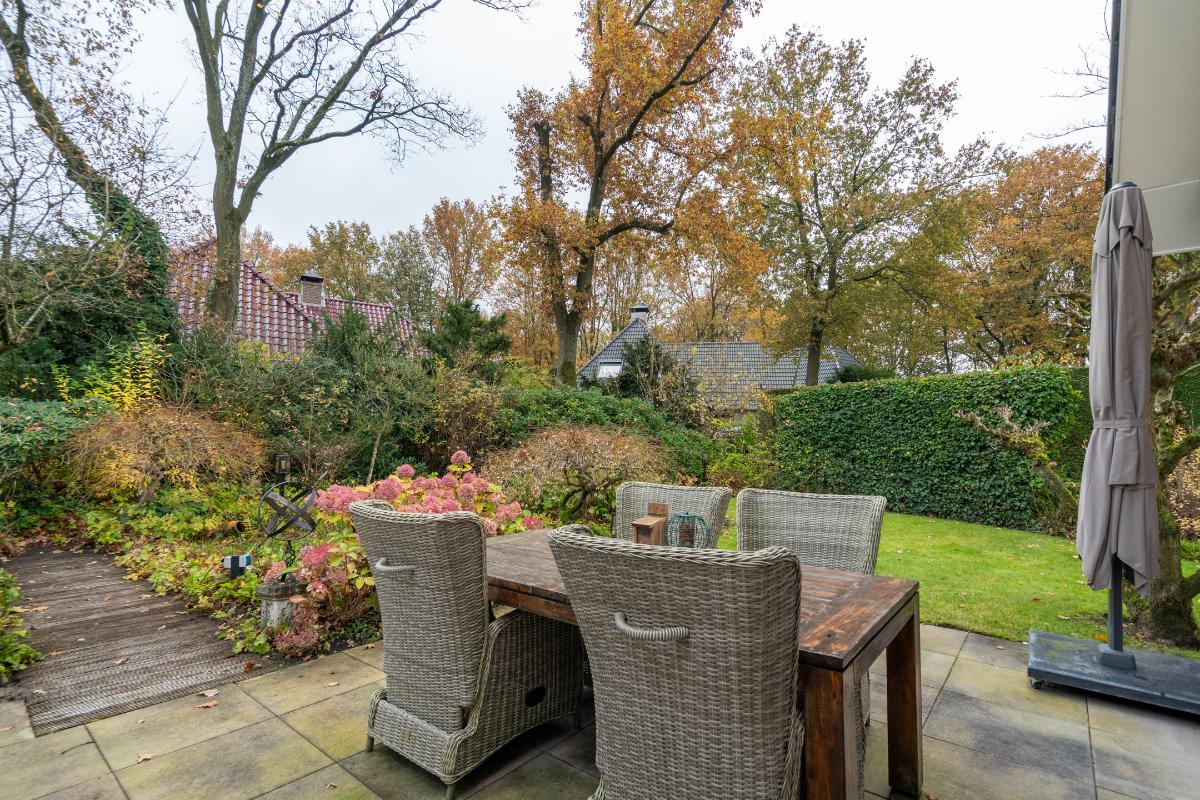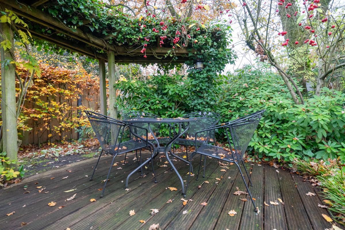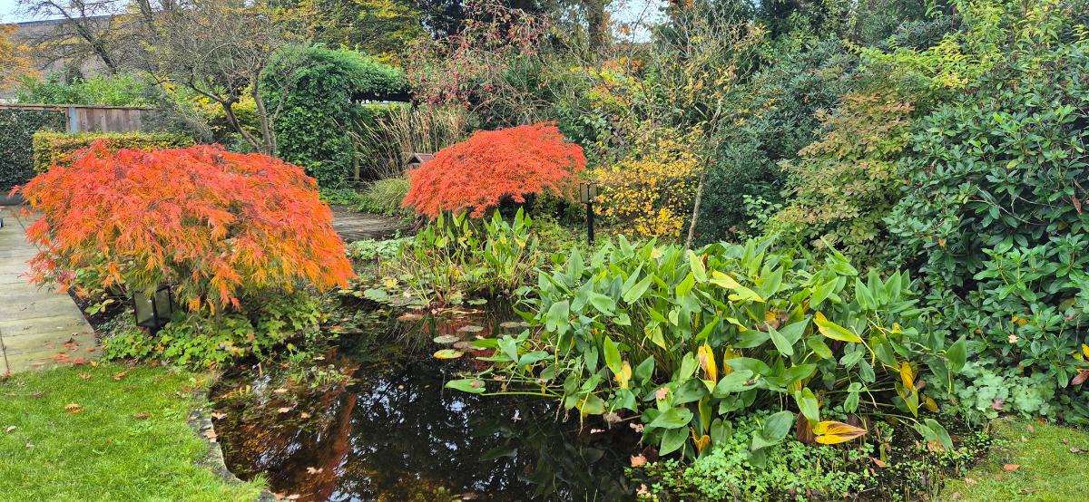 Tuin: De tuin is een wereld op zichzelf. Hij omringt de woning aan drie zijden, waardoor je op elk moment van de dag jouw perfecte plekje vindt: zonovergoten, rustig, verscholen of heerlijk vrij. Het groen is weelderig zonder te overheersen, alsof je door een klein stukje park loopt met prachtige zichtlijnen en zorgvuldig geplaatste planten en struiken. Blikvanger in de tuin is de grote vijver met houten vlonders rondom. Het is die plek waar je vanzelf rustig wordt, waar je even blijft staan of gaat zitten om te kijken, te luisteren en te ademen. De lage hekwerken geven de tuin een open, vriendelijke uitstraling, terwijl de ligging op de kavel juist veel privacy biedt, een ideale combinatie.