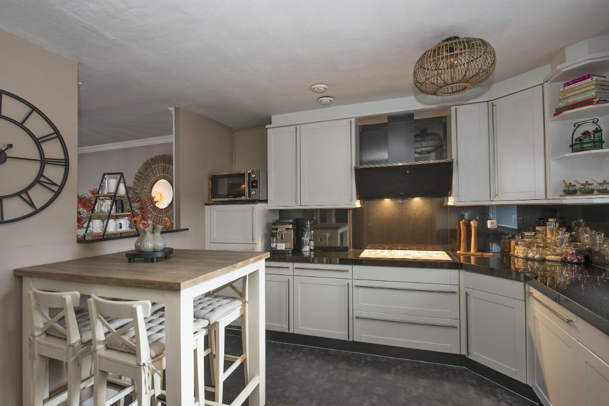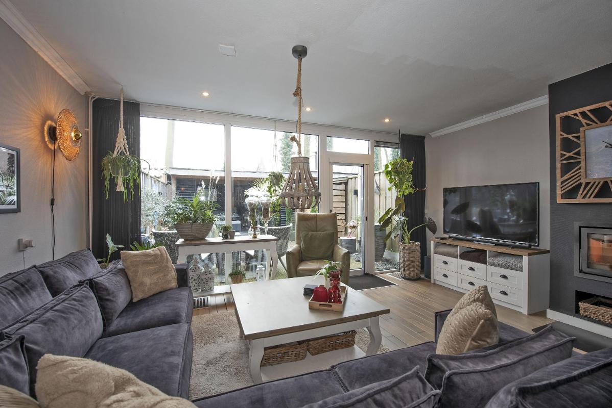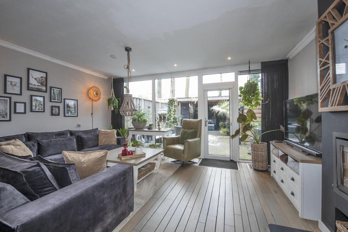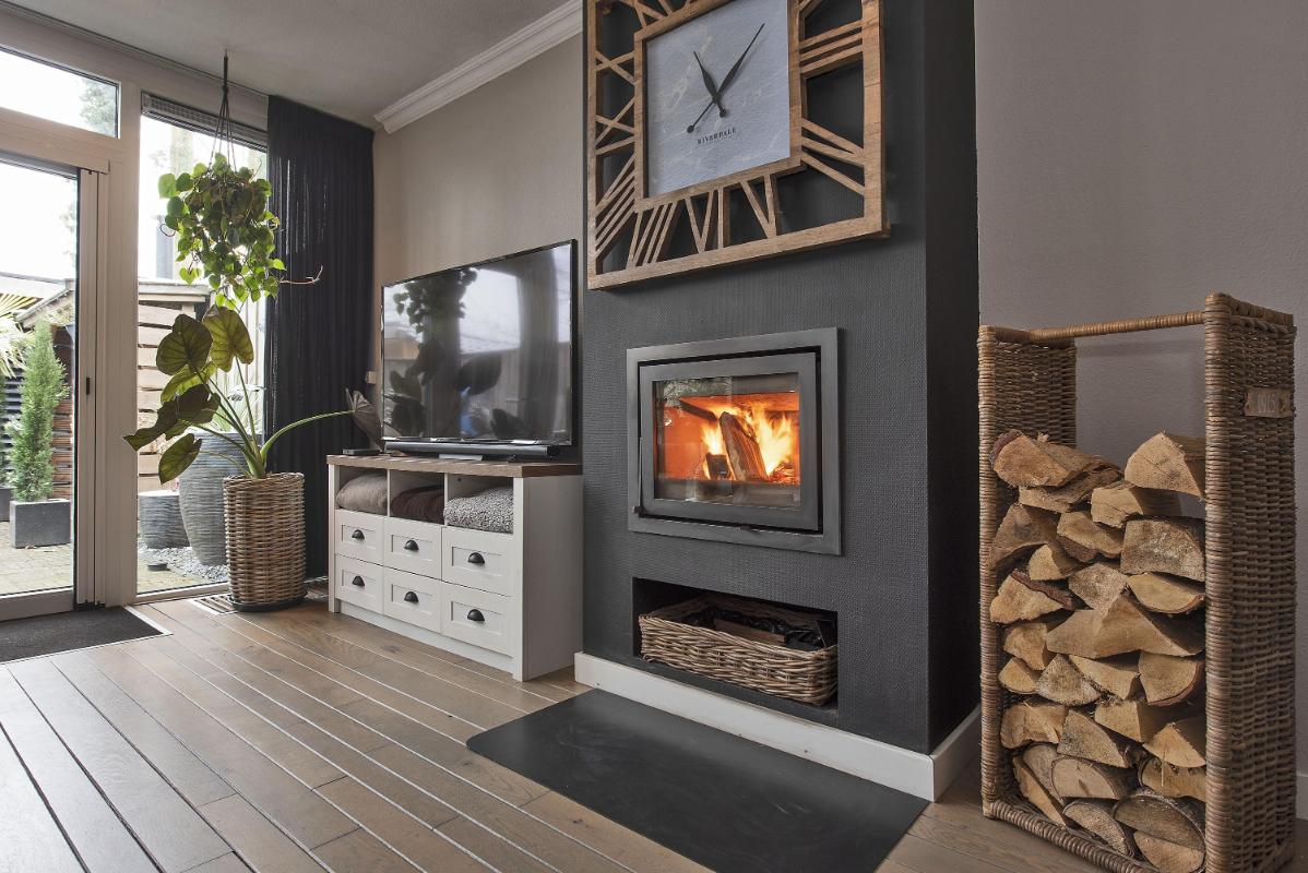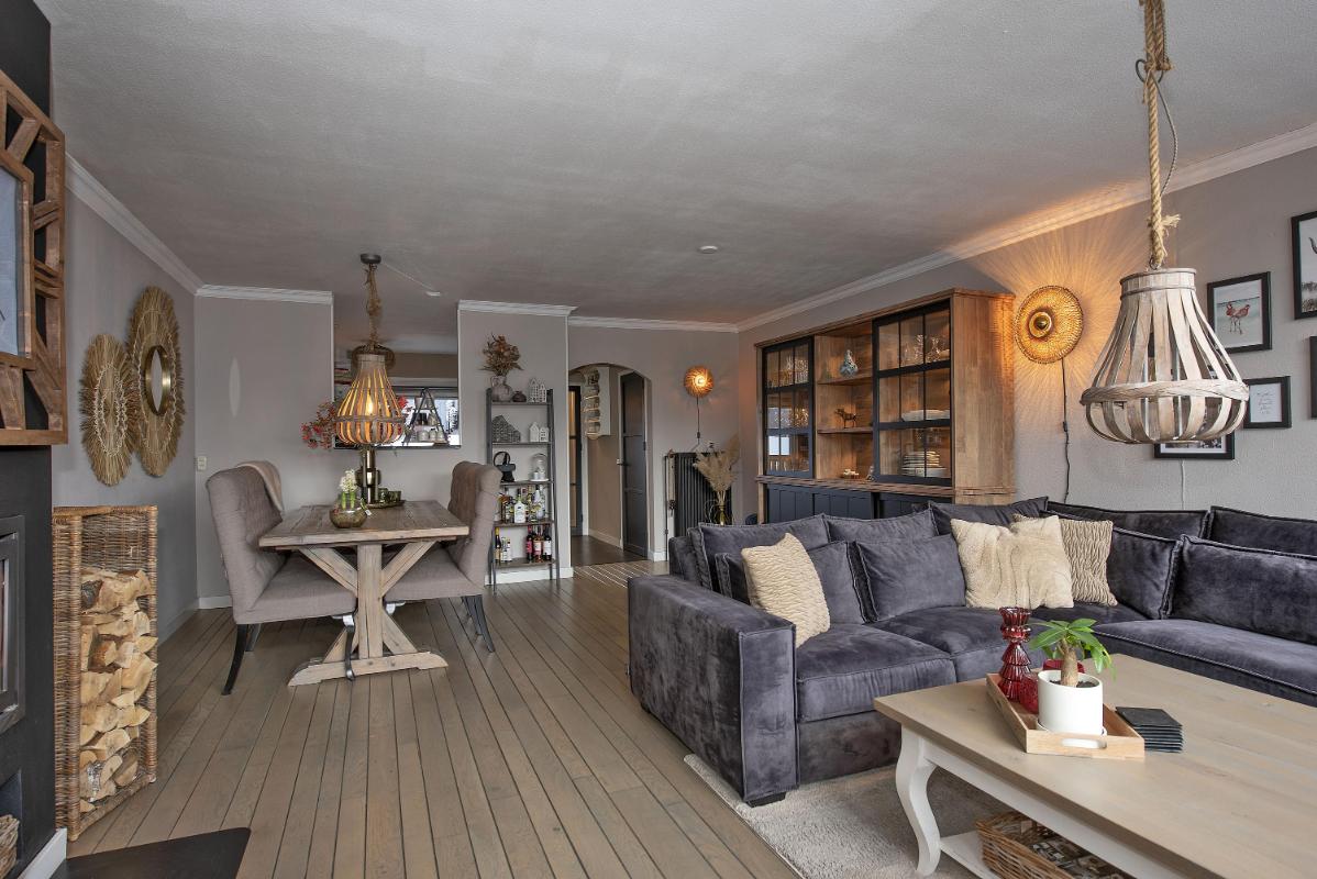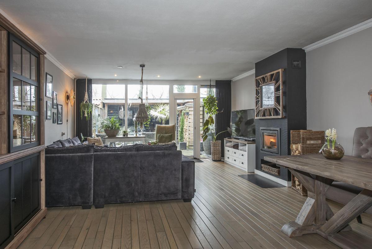 Voor de woning is een oprit, zodat je op eigen terrein kunt parkeren. Aan de voorkant vind je ook de toegang tot de berging, handig voor fietsen en het opbergen van spullen. Achter de voordeur kom je in een verzorgde hal met een modern toilet, de trap naar boven en de meterkast. Het toilet beschikt over een wandcloset, fontein en is betegeld met grote, eigentijdse tegels. Aan de straatzijde ligt de keuken: een ruime hoekopstelling met strakke fronten en een donker werkblad. Hier bevindt zich ook een praktische trapkast, ideaal voor voorraad en alle spullen die je uit het zicht wilt opbergen. De keuken is voorzien van inbouwapparatuur, waaronder een kookplaat, afzuigkap, koel-vriescombinatie en een vaatwasser. Dankzij de opening in de wand tussen keuken en woonkamer heb je leuk contact met elkaar en komt er extra daglicht binnen. Via de boogdoorgang loop je de woonkamer in, met ruim voldoende plek voor een eettafel en zitplek. De houten vloer, de sfeervolle haard, sierlijsten aan het plafond en de grote raampartij met tuindeur geven deze ruimte een warme uitstraling. Deze combinatie maakt het een prettige plek om te eten en te ontspannen, met vrij zicht op de achtertuin.