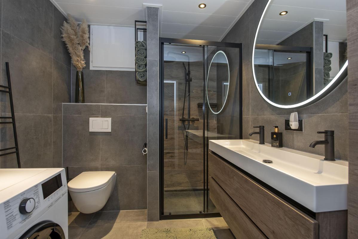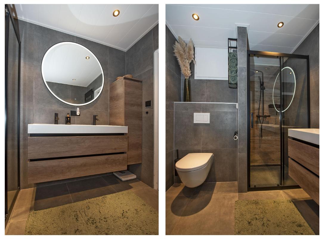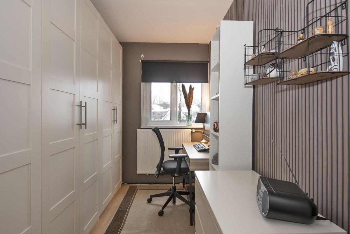 1e verdieping: Boven kom je op een overzichtelijke overloop met toegang tot drie slaapkamers en de badkamer. De slaapkamer aan de achterzijde biedt ruim voldoende plek voor een tweepersoonsbed en extra kasten. Aan de voorzijde liggen nog twee slaapkamers die zich uitstekend lenen als slaap-, werk- of hobbykamer. Op de overloop en in een van de kamers vind je bovendien praktische vaste kasten, ideaal voor linnengoed, voorraad of seizoens spullen. De eyecatcher op deze verdieping is de moderne badkamer: volledig betegeld in een stoere, donkere tegel, uitgerust met een ruime inloopdouche met glaswand, een breed wastafelmeubel met twee kranen en plaats voor de wasmachine. Dankzij de strakke afwerking, verlichte spiegel en de spots is dit een comfortabele ruimte waar je dag prettig begint en eindigt.