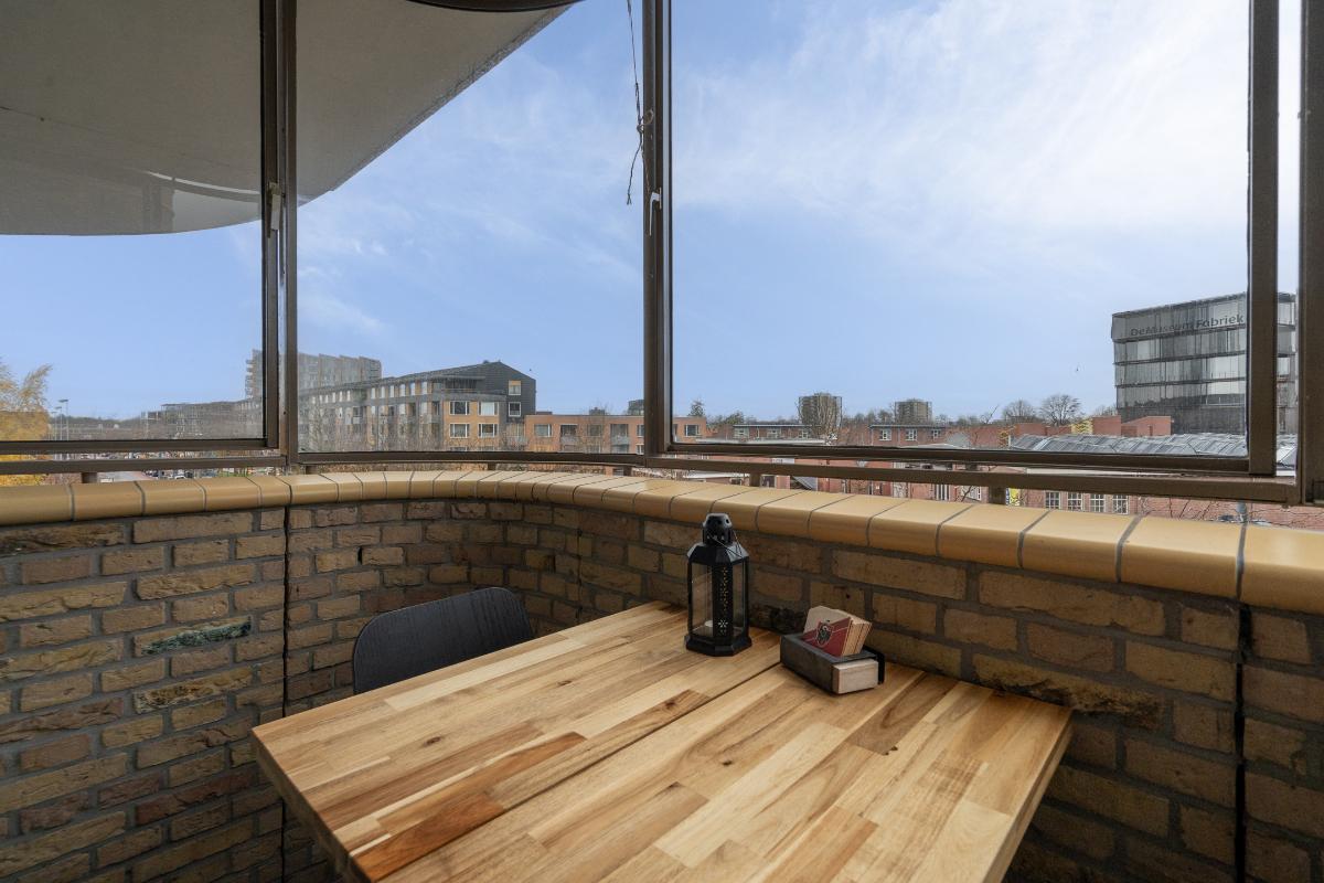 Appartement: Op de tweede verdieping kom je binnen in de entree met plaats voor bijvoorbeeld je jassen en schoenen. Vanuit hier heb je toegang tot alle vertrekken en de inpandige berging met wasmachine-aansluiting. Vervolgens loop je de lichte en ruime woonkamer in, die de speelse vorm van het gebouw volgt en grote ramen heeft met vrij uitzicht over Roombeek. De woonkamer biedt genoeg ruimte voor een gezellige zithoek en een royale eettafel. Aan de woonkamer grenst de open L-vormige keuken met volop werk- en kastruimte. De keuken beschikt over een keramische kookplaat, combi-oven, wasemkap, vaatwasser en koelkast. Via openslaande deur bereik je het overdekte balkon en de ronde loggia, waar je beschut achter het glas toch buiten kunt zitten. Hier is plek voor een kleine tafel met twee stoelen. Aan de frontzijde liggen twee slaapkamers, waarvan één met brede kastenwand en directe toegang tot het balkon. Een balkon waar je nog een zitje of wat groen kwijt kunt. De andere slaapkamer leent zich goed als logeer-, werk- of hobbykamer. De ruime badkamer is modern is uitgevoerd met witte wandtegels, donkere vloertegels en een verlichte spiegel. De badkamer beschikt over een inloopdouche en een breed wastafelmeubel. Het is een ruim, modern en licht appartement dat praktisch én comfortabel in gebruik is. In het hele appartement ligt een doorlopende vloer in houttint die de ruimtes met elkaar verbindt en zorgt voor een rustige basis waar verschillende woonstijlen goed op aansluiten.