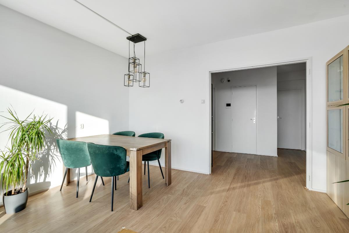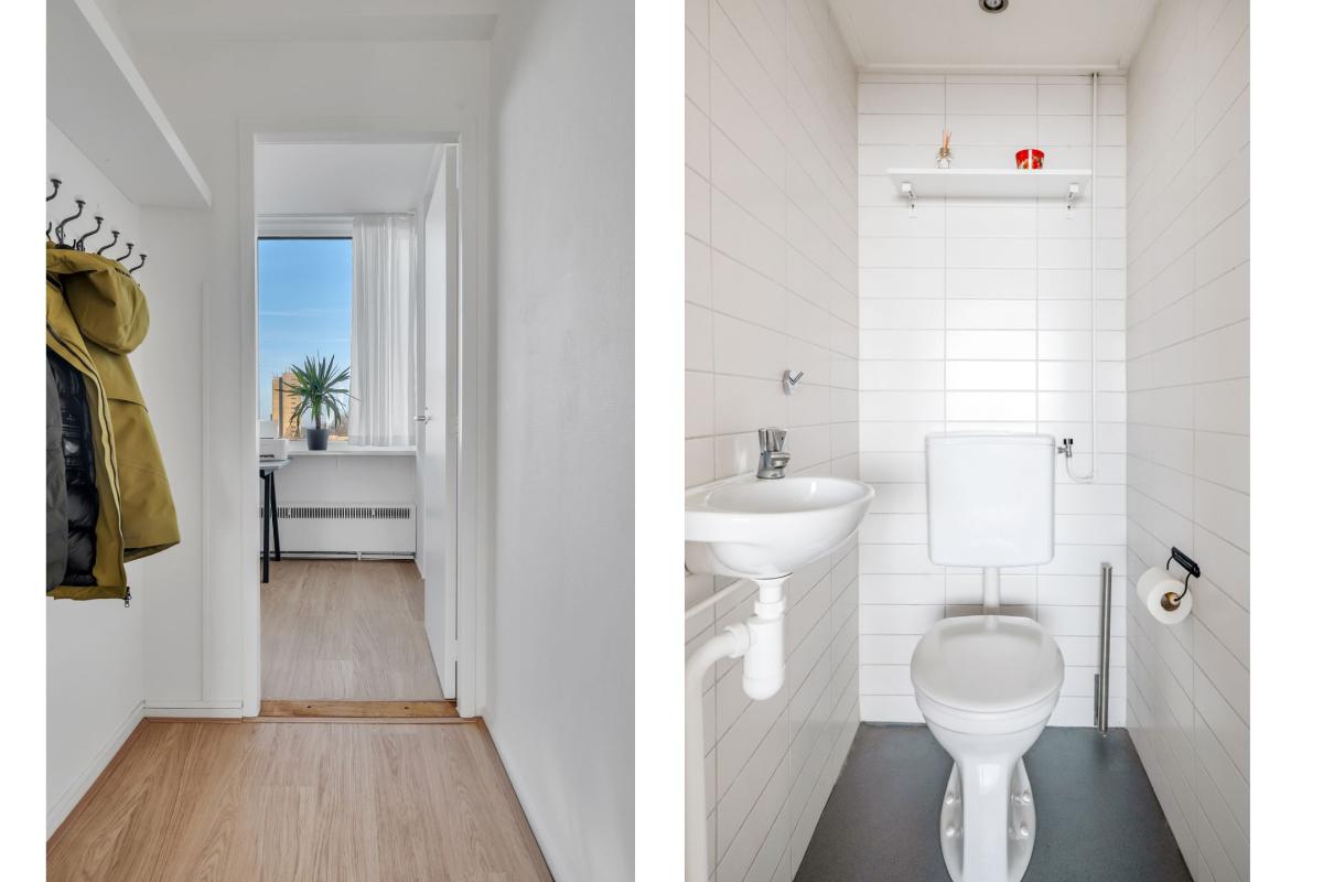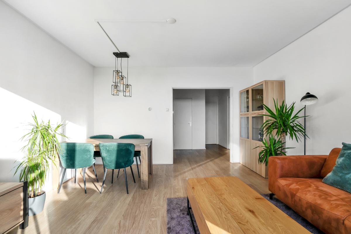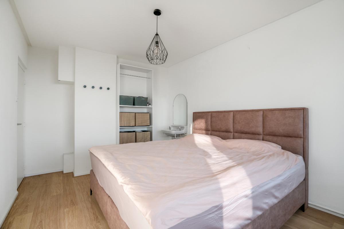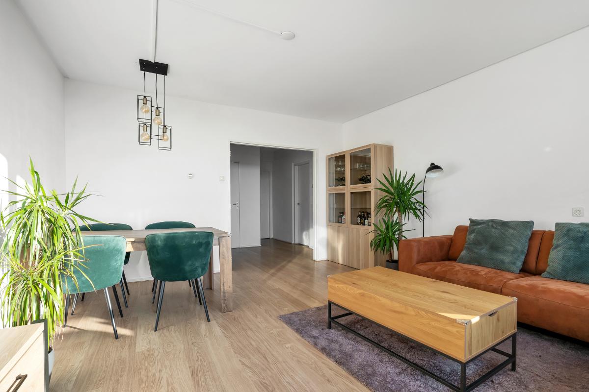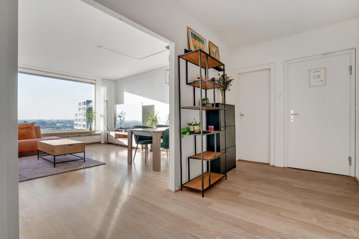 Appartement Achter de voordeur stap je in de ruime entree binnen. Hier heb je direct toegang tot de verschillende vertrekken en het aparte toilet. De lichte vloer loopt door in het appartement waardoor alles als één geheel aanvoelt. Vanuit de entree loop je door naar de open woonkamer. De woonkamer is een brede, rechthoekige ruimte met een grote raampartij. Daardoor valt er veel daglicht binnen en geniet je van een weids uitzicht over de stad. Er is genoeg plaats voor een royale zit- en eethoek. Door de praktische ruimte kun je met de indeling alle kanten op.