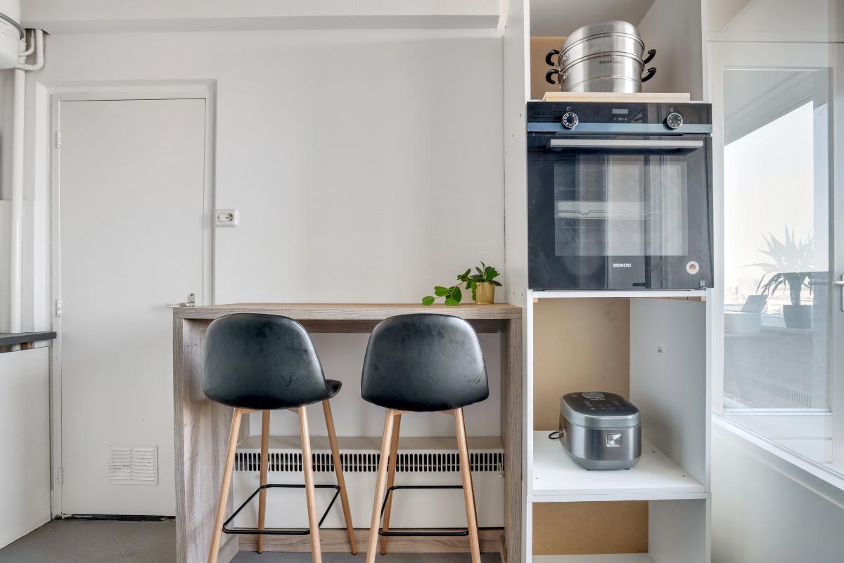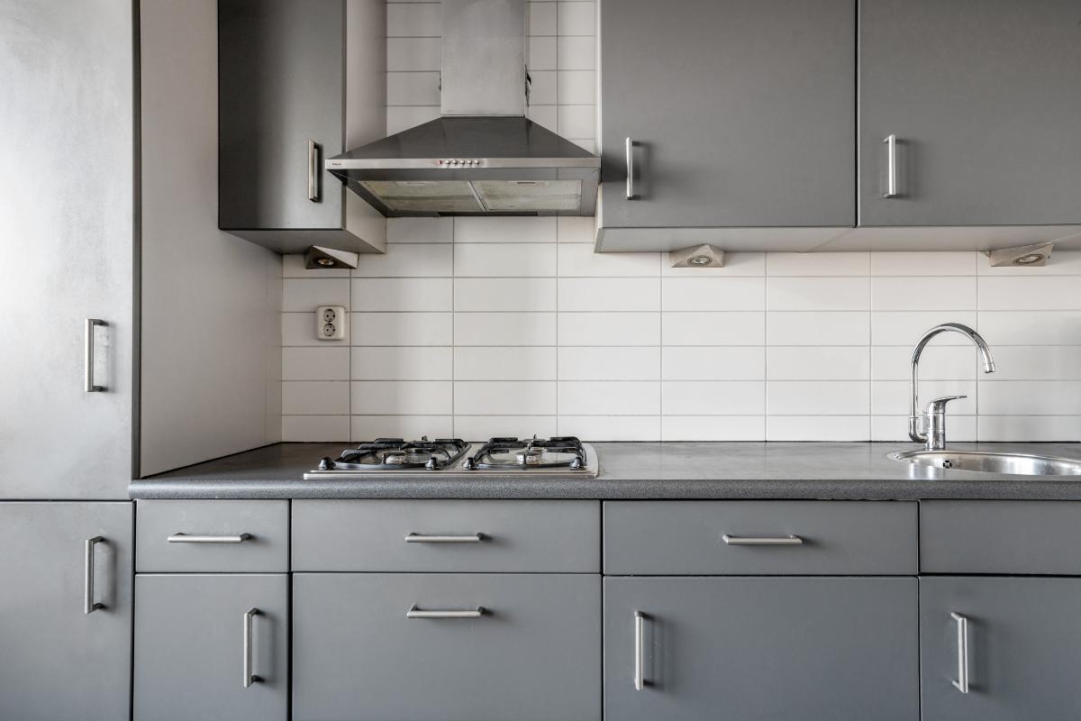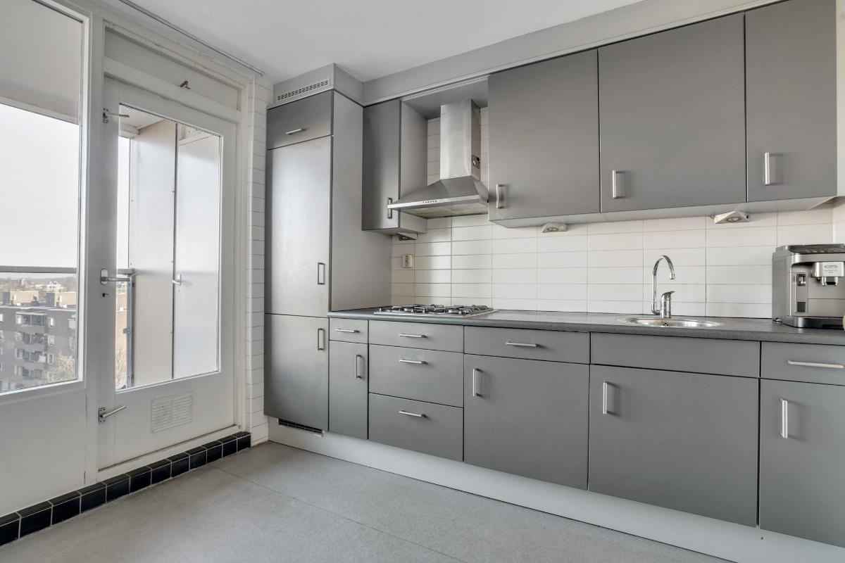 Grenzend aan de entree ligt de dichte keuken. Hier is gekozen voor een rechte opstelling met veel kastruimte in zowel onder- als bovenkasten. De keuken is uitgerust met een gaskookplaat, koelkast, vriezer, vaatwasser en afzuigkap en biedt ruimte voor overige apparatuur. Dankzij het raam en de deur naar het balkon kook je hier altijd met fijn daglicht en kun je zo naar buiten stappen voor een kop koffie of een snelle lunch in de buitenlucht.