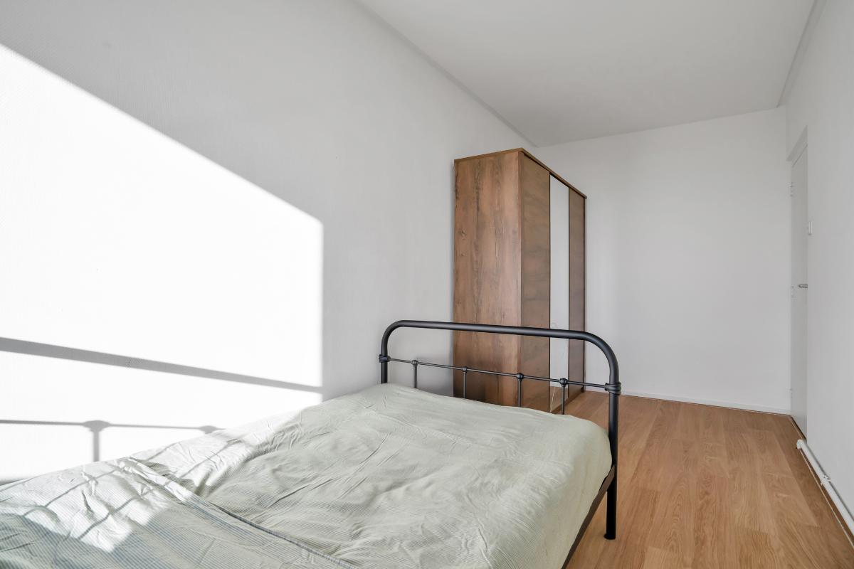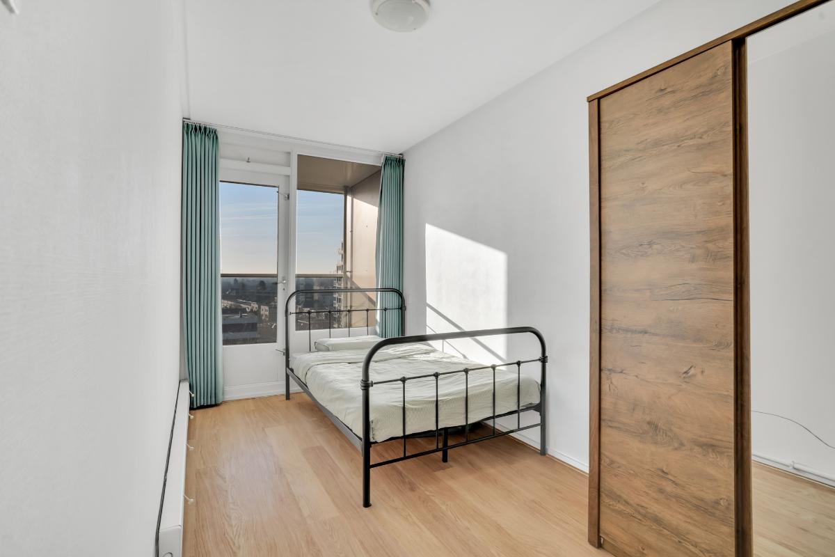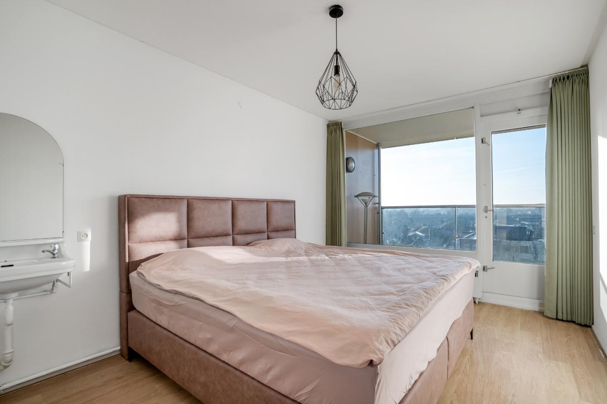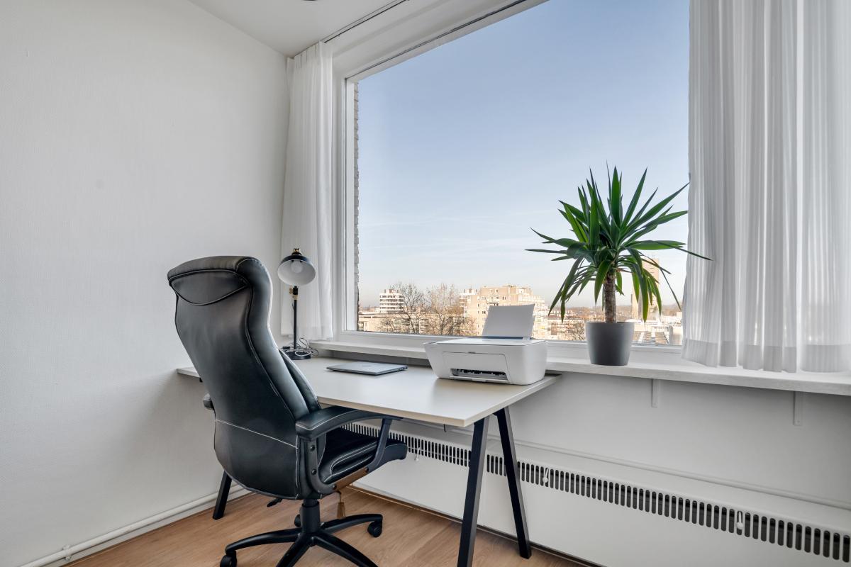 De grootste slaapkamer ligt aan de boulevard zijde en biedt genoeg ruimte voor een groot bed en kasten. Een praktische toevoeging in deze kamer is de wasbak. Daarbij is ook hier een balkon zodat je de dag kunt beginnen met frisse lucht en uitzicht over de stad. De tweede slaapkamer is eveneens licht en goed bruikbaar als hobby-, werk- of kastenkamer. De badkamer is compact en functioneel ingedeeld met een douche, wastafel en aansluiting voor de wasmachine. Tot slot is er nog een extra kamer die op de plattegrond als kantoor staat aangegeven. Dankzij het grote raam en het vrije uitzicht is dit een ideale plek om thuis te werken, te studeren of een hobbykamer te creëren. Met meerdere balkons rondom het appartement is er altijd wel een plek waar je kunt genieten van de zon, de schaduw en het uitzicht over Enschede.