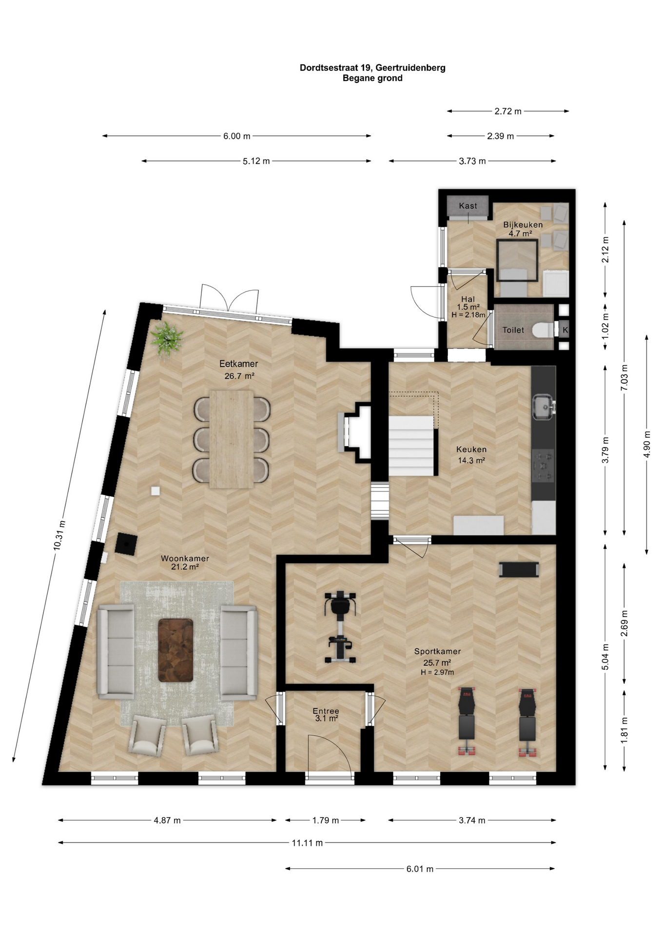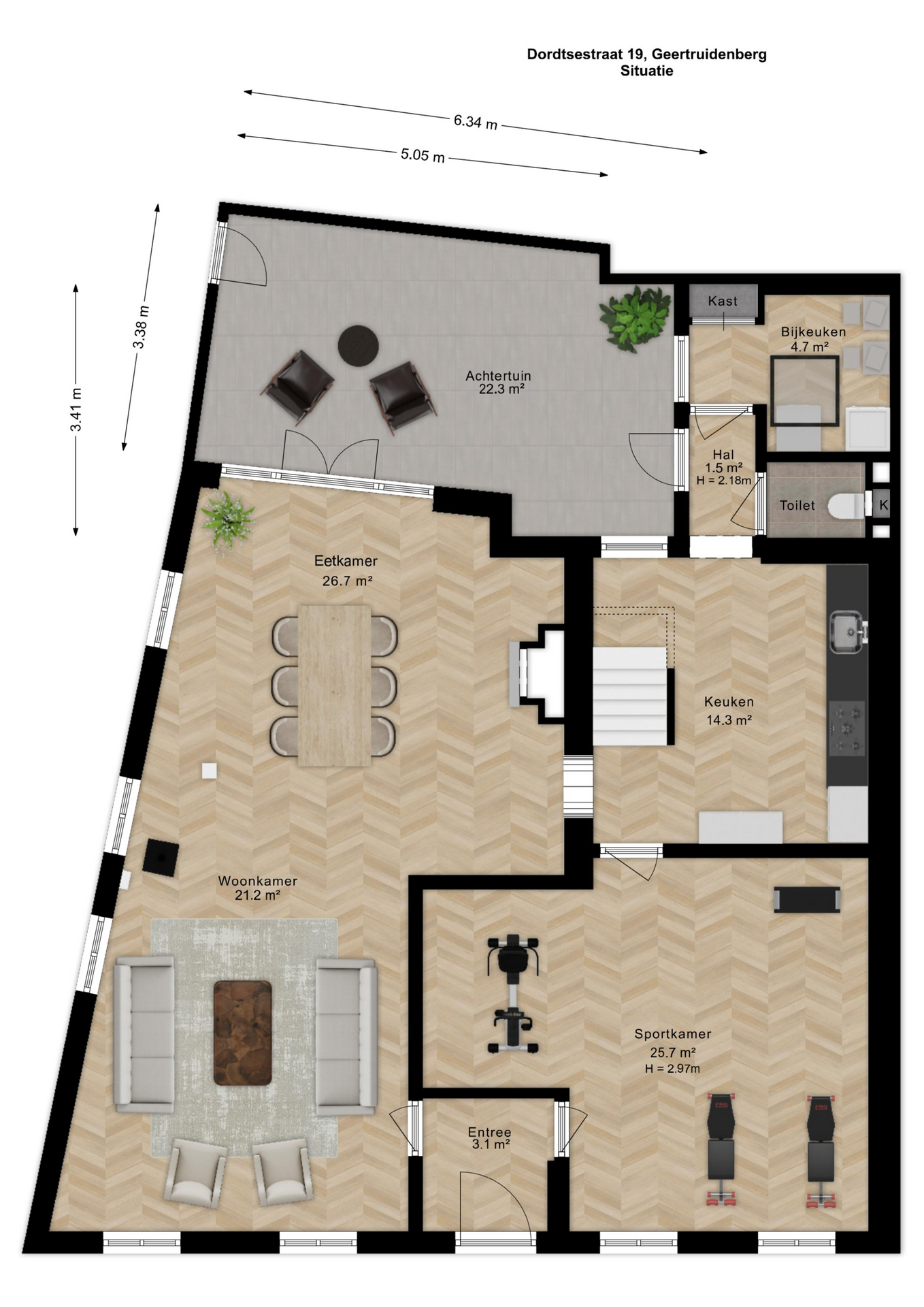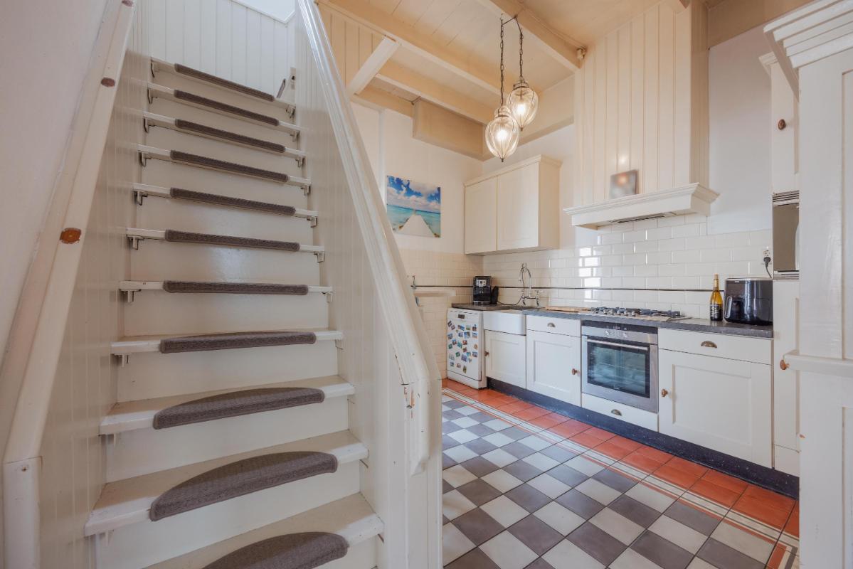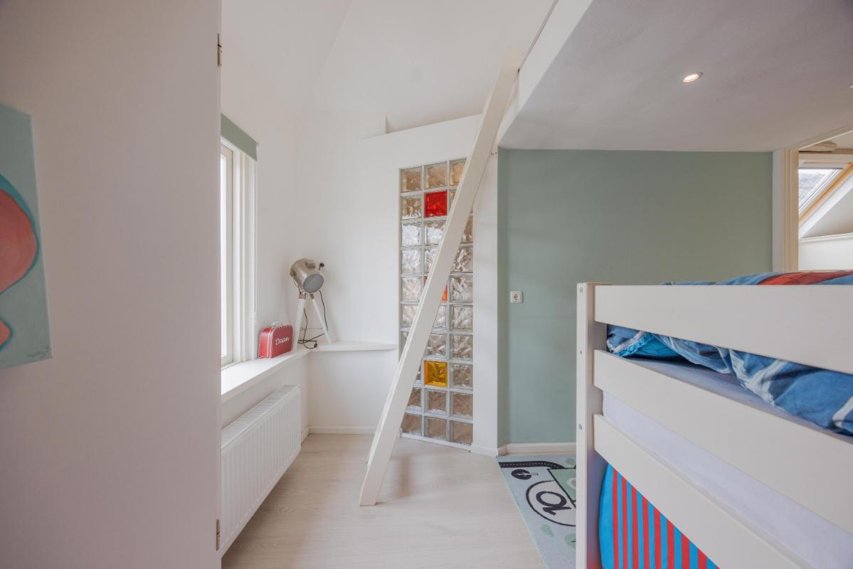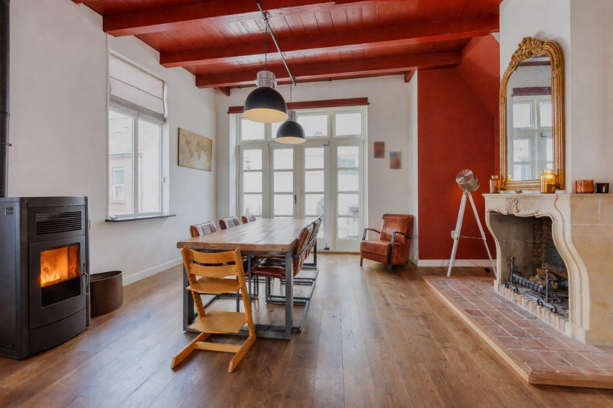 De begane grond is zonder twijfel het absolute pronkstuk van de woning. Zodra je via het portaal de woonkamer binnenstapt, word je gegrepen door de indrukwekkende hoogte en het prachtige balkenplafond. Dankzij de aanwezigheid van diverse zijramen geniet je hier van een prachtige lichtinval die de ruimte nog groter doet lijken. De woonkamer beschikt over twee haardpartijen, waaronder een sfeervolle pelletkachel, en biedt via openslaande deuren direct toegang tot de charmante stadstuin op het zonnige zuidwesten. Naast de riante woonkamer vind je op de begane grond een tweede, royale extra kamer. Deze ruimte is momenteel in gebruik als gym, maar de mogelijkheden zijn hier eindeloos. Denk bijvoorbeeld aan een riant thuiskantoor, een aparte speelkamer voor de kinderen, een atelier of zelfs een slaapkamer met badkamer voor levensloopbestendig wonen. De half-open keuken vormt met zijn passende uitstraling en speelse trapopgang het hart van het huis en verbindt de verschillende leefruimtes op een natuurlijke wijze.