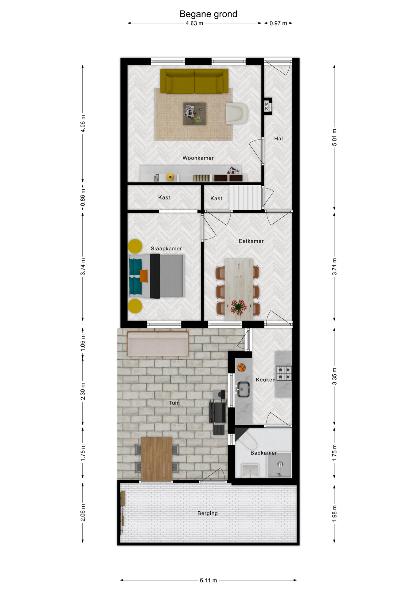 Begane grond Via de entree/hal met meterkast en trapopgang bereikt u de gezellige woonkamer aan de voorzijde. Aan de achterzijde bevindt zich de eetkamer, met toegang tot zowel de keuken als een multifunctionele ruimte die perfect dienst kan doen als slaapkamer of thuiskantoor.