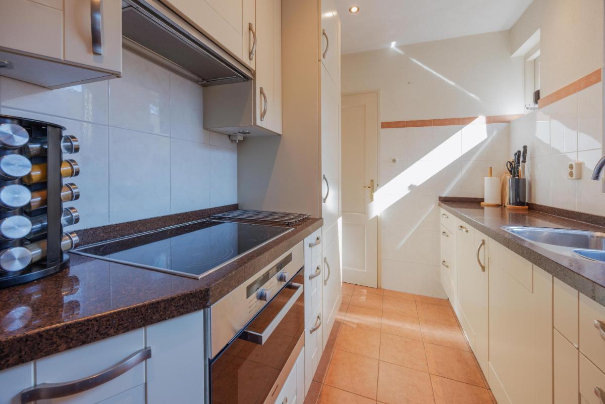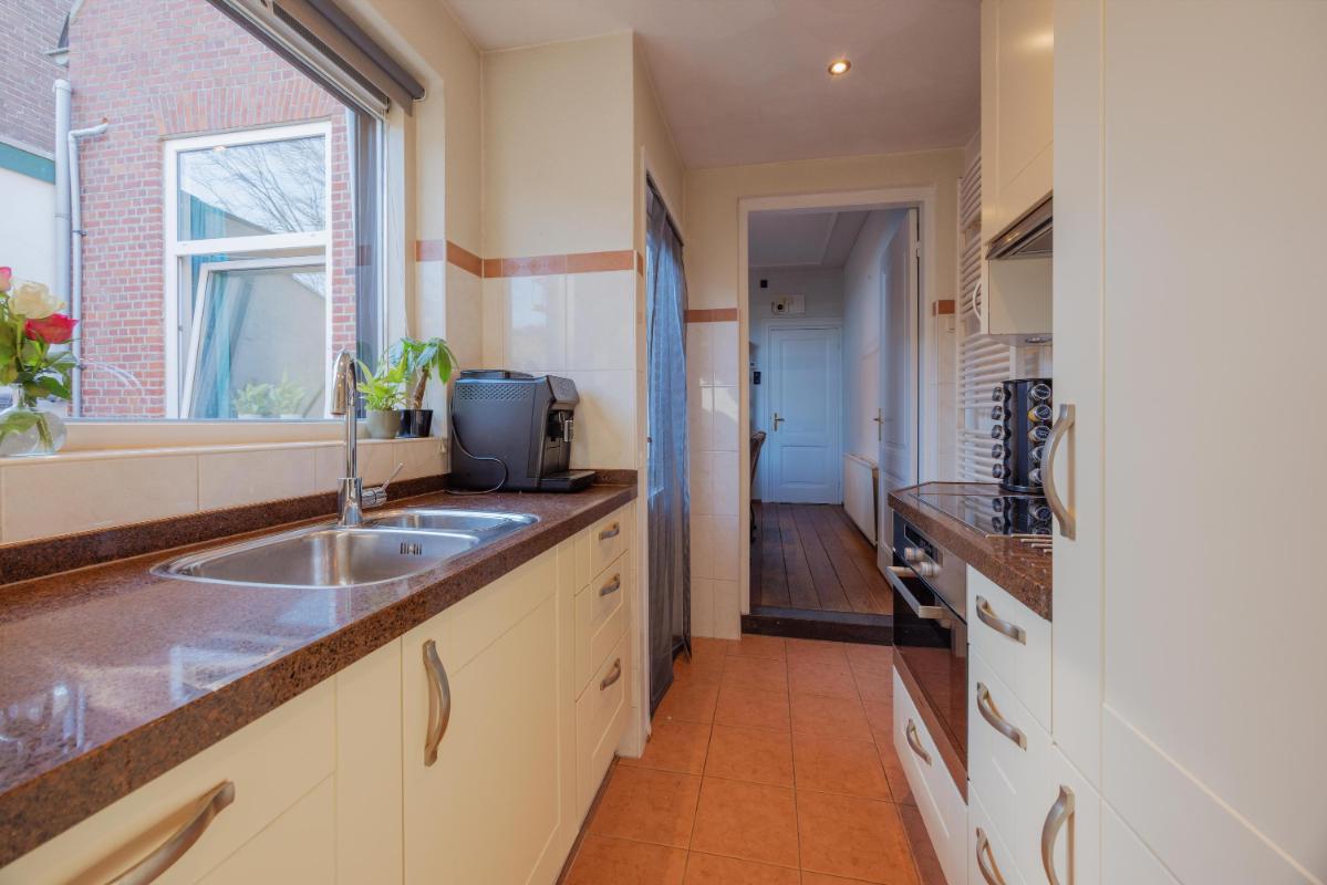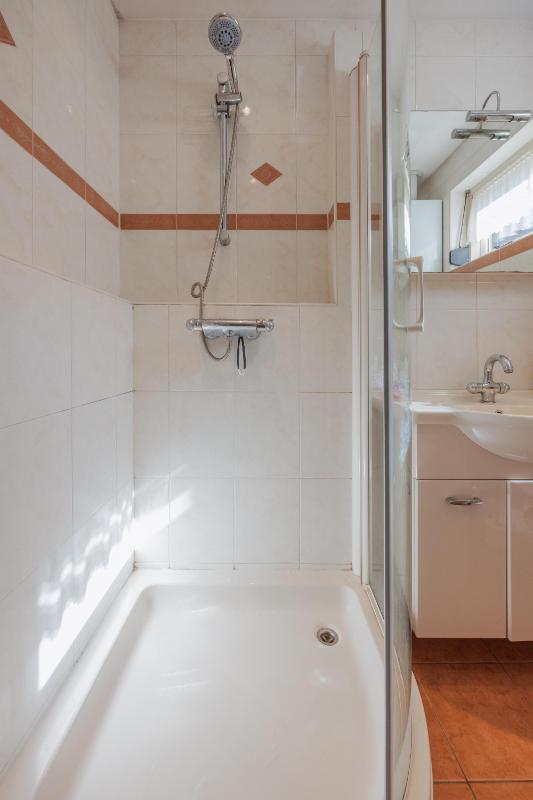 De keuken is uitgerust met diverse inbouwapparatuur, waaronder een vaatwasser, kookplaat, koelkast en combimagnetron. Vanuit hier bereikt u de badkamer, die is voorzien van een douchecabine, wandcloset, wastafelmeubel en warmwatervoorziening.
