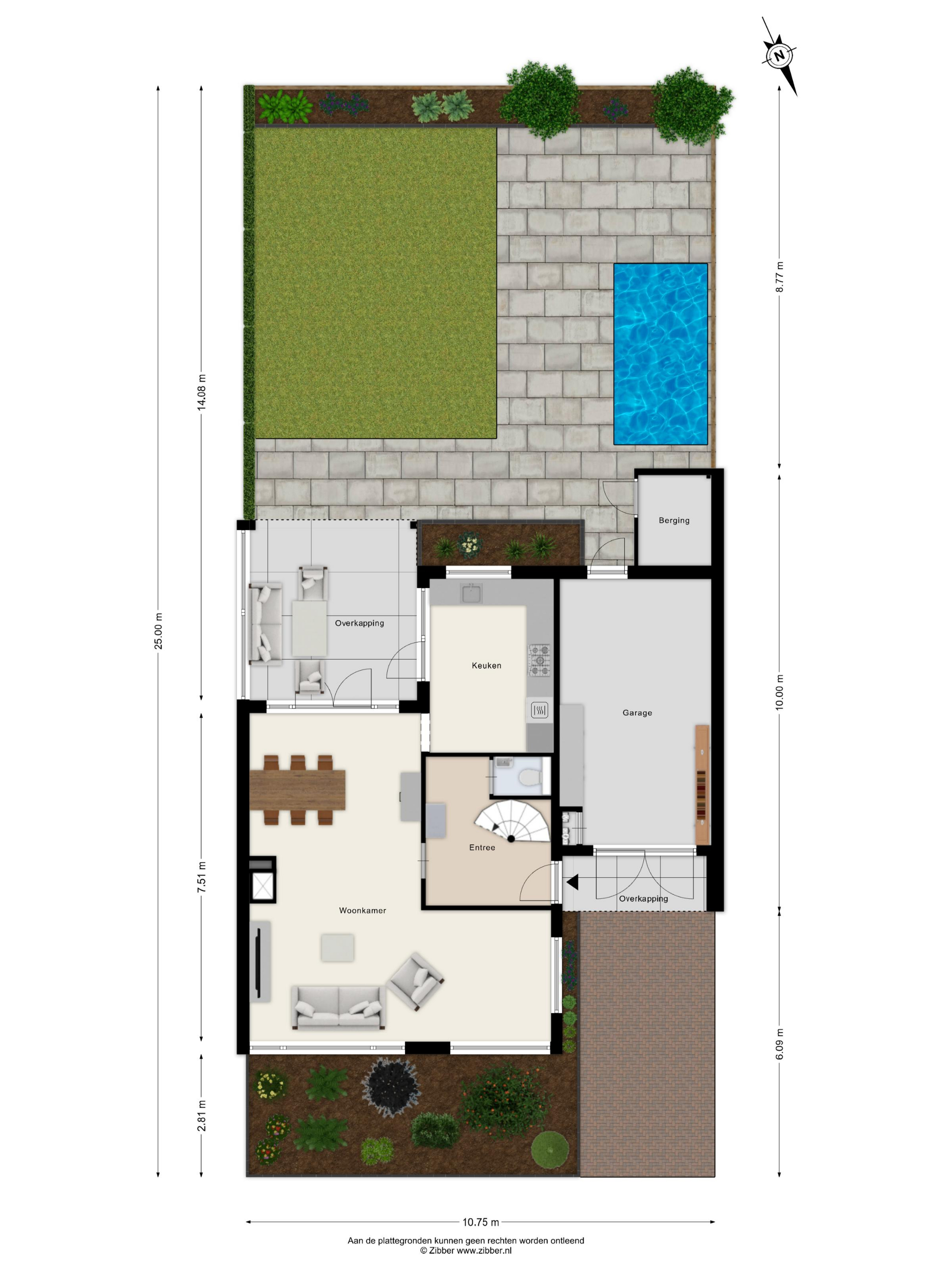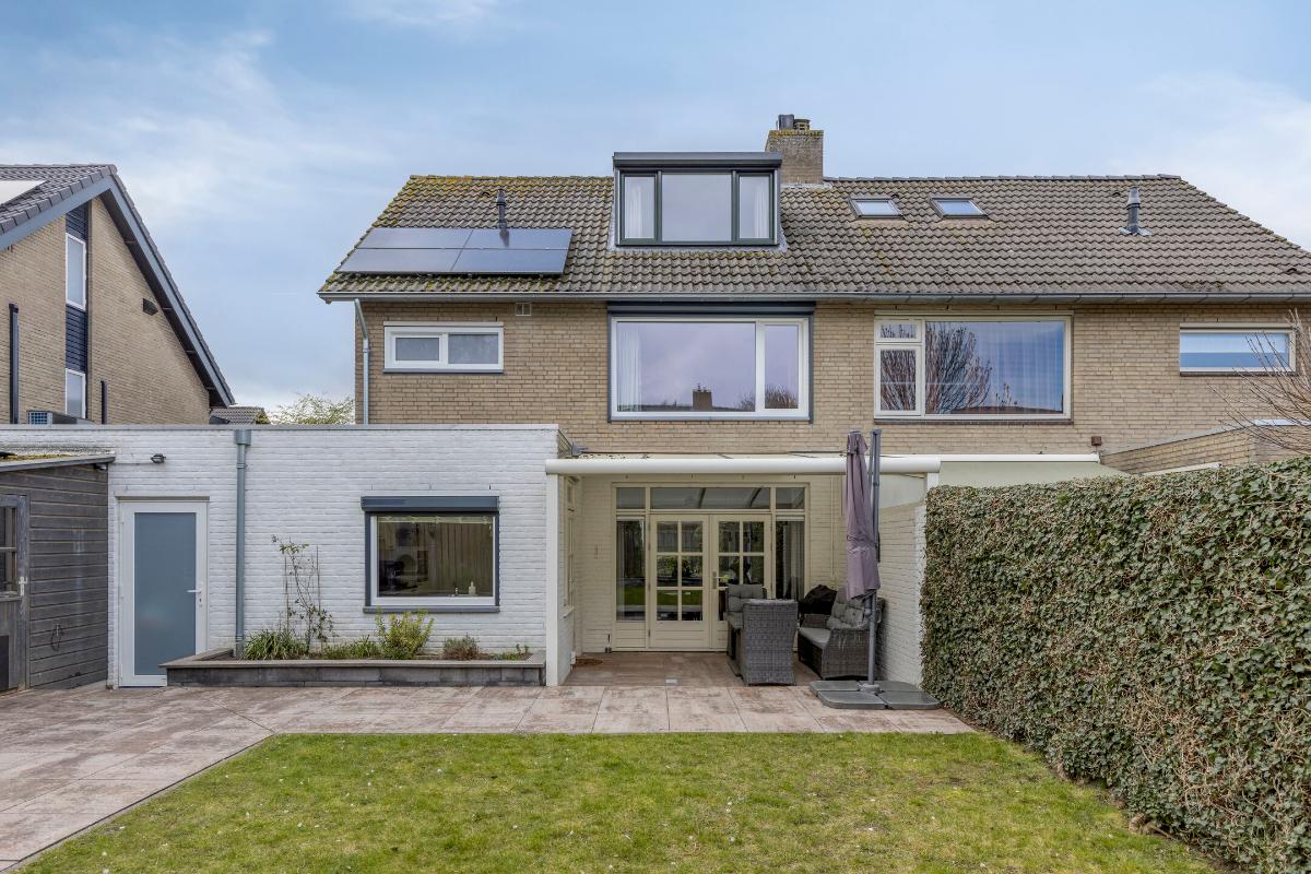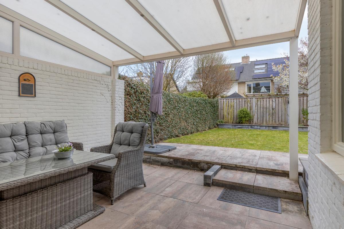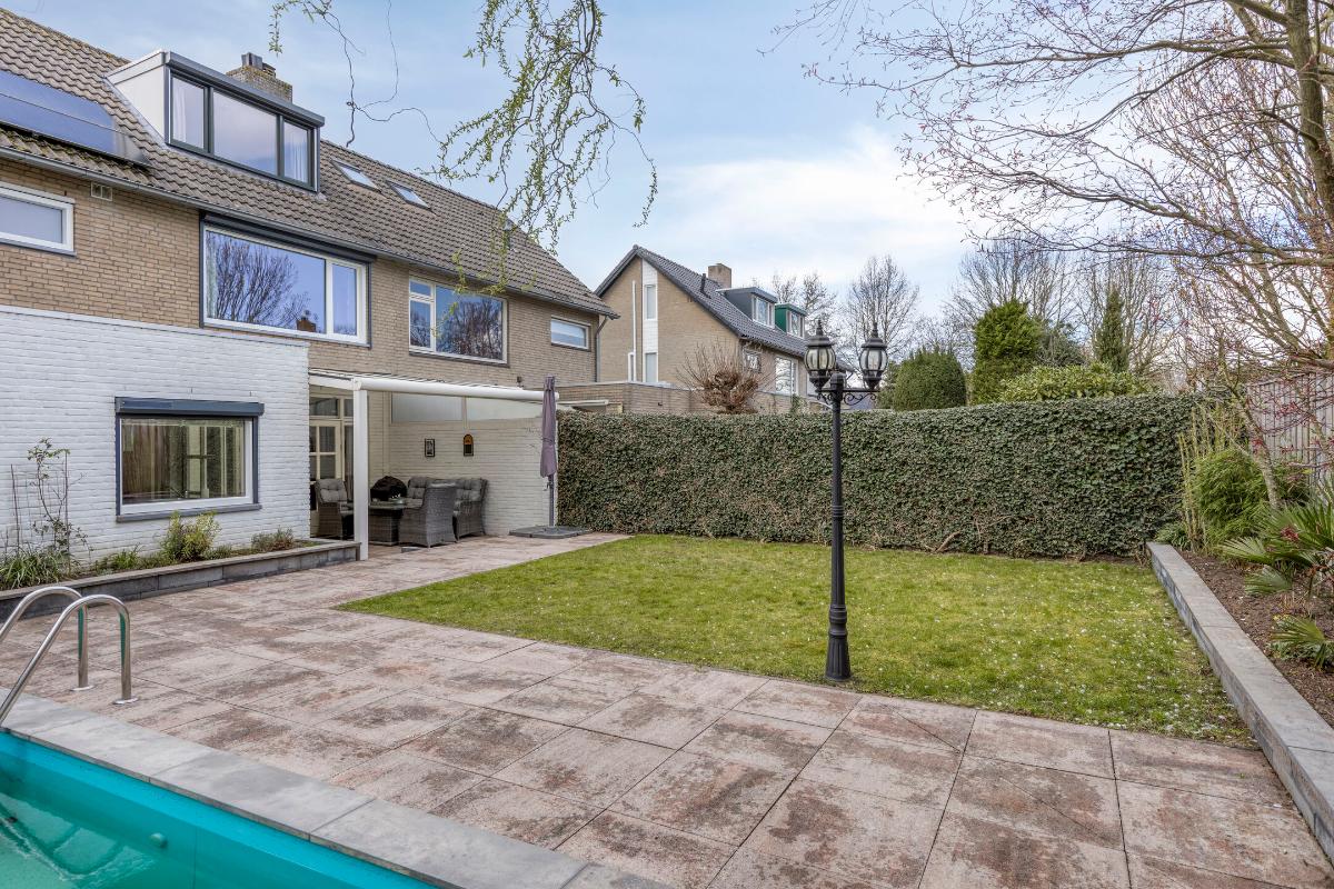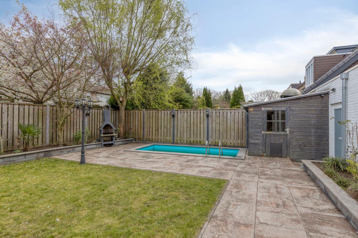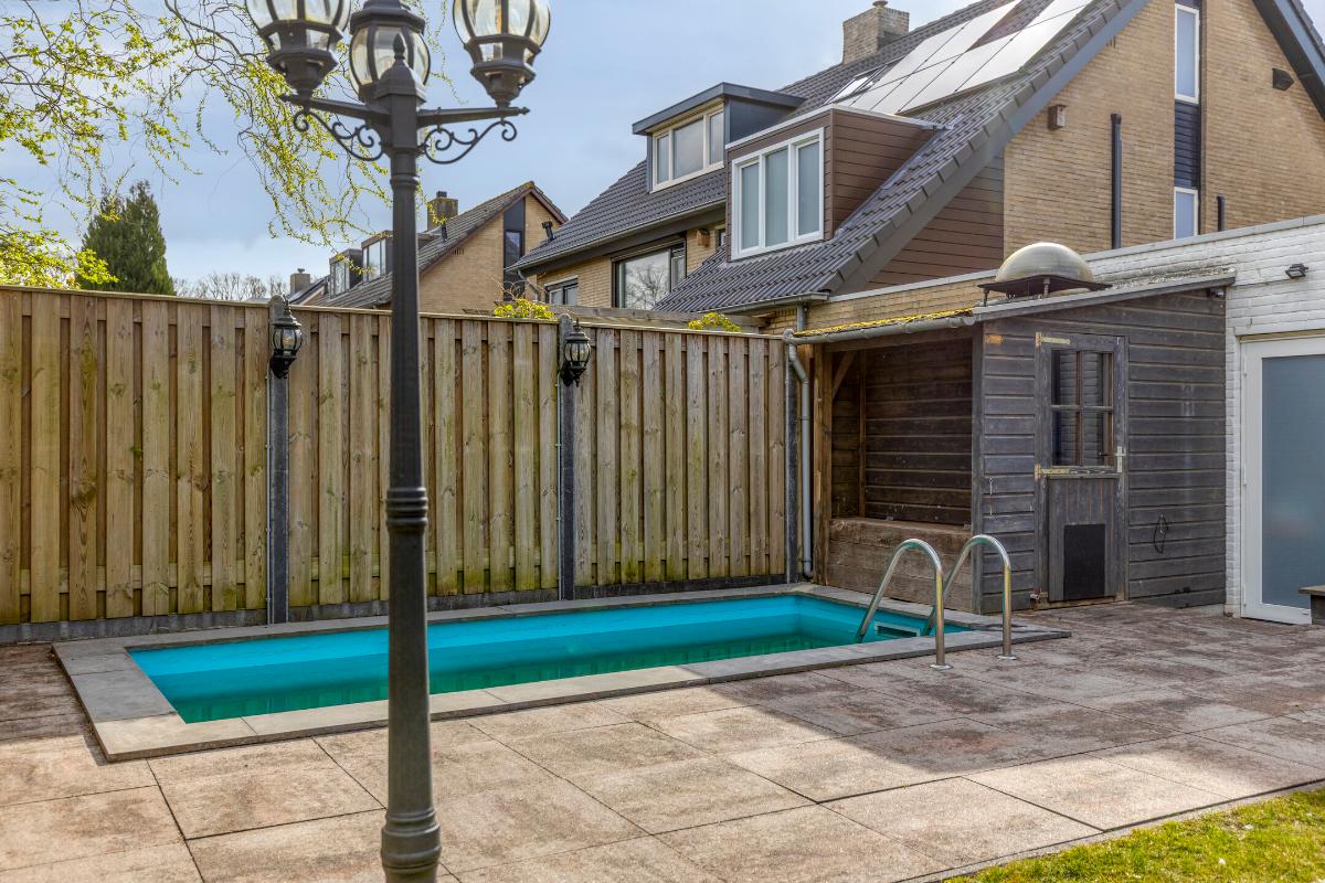 BUITENRUIMTE Voortuin met eigen oprit en toegang tot de garage. De achtertuin is fraai aangelegd met sierbestrating, gazon, borders met gevarieerde beplanting en een zwembad. Tevens beschikt de tuin over een overdekt terras en een houten berging, waar zich o.a. de pomp ten behoeve van het zwembad bevindt. Via de garage is er een eigen achterom aanwezig. Vanuit de ruime tuin geniet u van veel privacy.