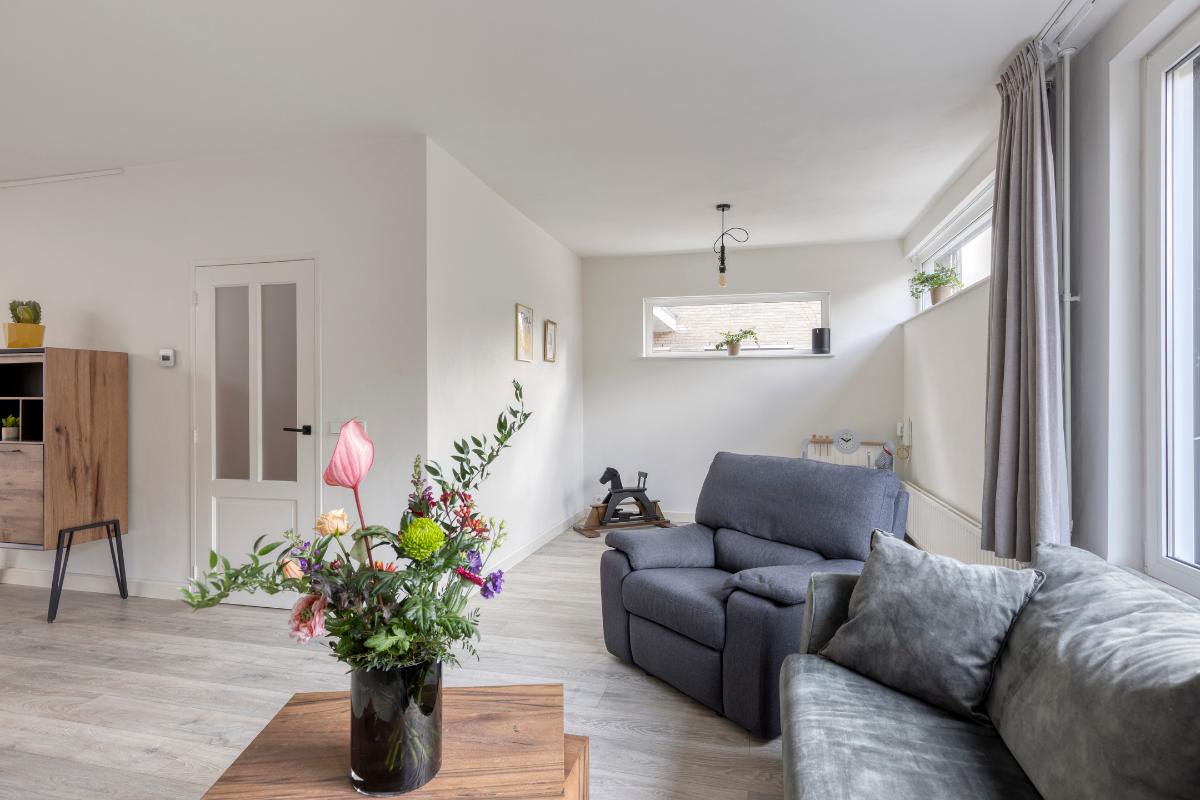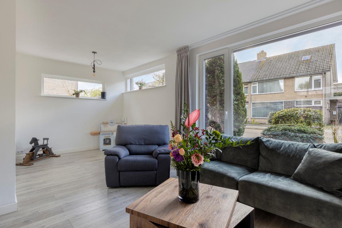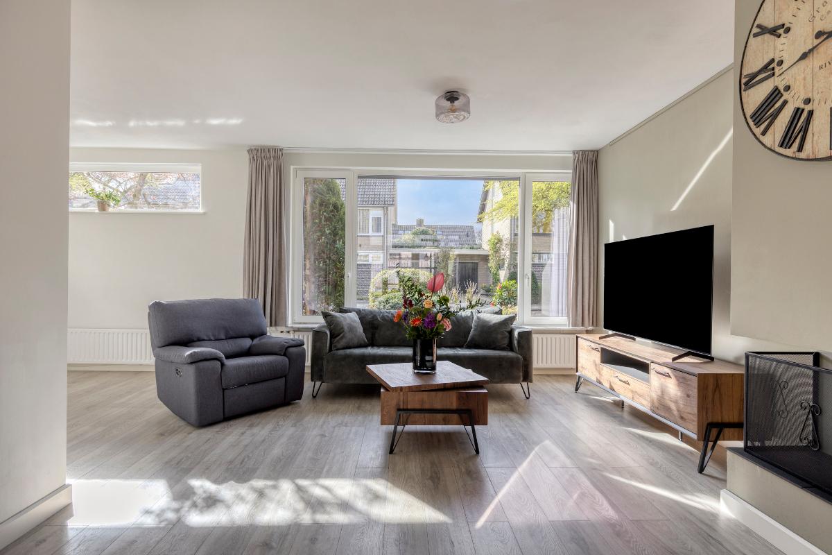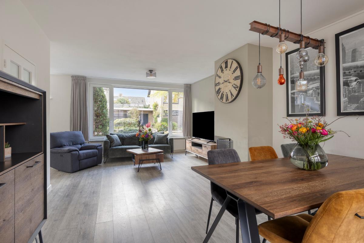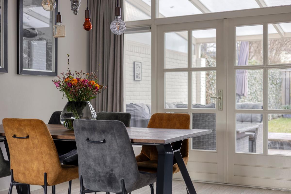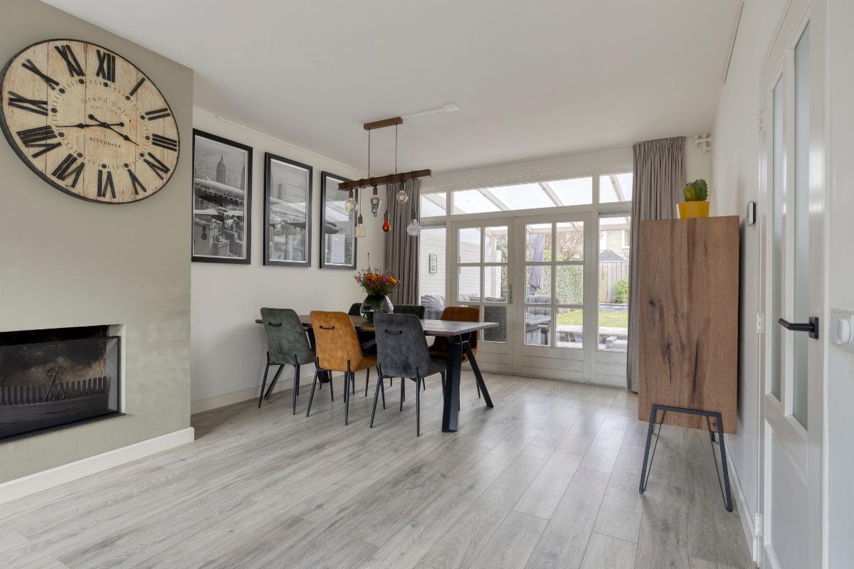 WOONKAMER Woonkamer met een prettig ingedeeld eet- en zitgedeelte en een sfeervolle haardpartij. Aan de achterzijde bevinden zich dubbele openslaande deuren naar de tuin met overkapping. Tevens is er een open verbinding met de halfopen keuken. Grote raampartijen zorgen voor een aangename lichtinval.