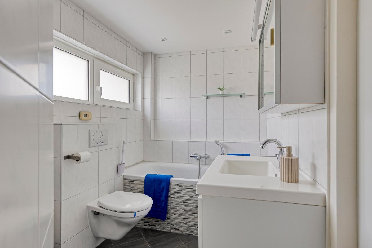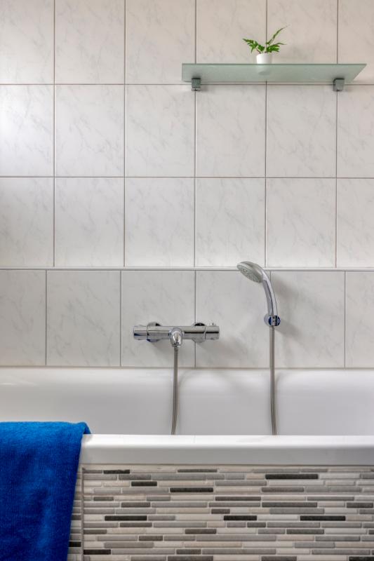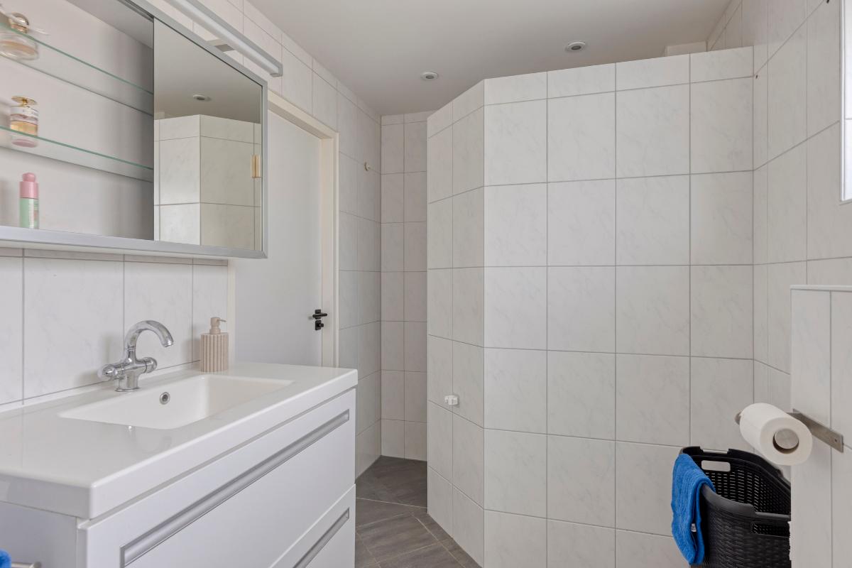 BADKAMER De volledig betegelde badkamer is ingericht met een inloopdouche, ligbad, wandcloset en wastafelmeubel. Tevens is de badkamer voorzien van vloerverwarming.