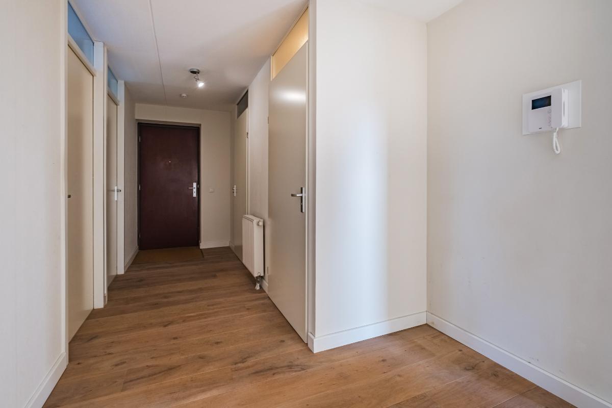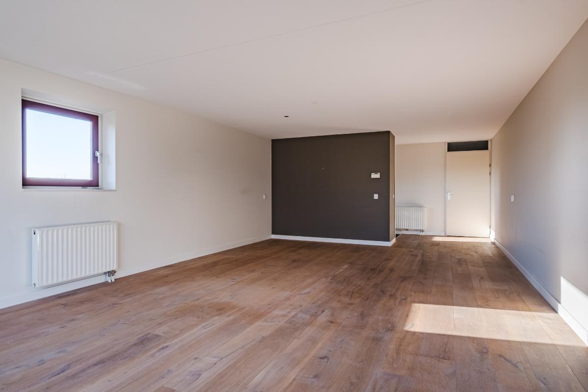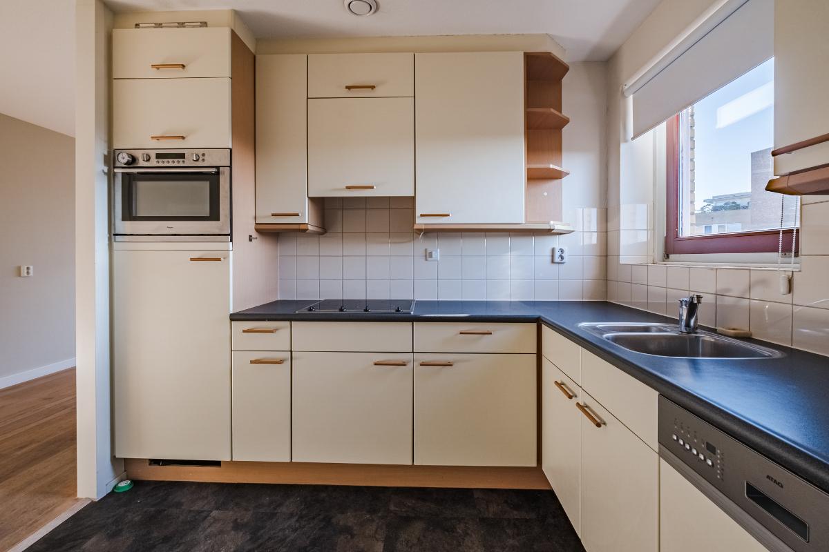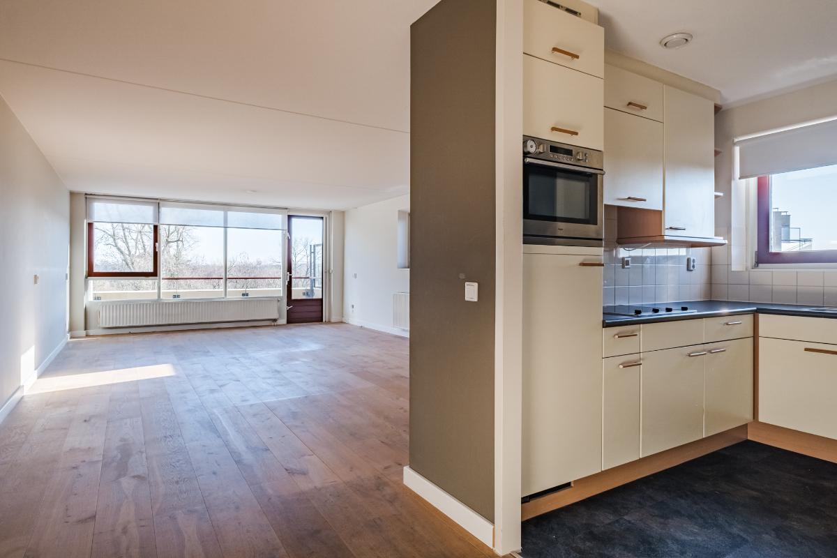 Binnenkomst in ruime woonkamer met half open keuken met eenvoudige inrichting. Grenzend aan de keuken bevindt zich een praktische bijkeuken annex berging met aansluitingen voor de wasapparatuur en opstelling cv-combiketel (2018). Vanuit de woonkamer is er toegang tot een ruim balkon op het oosten met een groen uitzicht. Er is een mogelijkheid om naar wens een open keuken te realiseren.