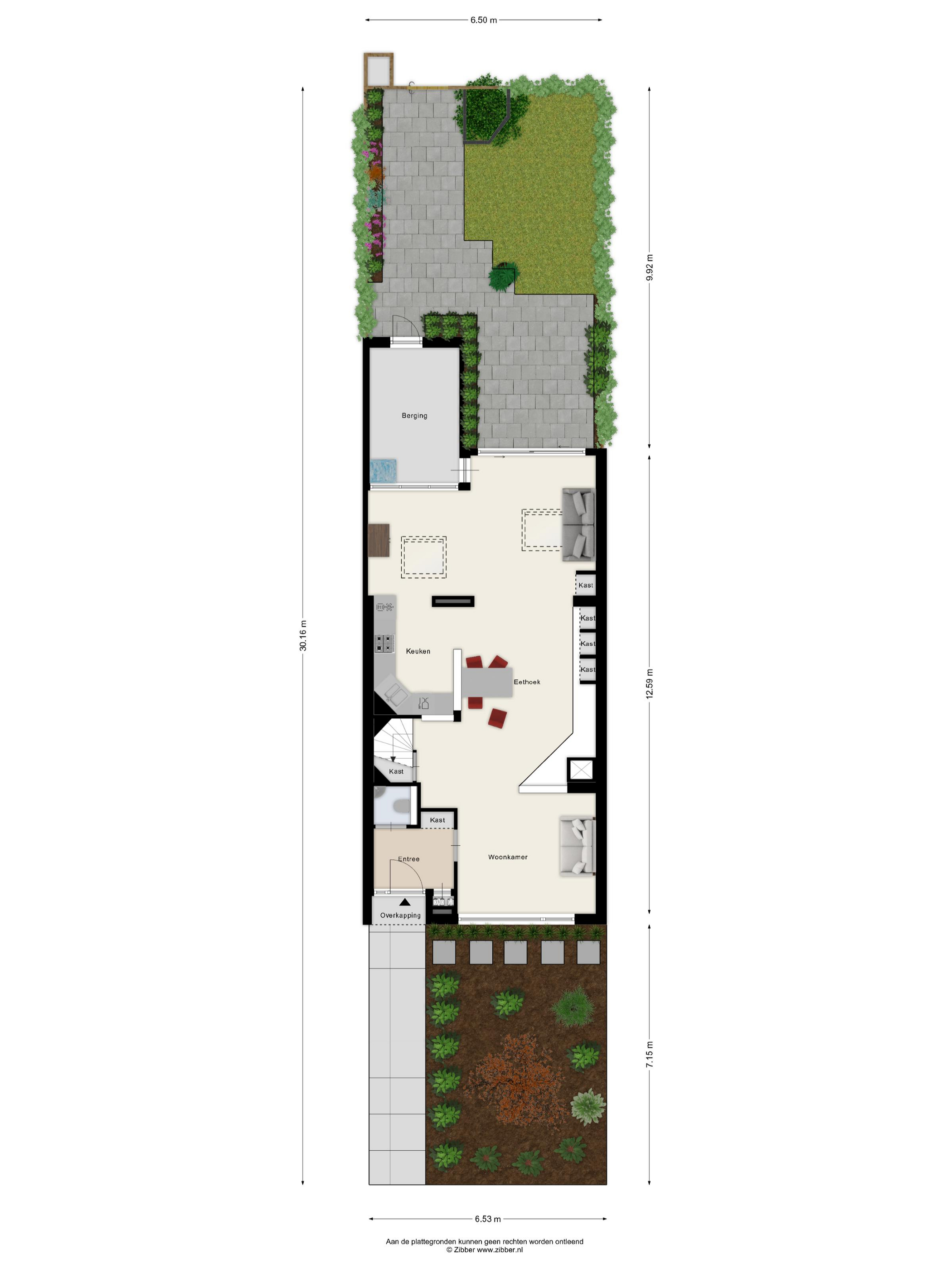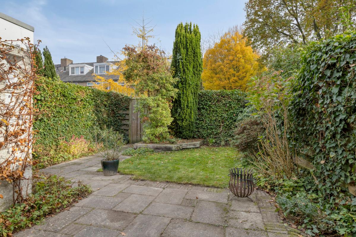 Tuin: De tuin ligt op het oosten, is ongeveer 10 meter diep, 6.50 meter breed en heeft een achterom. Er is opvallend veel privacy, een ruim terras, gazon en plantenborders. Tegen de gevel hangt een groot elektrisch bedienbaar zonnescherm.
