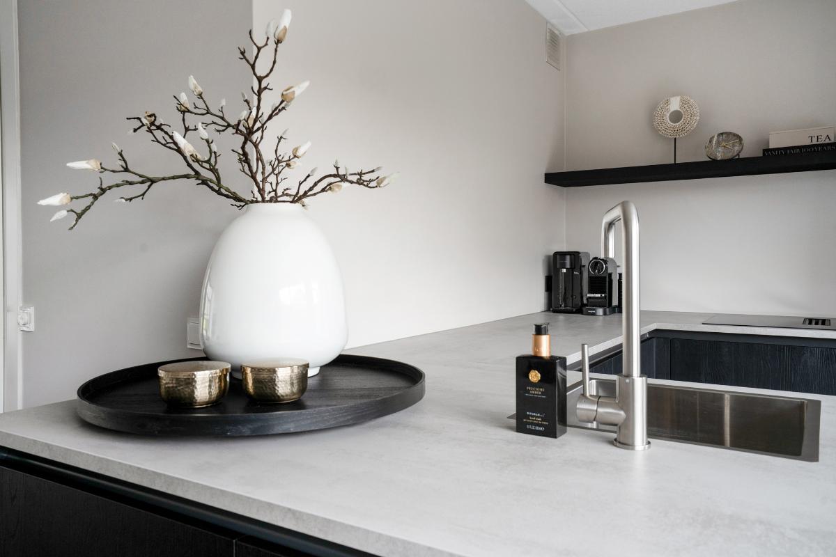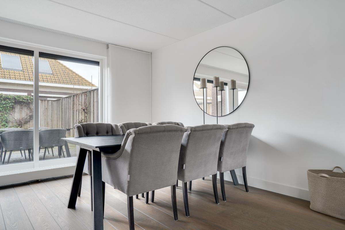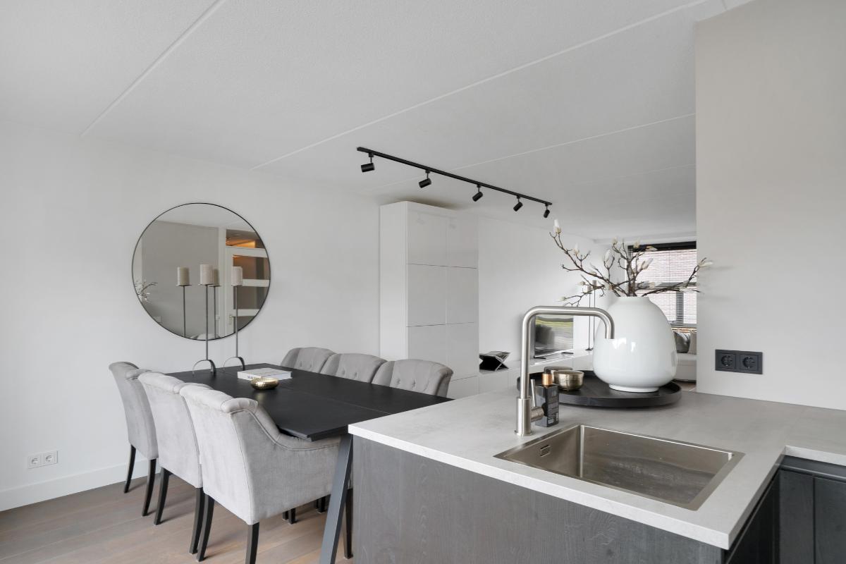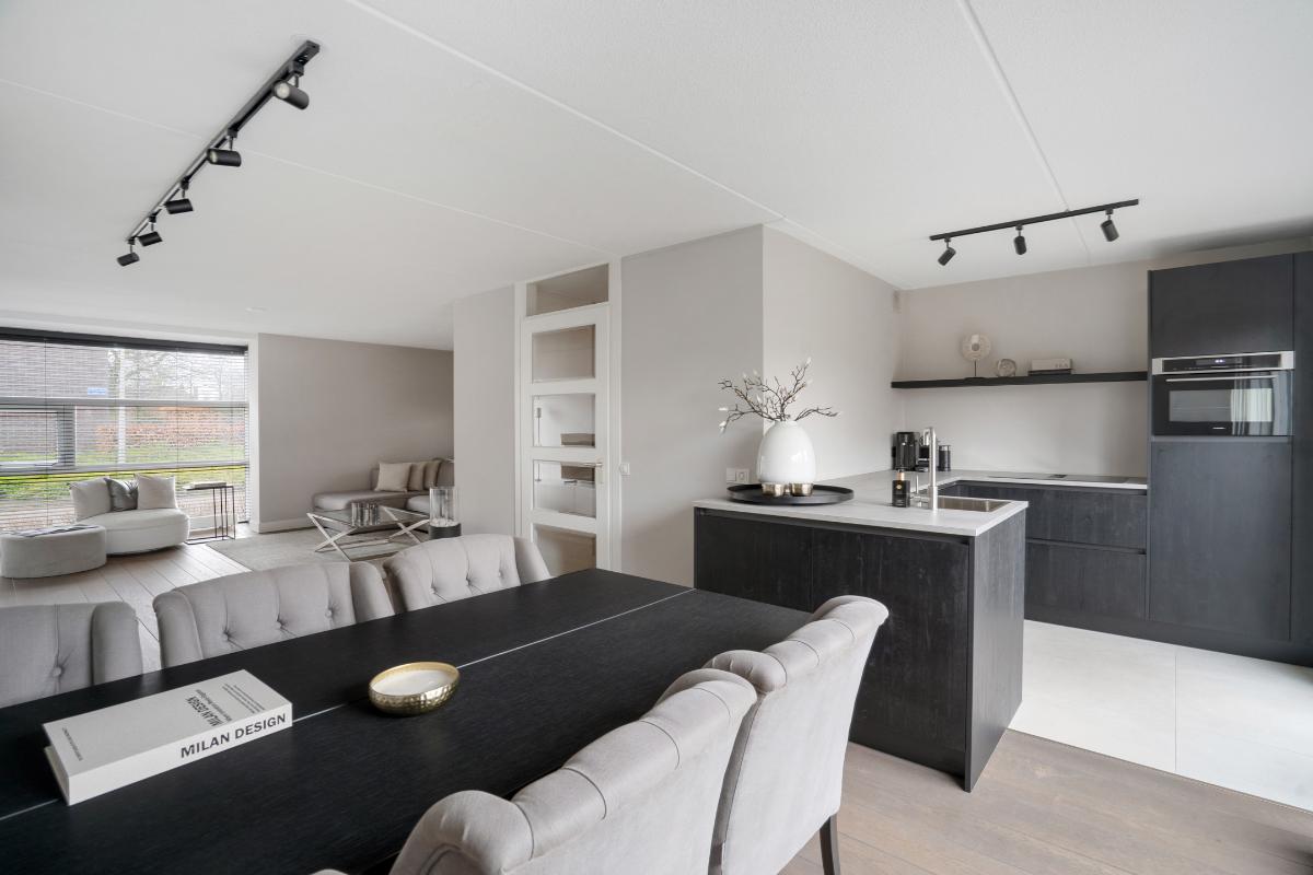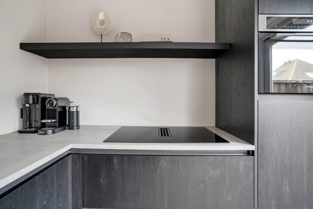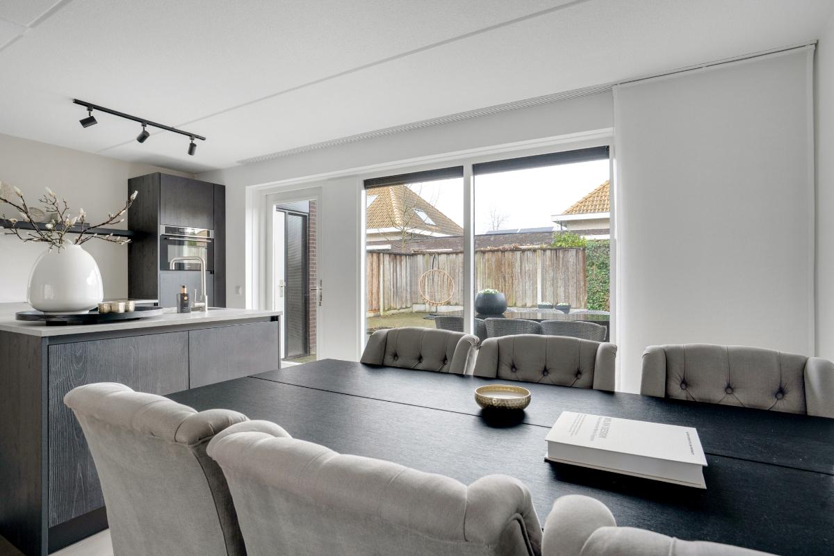 Verderop schuift de ruimte door naar het eetgedeelte. Juist die lengte in het huis maakt de indeling sterk. Er is plek om te zitten, te tafelen en te leven. Alles staat met elkaar in verbinding en toch heeft iedere plek zijn eigen functie. De open leefkeuken sluit daar naadloos op aan. De donkere uitvoering in combinatie met het schiereiland zorgt voor een eigentijdse uitstraling. Tegelijk is het vooral een keuken die uitnodigt tot dagelijks gebruik. Praktisch ingericht en voorzien van diverse inbouwapparatuur, waaronder een inductiekookplaat met geïntegreerd afzuigsysteem, combimagnetron, koelkast en vaatwasser.