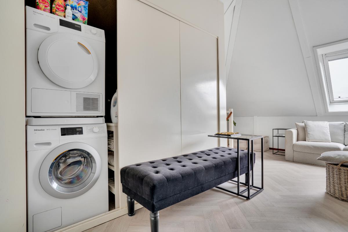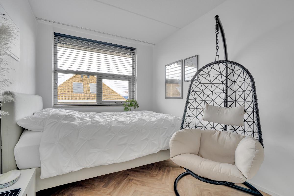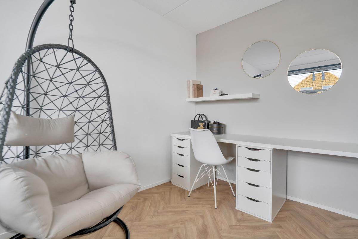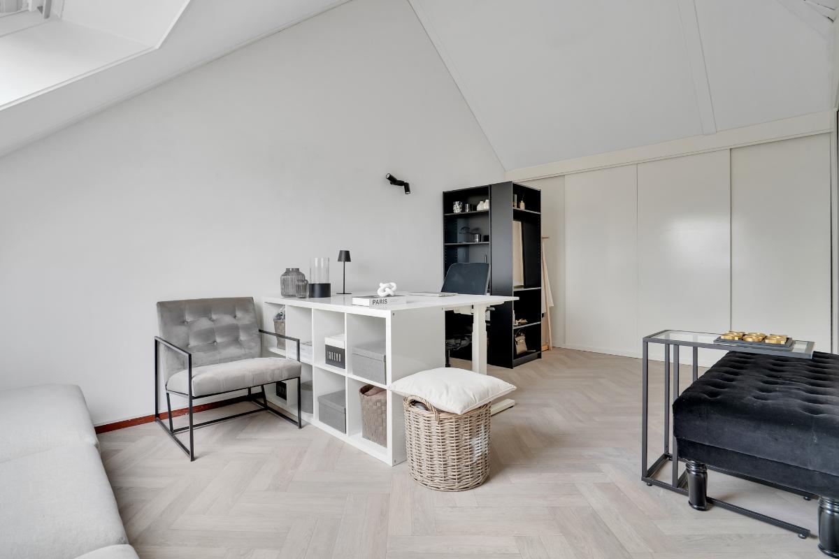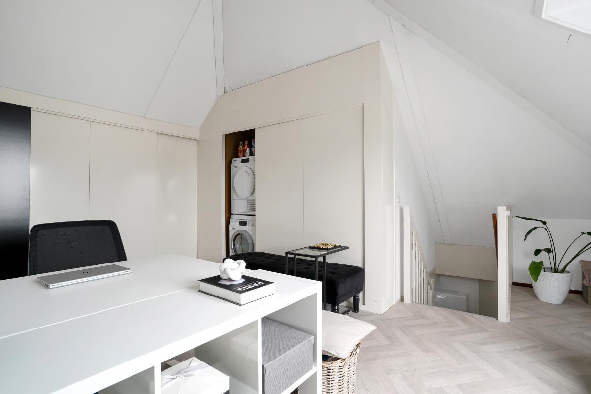 2e verdieping: En dan is er nog de zolder. Ik blijf het herhalen, maar ook deze ruimte voelt open en licht. De ruimte is opmerkelijk bruikbaar, mede door de handige kasten, het dakraam en de nette afwerking. Dit is echt een volwaardige extra laag in dit huis. De kamer op deze verdieping heeft een eigen sfeer. Iets beschutter, iets rustiger, bijna loftachtig door de schuine kap en de zichtbare lijnen van het dak. Juist dat geeft karakter. Tegelijk is de ruimte praktisch genoeg om er zonder moeite een comfortabele slaapverdieping, werkruimte of combinatie van beide van te maken. Ook aan bergruimte is goed gedacht. De vaste kastruimte volgt mooi de lijnen van het dak en benut de verdieping slim. Daarnaast is er plaats voor de wasapparatuur, netjes weggewerkt in het geheel. De zolder voelt als een bonus die je echt iets oplevert. Voor slapen, werken, opbergen of hobbyen, ook hier kun je het helemaal naar eigen wens invullen.