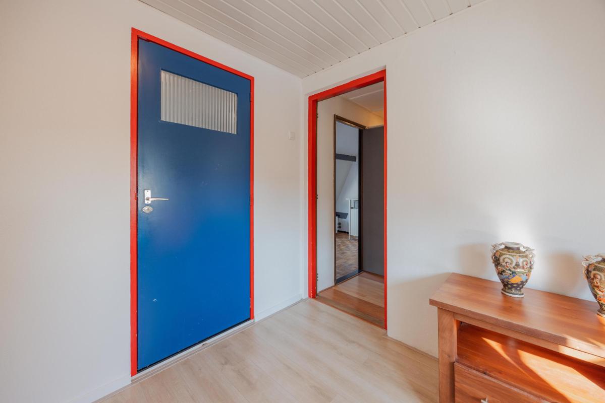 1e Verdieping: De overloop geeft toegang tot de 3 slaapkamers en de badkamer. De gehele verdieping is voorzien van gestucte wanden en laminaatvloeren. De slaapkamer aan de voorzijde is te bereiken via een tussenkamer (denk aan een thuiswerkplek), door de inloopkast om zo in de ruime slaapkamer met aan beide zijde vaste kasten uit te komen. In het midden van deze verdieping is de 2e slaapkamer met dakkapel gelegen en de 2e badkamer. De badkamer is deels betegeld en van diverse gemakken voorzien. Zo is er een toilet, wastafel, vaste kast, douchecabine en Velux-dakraam aanwezig. De 3e slaapkamer is aan de achterzijde gelegen en beschikt eveneens over een vaste kast.