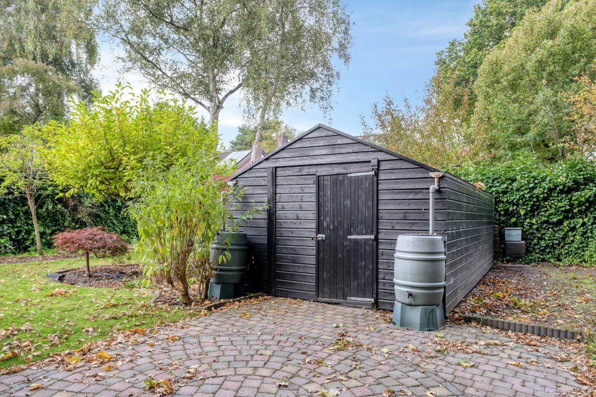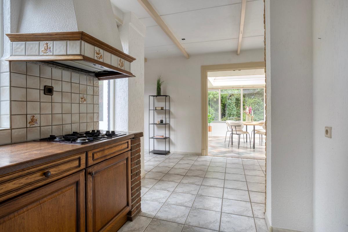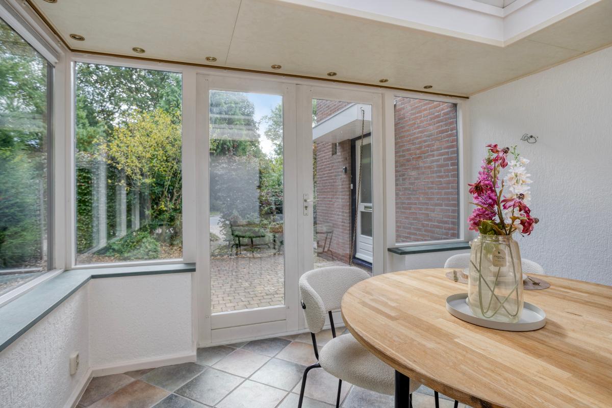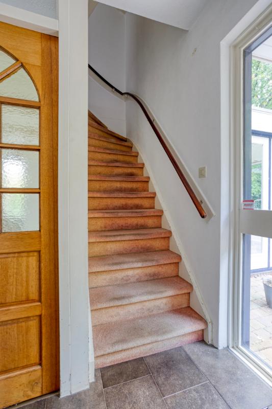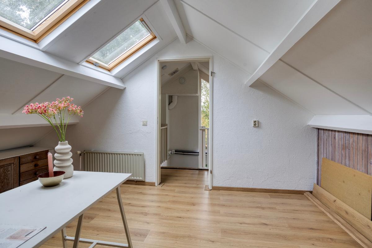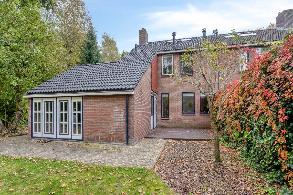 Indeling: Begane grond: entree met ruime hal met meterkast, trapopgang en moderne toiletruimte met hangtoilet en fonteintje. De royale Z-vormige woonkamer is v.v. een inzet houtkachel, bergruimte onder de trap en een tuindeur. De woonkamer staat in open verbinding met de aangebouwde eetkamer en de deels open keuken. De heerlijk zonnige eetkamer heeft een grote dakkoepel, dubbele openslaande tuindeuren en biedt door de royale raampartij een mooi zicht op de tuin. De gedeeltelijk open keuken heeft een L-vormige keukeninrichting met dubbele spoelbak en een ingebouwde gaskookplaat, afzuigkap, koelkast en een combi oven-magnetron. De ruime bijkeuken heeft een bergvliering met c.v.ketel. De bijkeuken geeft toegang tot de zeer royale inpandige berging (voormalige garage) v.v. dubbele openslaande tuindeuren. 1e Verdieping: overloop met drie slaapkamers resp. 6, 13 v.v. wastafel en 14 m². De badkamer heeft een douchecabine, wastafel, toilet en wasmachine aansluiting. Vaste trap naar: 2e Verdieping: voorzolder en een aparte slaapkamer met bergruimte en twee dakramen.