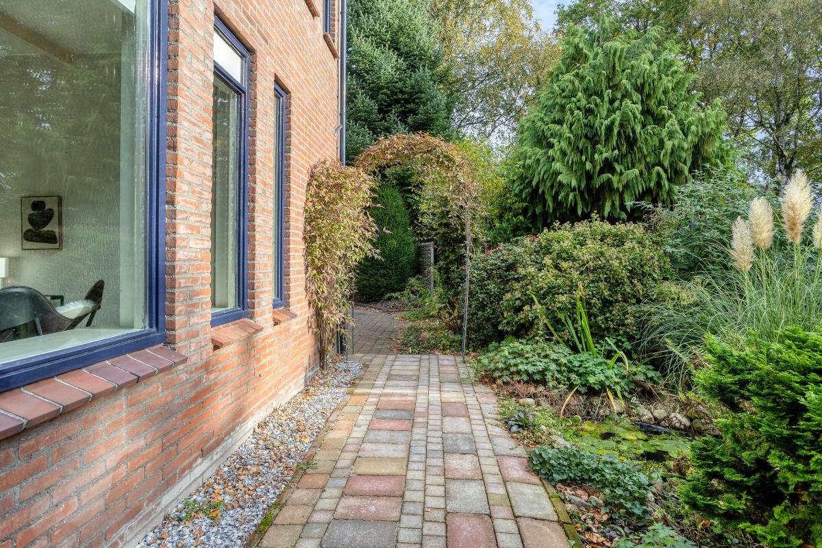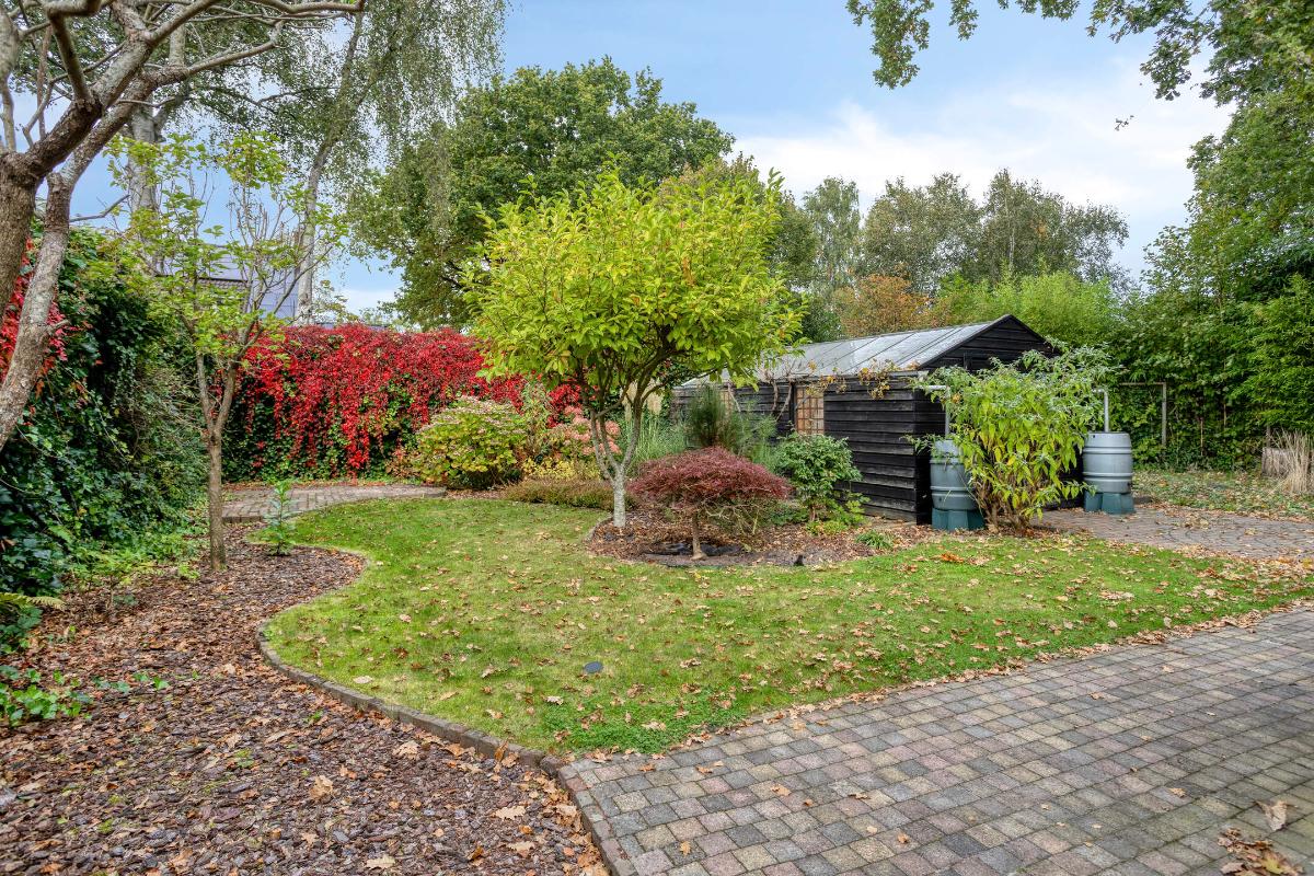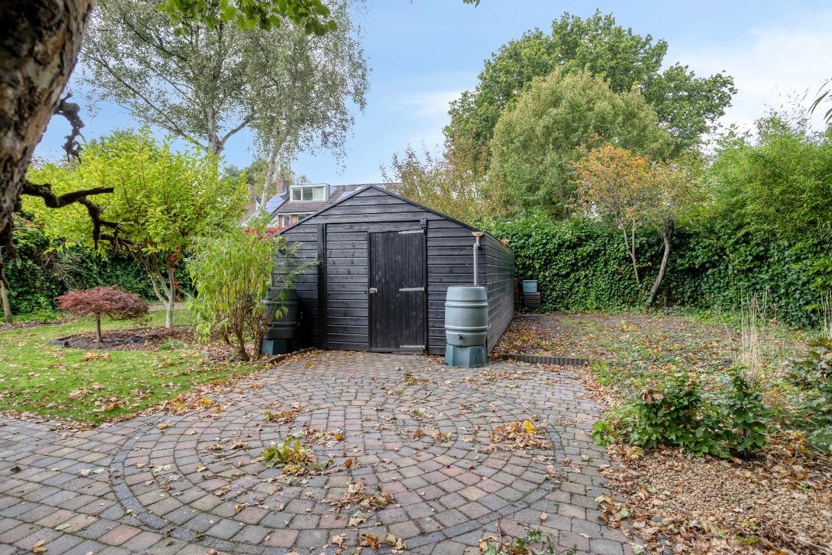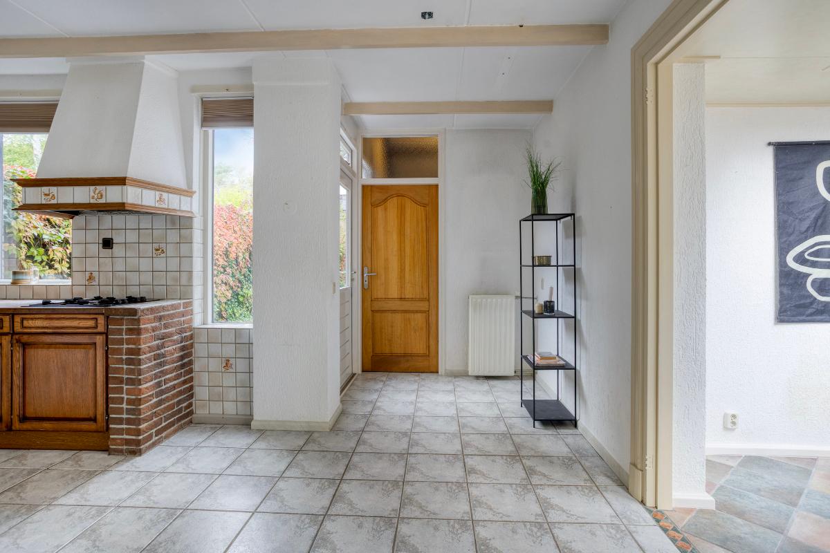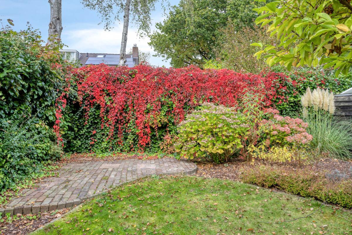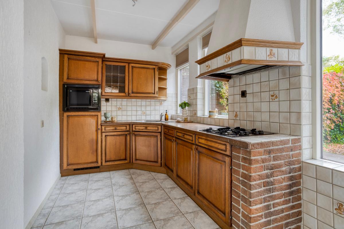 Indeling: Begane grond: entree met ruime hal met meterkast, trapopgang en moderne toiletruimte met hangtoilet en fonteintje. De royale Z-vormige woonkamer is v.v. een inzet houtkachel, bergruimte onder de trap en een tuindeur. De woonkamer staat in open verbinding met de aangebouwde eetkamer en de deels open keuken. De heerlijk zonnige eetkamer heeft een grote dakkoepel, dubbele openslaande tuindeuren en biedt door de royale raampartij een mooi zicht op de tuin. De gedeeltelijk open keuken heeft een L-vormige keukeninrichting met dubbele spoelbak en een ingebouwde gaskookplaat, afzuigkap, koelkast en een combi oven-magnetron. De ruime bijkeuken heeft een bergvliering met c.v.ketel. De bijkeuken geeft toegang tot de zeer royale inpandige berging (voormalige garage) v.v. dubbele openslaande tuindeuren. 1e Verdieping: overloop met drie slaapkamers resp. 6, 13 v.v. wastafel en 14 m². De badkamer heeft een douchecabine, wastafel, toilet en wasmachine aansluiting. Vaste trap naar: 2e Verdieping: voorzolder en een aparte slaapkamer met bergruimte en twee dakramen.