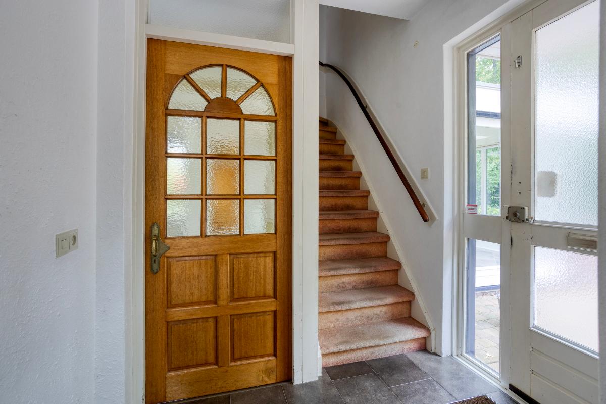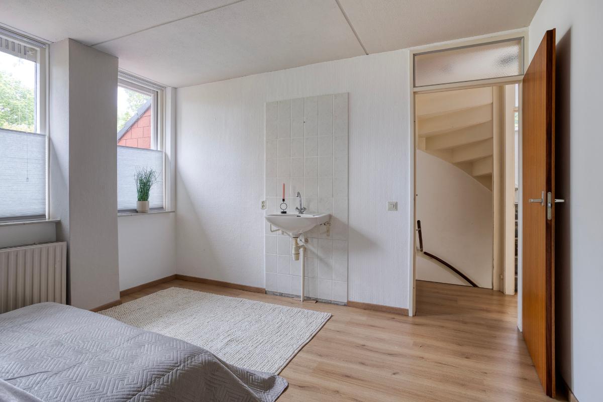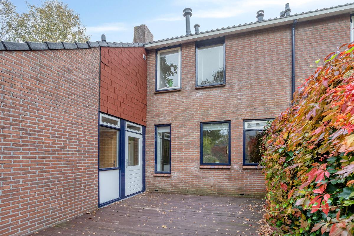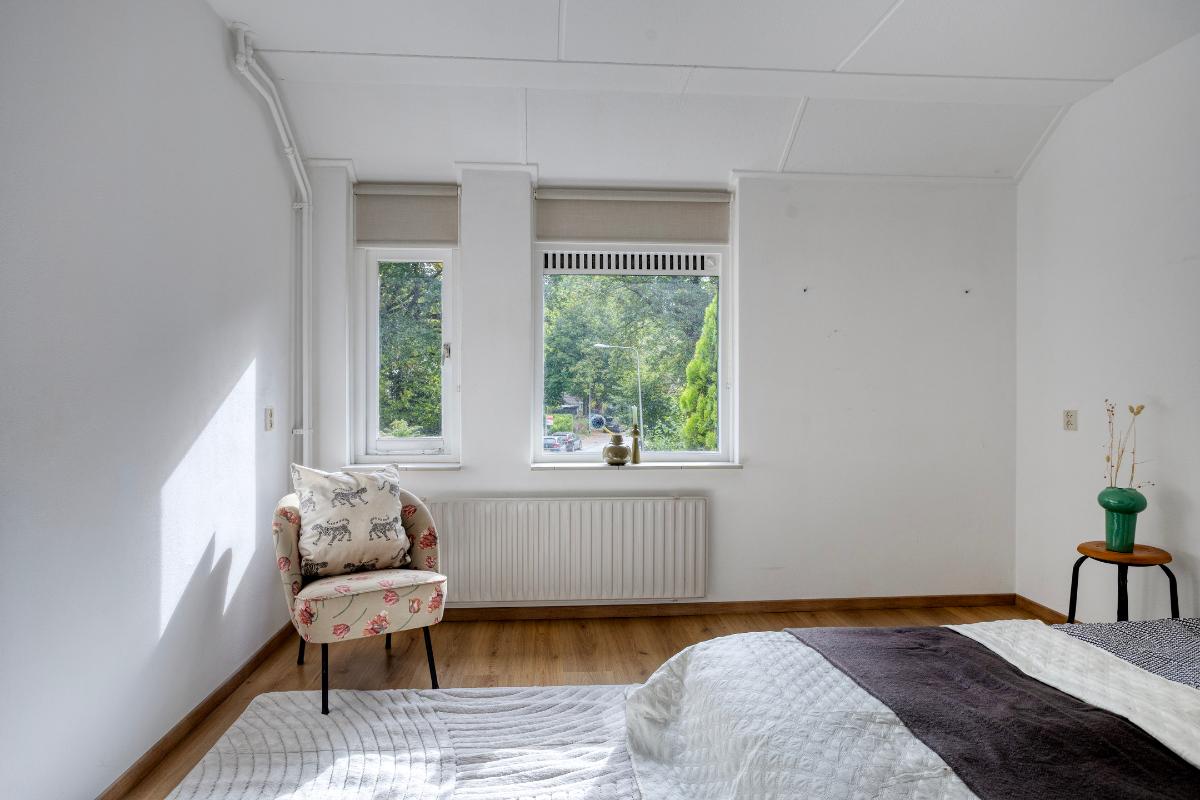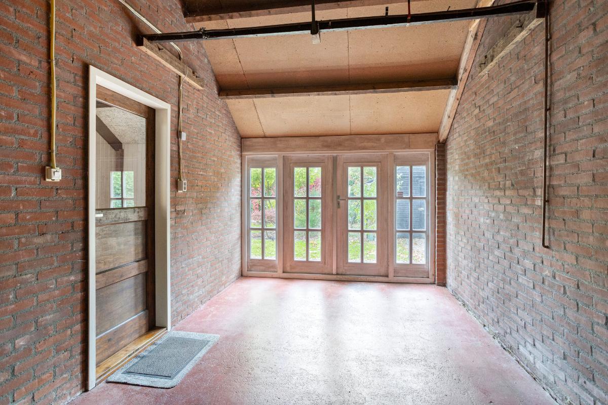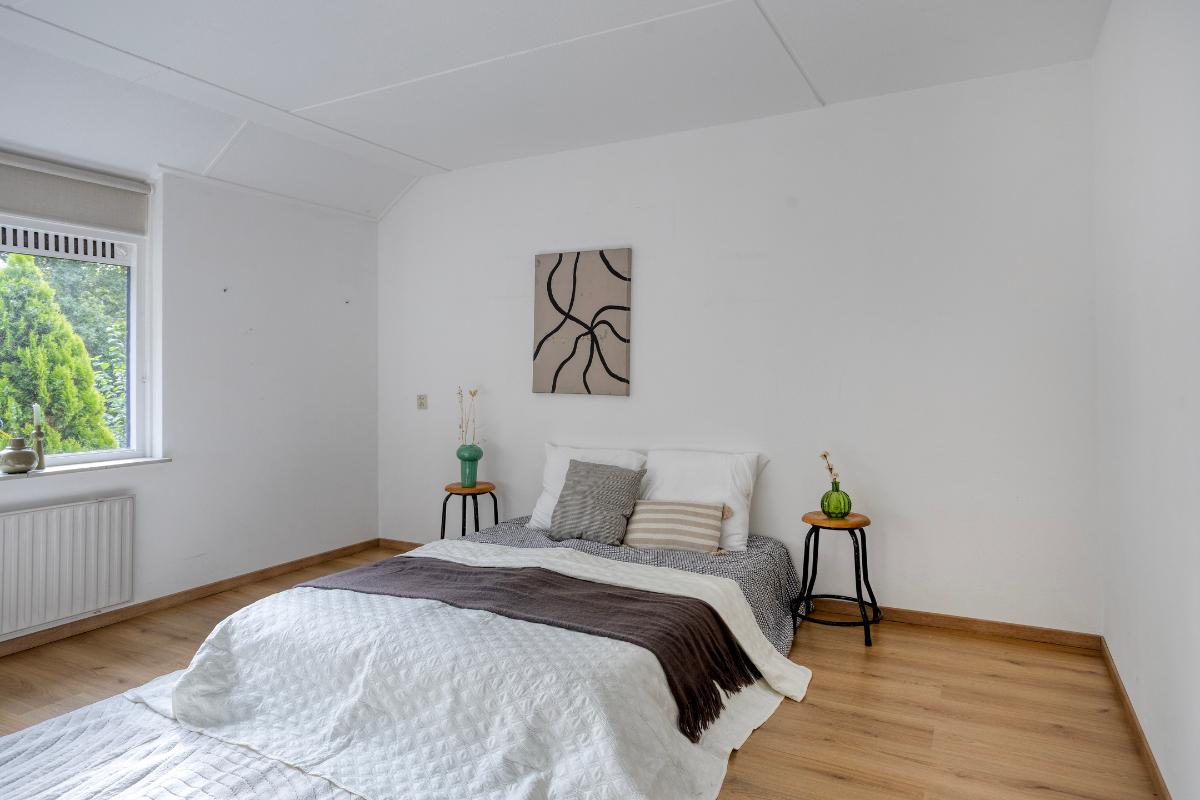 Indeling: Begane grond: entree met ruime hal met meterkast, trapopgang en moderne toiletruimte met hangtoilet en fonteintje. De royale Z-vormige woonkamer is v.v. een inzet houtkachel, bergruimte onder de trap en een tuindeur. De woonkamer staat in open verbinding met de aangebouwde eetkamer en de deels open keuken. De heerlijk zonnige eetkamer heeft een grote dakkoepel, dubbele openslaande tuindeuren en biedt door de royale raampartij een mooi zicht op de tuin. De gedeeltelijk open keuken heeft een L-vormige keukeninrichting met dubbele spoelbak en een ingebouwde gaskookplaat, afzuigkap, koelkast en een combi oven-magnetron. De ruime bijkeuken heeft een bergvliering met c.v.ketel. De bijkeuken geeft toegang tot de zeer royale inpandige berging (voormalige garage) v.v. dubbele openslaande tuindeuren. 1e Verdieping: overloop met drie slaapkamers resp. 6, 13 v.v. wastafel en 14 m². De badkamer heeft een douchecabine, wastafel, toilet en wasmachine aansluiting. Vaste trap naar: 2e Verdieping: voorzolder en een aparte slaapkamer met bergruimte en twee dakramen.