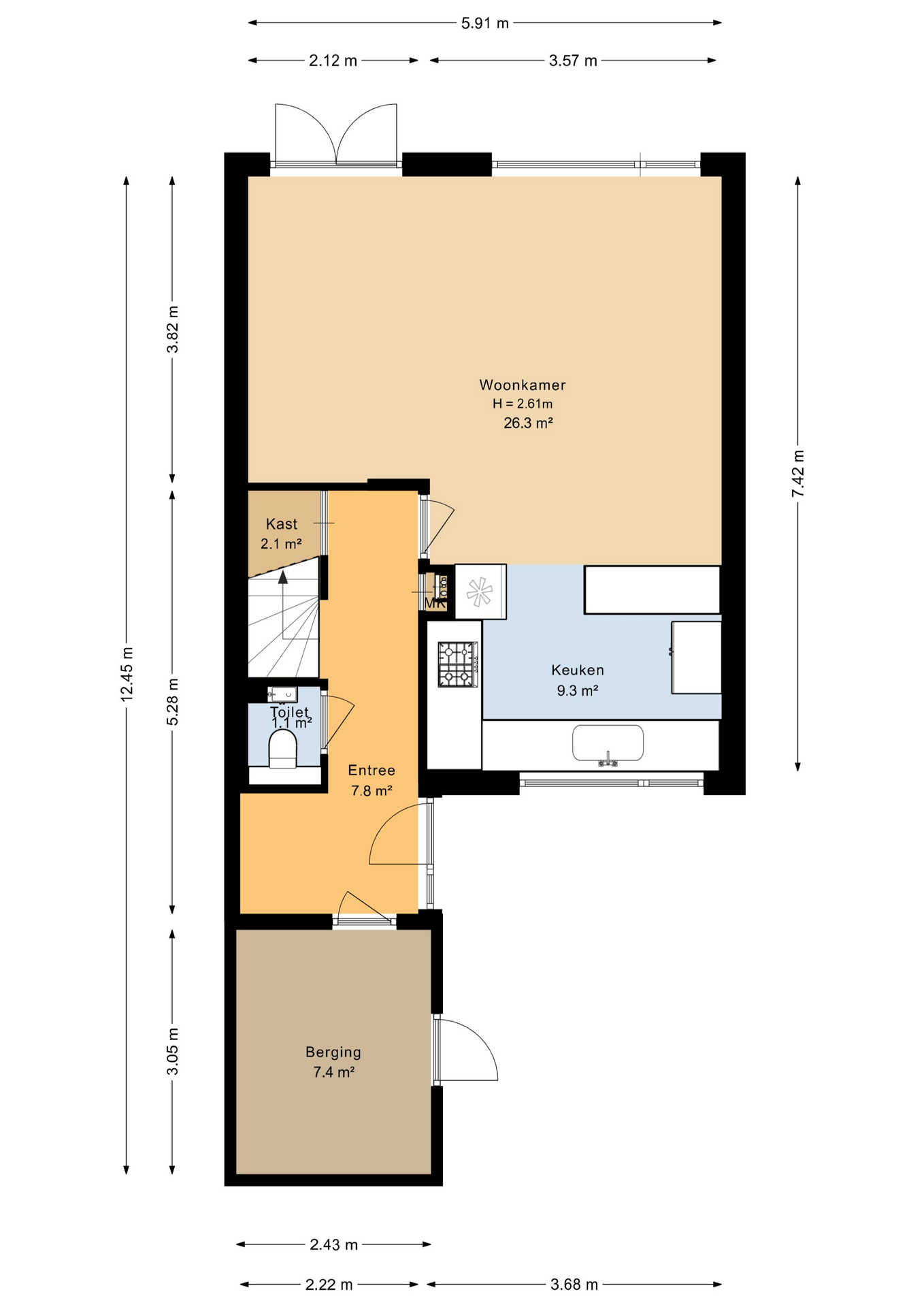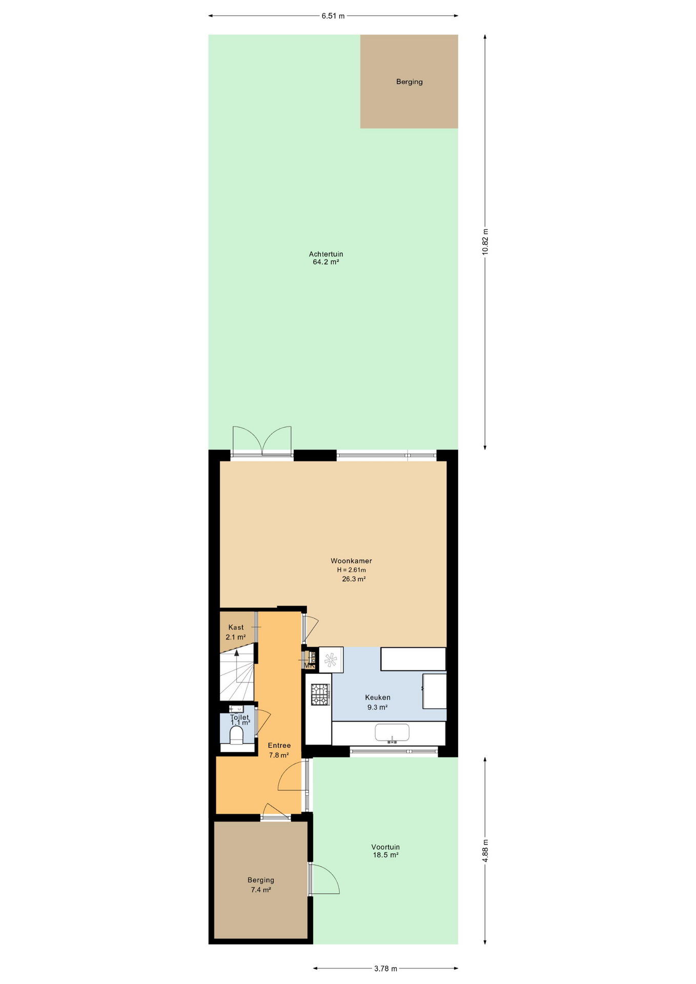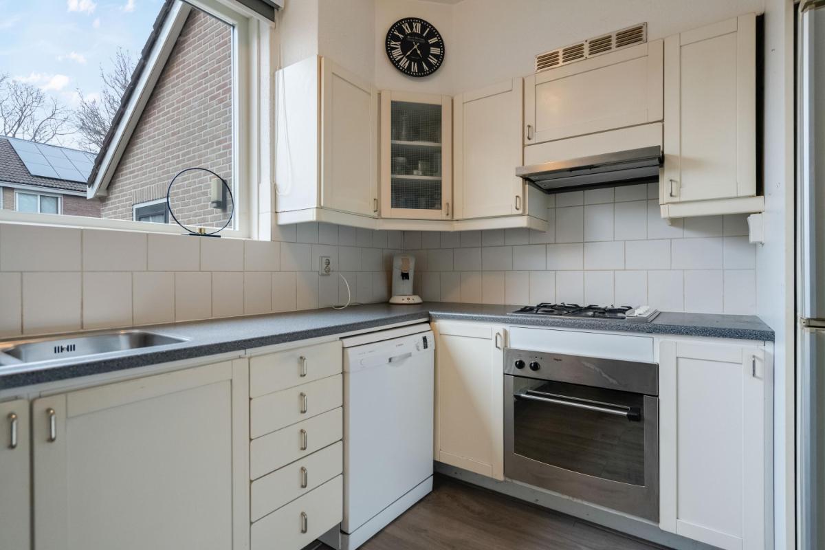 Begane grond Via de voortuin kom je binnen in een lichte hal met toegang tot het toilet, de trapopgang en de woonkamer. Aan de voorzijde van de woning bevindt zich de keuken. Deze is eenvoudig uitgevoerd, maar functioneel, en voorzien van diverse inbouwapparatuur zoals een kookplaat, afzuigkap, oven, vaatwasser en een koel-vriescombinatie. De woonkamer ligt aan de achterzijde en is ruim van opzet, met veel lichtinval door het grote raam met uitzicht op de tuin. De vloer is afgewerkt met laminaat en de indeling biedt veel mogelijkheden om naar eigen wens in te richten. Via een deur in de woonkamer stap je zo de achtertuin in.
