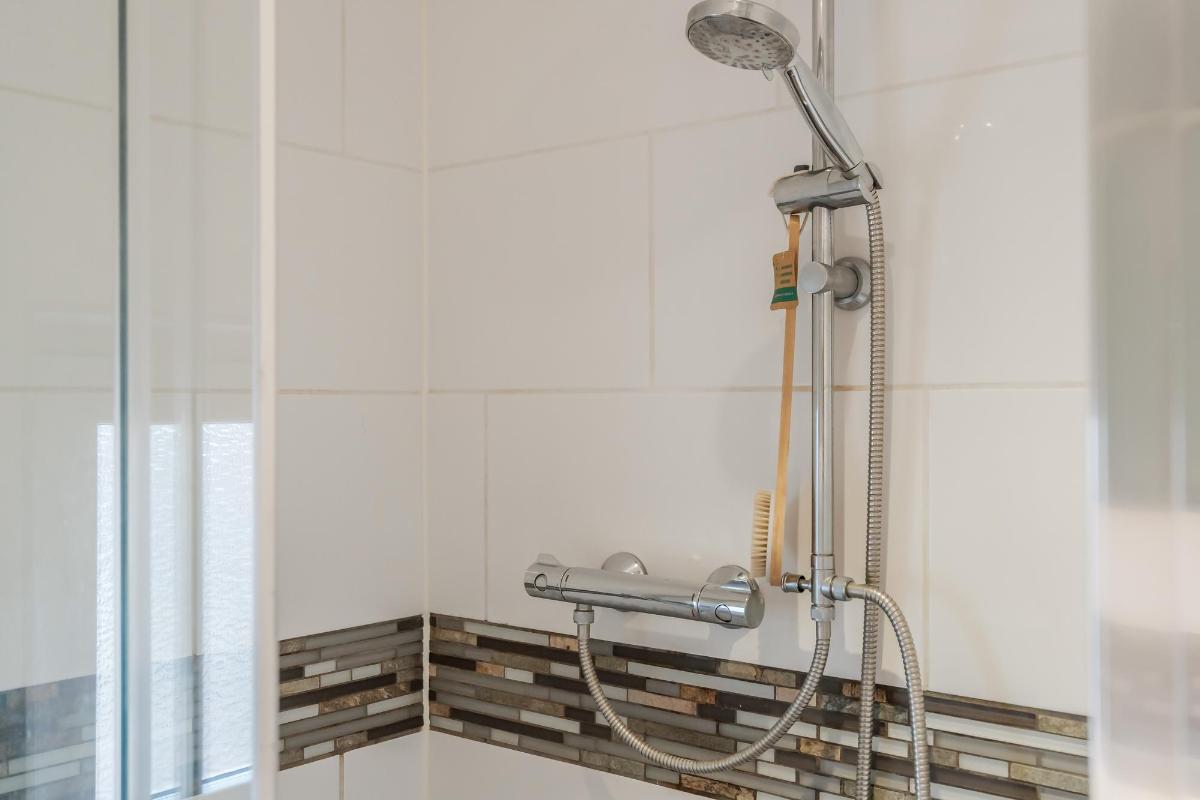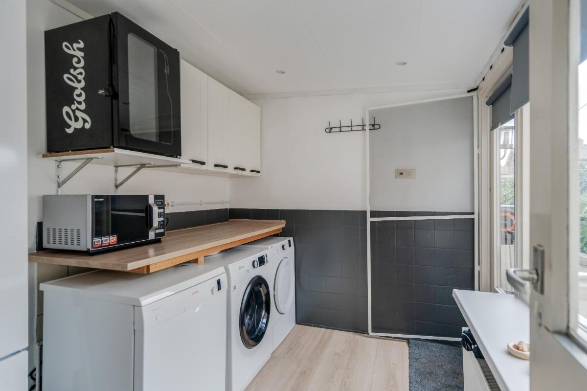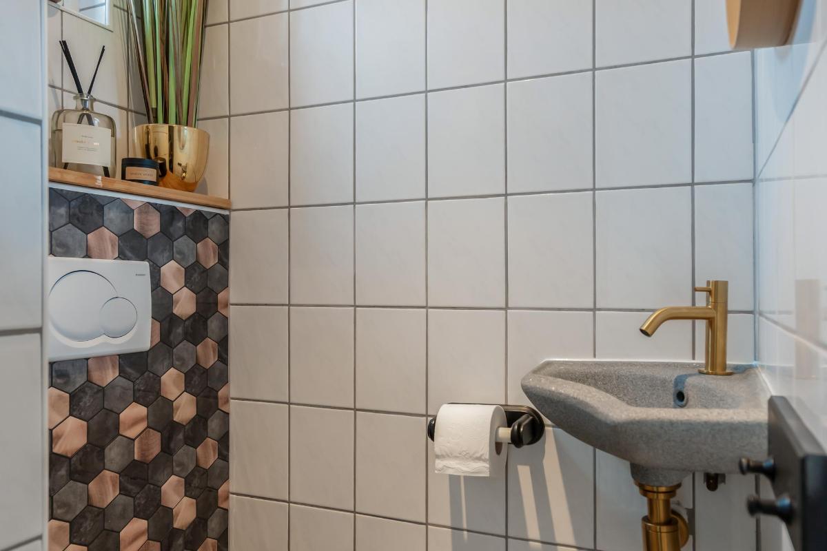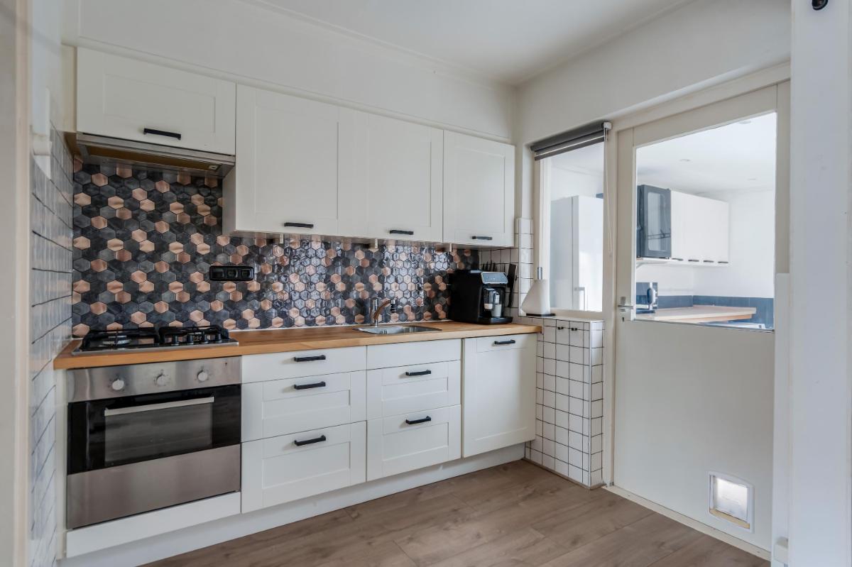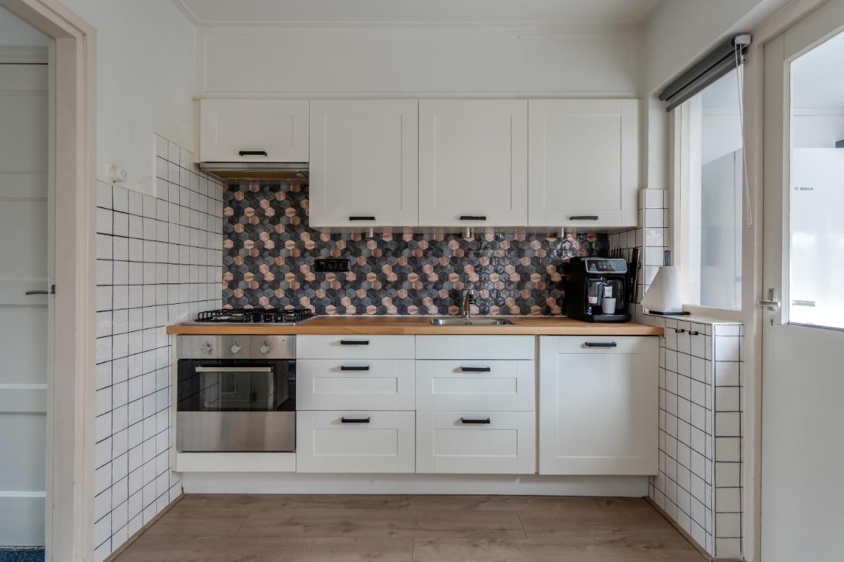 De keuken is halfopen en voorzien van een recht keukenblok met houten werkblad en inbouwapparatuur zoals een gaskookplaat, oven en afzuigkap. Direct aansluitend is de bijkeuken, waar je extra kastruimte hebt en de vaatwasser, plek witgoed en toegang tot de achtertuin. Een ideale ruimte voor extra gemak in het dagelijks leven.