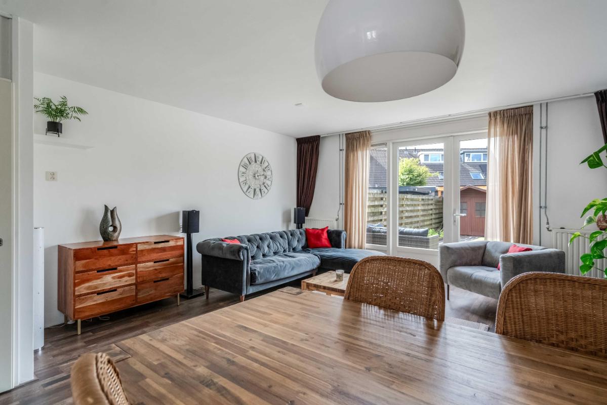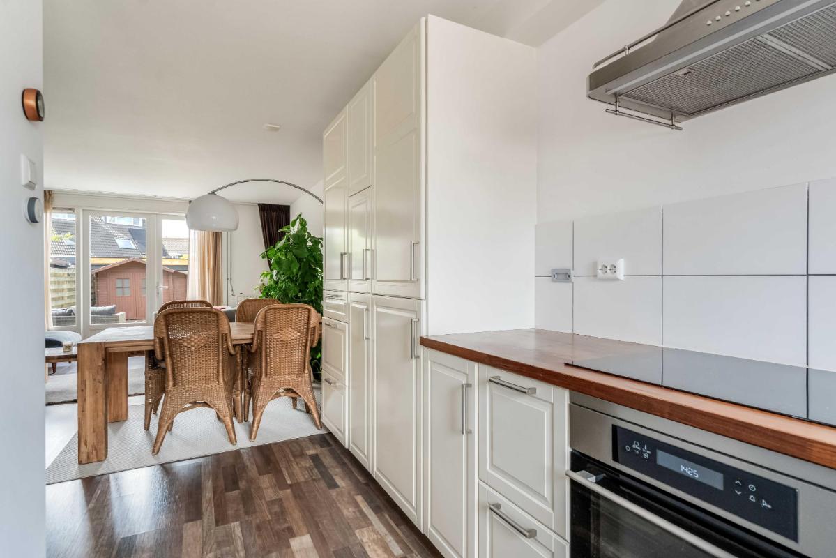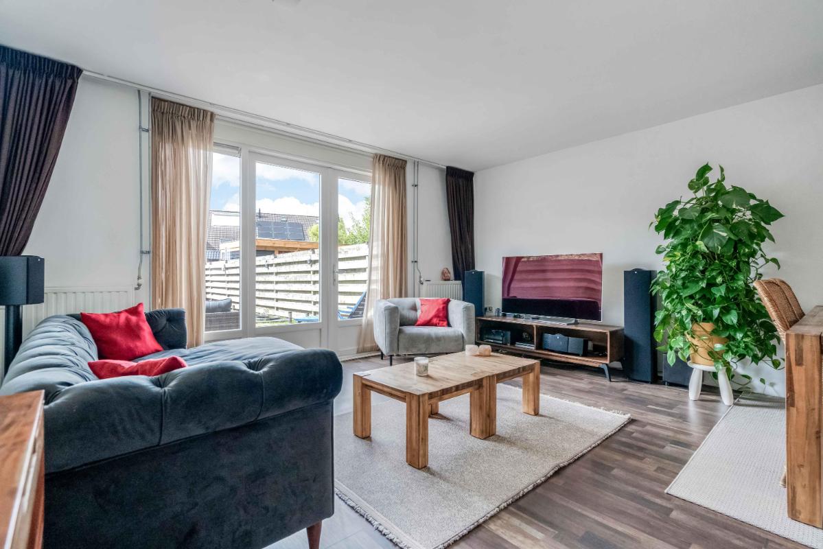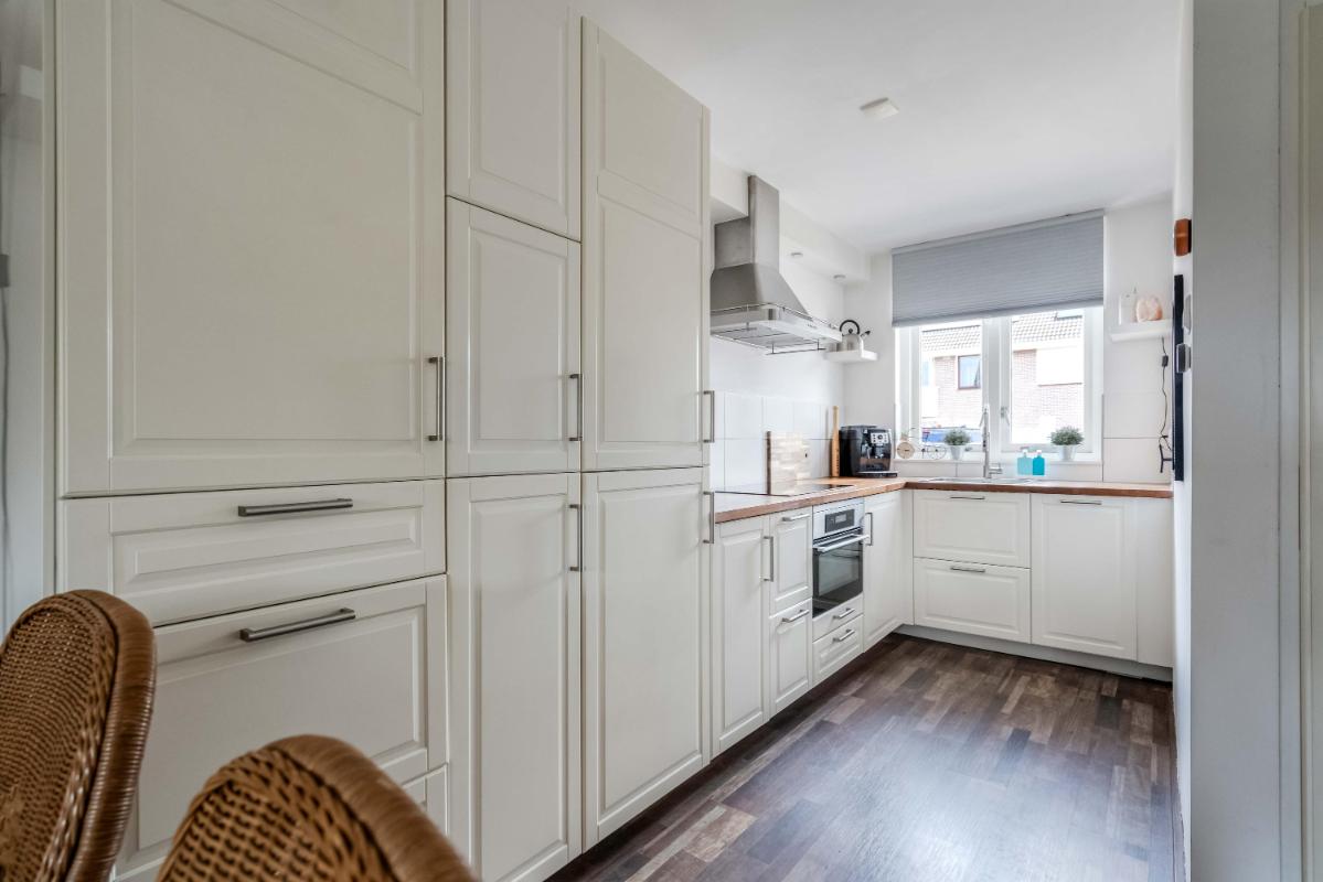 Begane grond Via de overkapte entree stap je binnen in de hal, waar je direct toegang hebt tot het moderne toilet, de meterkast, de praktische berging aan de voorzijde en de trapopgang. De hal loopt door naar de woonkamer en halfgesloten keuken, die gescheiden zijn maar toch in open verbinding met elkaar staan. De keuken aan de voorzijde is in 2018 vernieuwd en straalt rust en klasse uit met een landelijke stijl, witte fronten en een houtkleurig werkblad. Dankzij de slimme L-vorm profiteer je van veel werkruimte en kastruimte. Alle inbouwapparatuur blijft achter, waaronder een inductiekookplaat, afzuigkap, combimagnetron, koelkast, vriezer en vaatwasser – een volledig uitgeruste keuken, klaar voor gebruik. De woonkamer is gericht op de tuinzijde en biedt een prettige sfeer dankzij het vele daglicht dat binnenvalt via de openslaande kunststof tuindeuren (2016). De vloer is afgewerkt met warmkleurig laminaat, de wanden zijn neutraal gehouden – klaar om je eigen stijl in aan te brengen. Onder de trap bevindt zich een trapkast: ideaal voor stofzuiger, voorraad of kinderspeelgoed.
