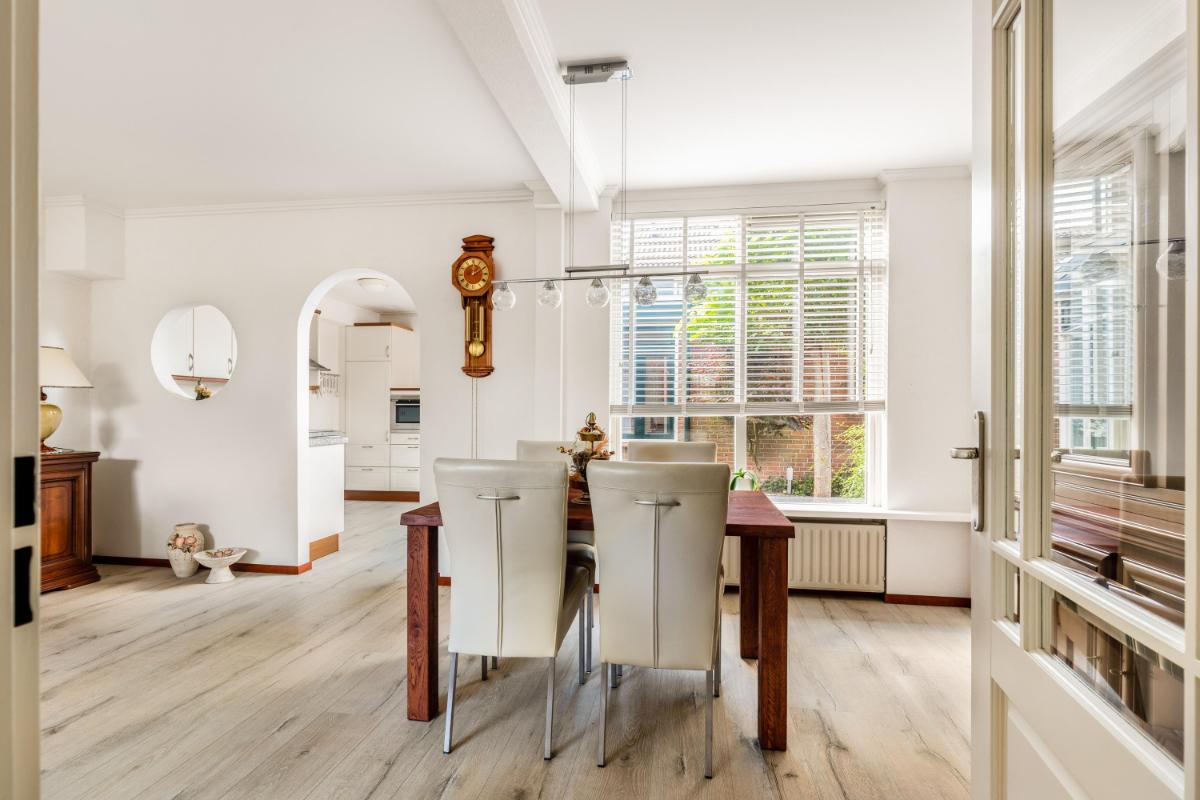 De woonkamer, met veel lichtinval, ligt aan de voorzijde van de woning met een zitgedeelte en het eetgedeelte aan de achterzijde, met uitzicht op de patio. De open keuken ligt centraal in de woning en is opgesteld in een combinatie van een hoekopstelling en een rechte wandopstelling met hoge kasten en diverse inbouwapparatuur.