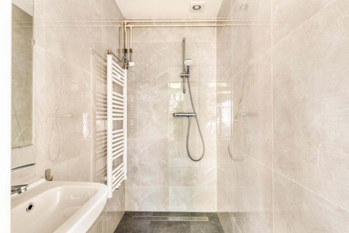 Grenzend aan de keuken ligt de ruime slaapkamer op de begane grond, voorzien van een lichtkoepel. Tevens is hier een tweede badkamer gerealiseerd met een moderne inloopdouche en wastafel – ideaal voor wie gelijkvloers wil wonen of gasten wil ontvangen.