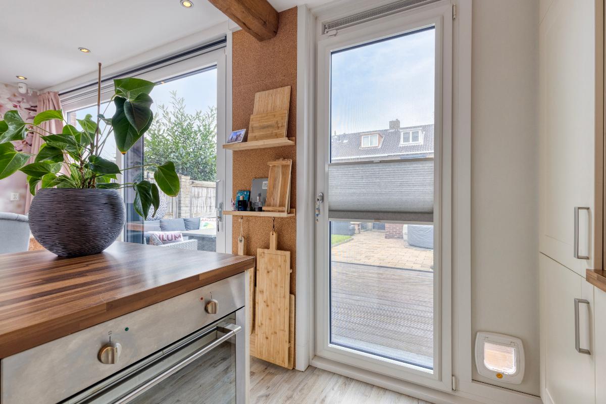 De open keuken in praktische U-opstelling sluit naadloos aan op de woonkamer en is voorzien van diverse inbouwapparatuur. Hierdoor kookt u hier met gemak terwijl u in contact blijft met uw gezin of gasten. In de trapkast zijn de wasmachine en droger netjes opgesteld, wat zorgt voor een efficiënte indeling van de ruimte.
