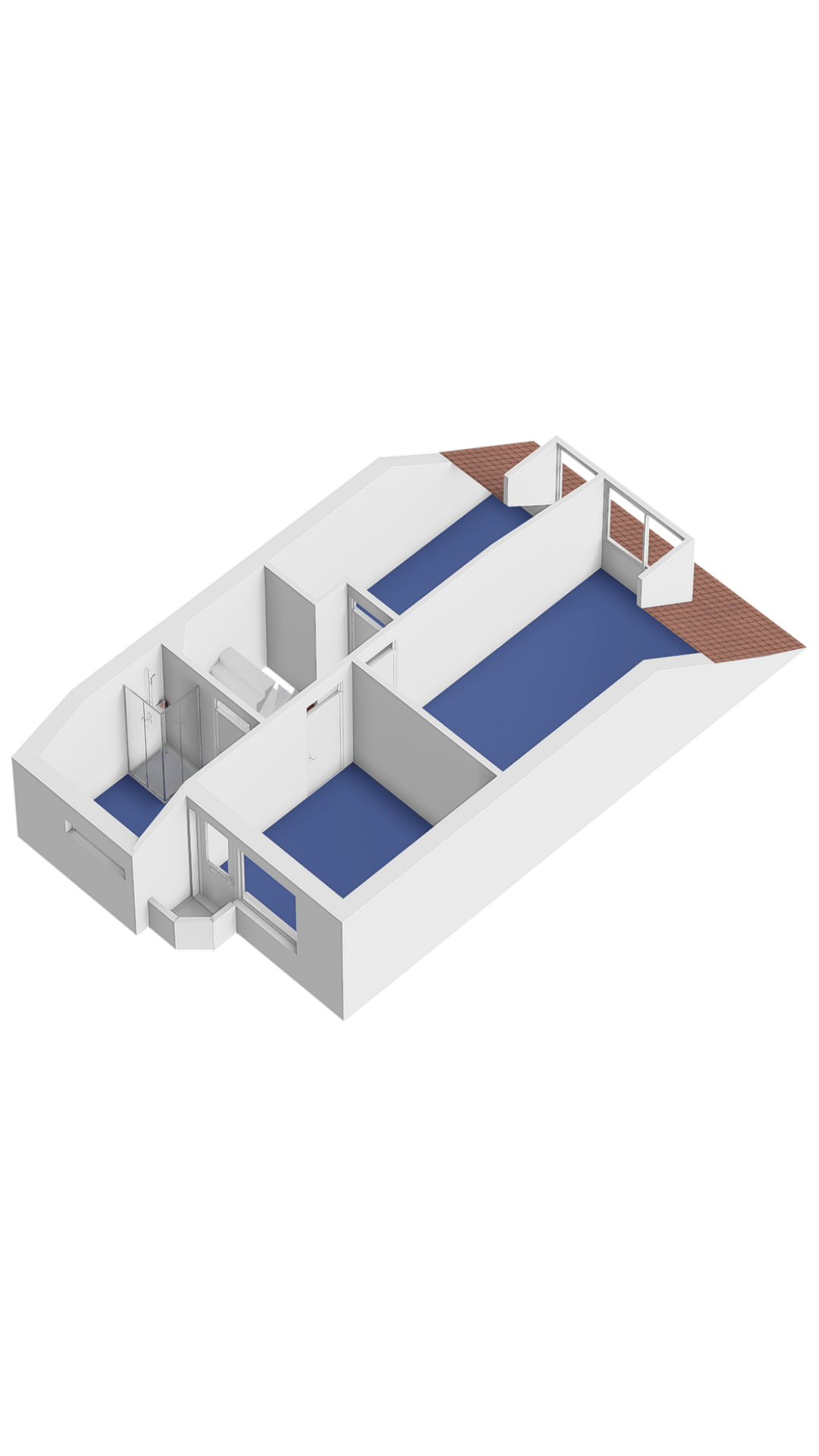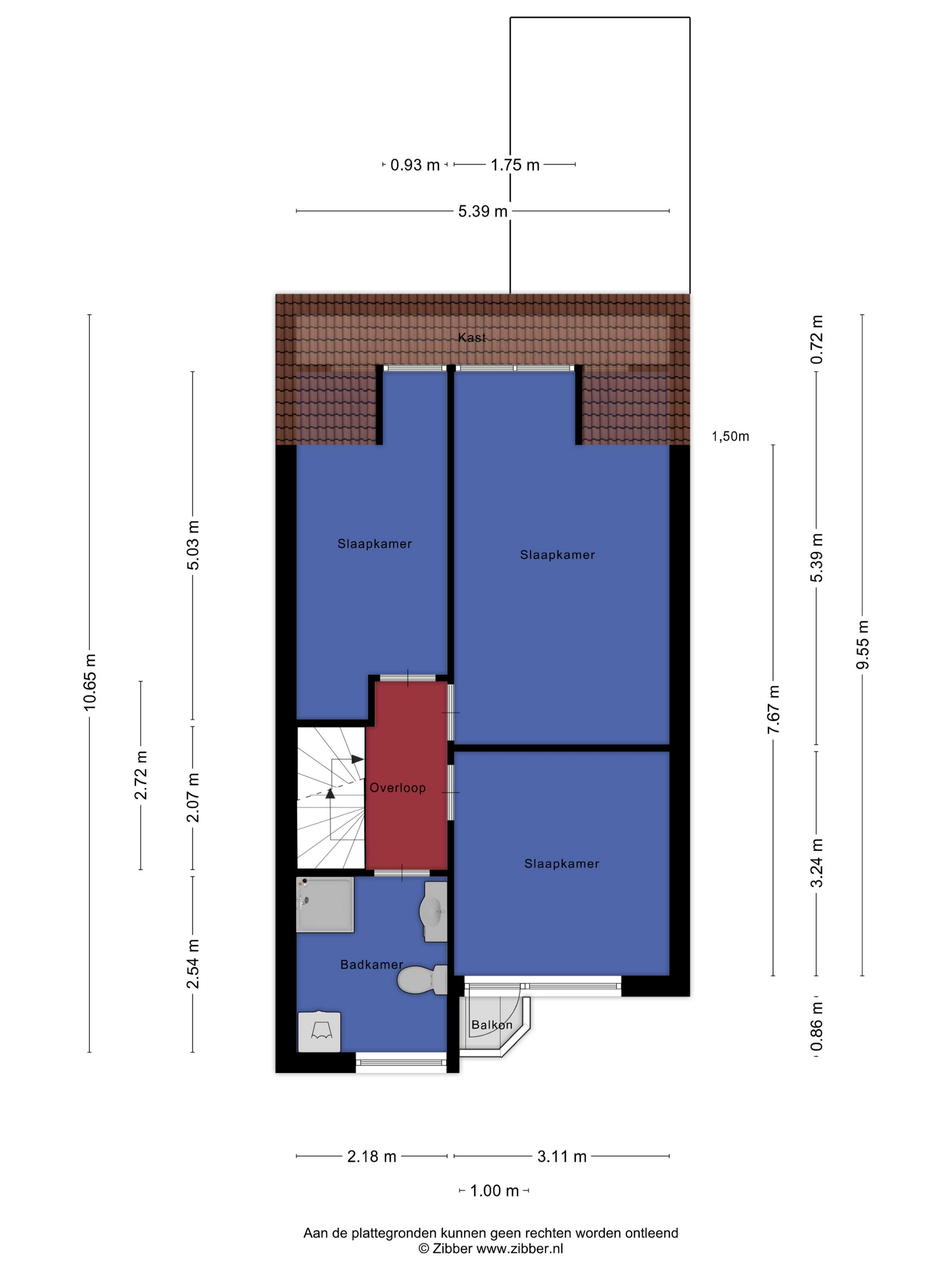 Eerste verdieping: overloop, drie slaapkamers waarvan één met klein balkon, dakkapel en een badkamer v.v. wastafel met meubel, toilet, douche en wasmachine aansluiting.