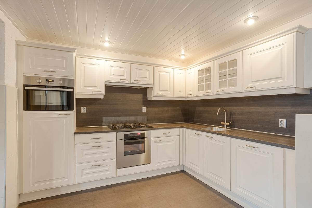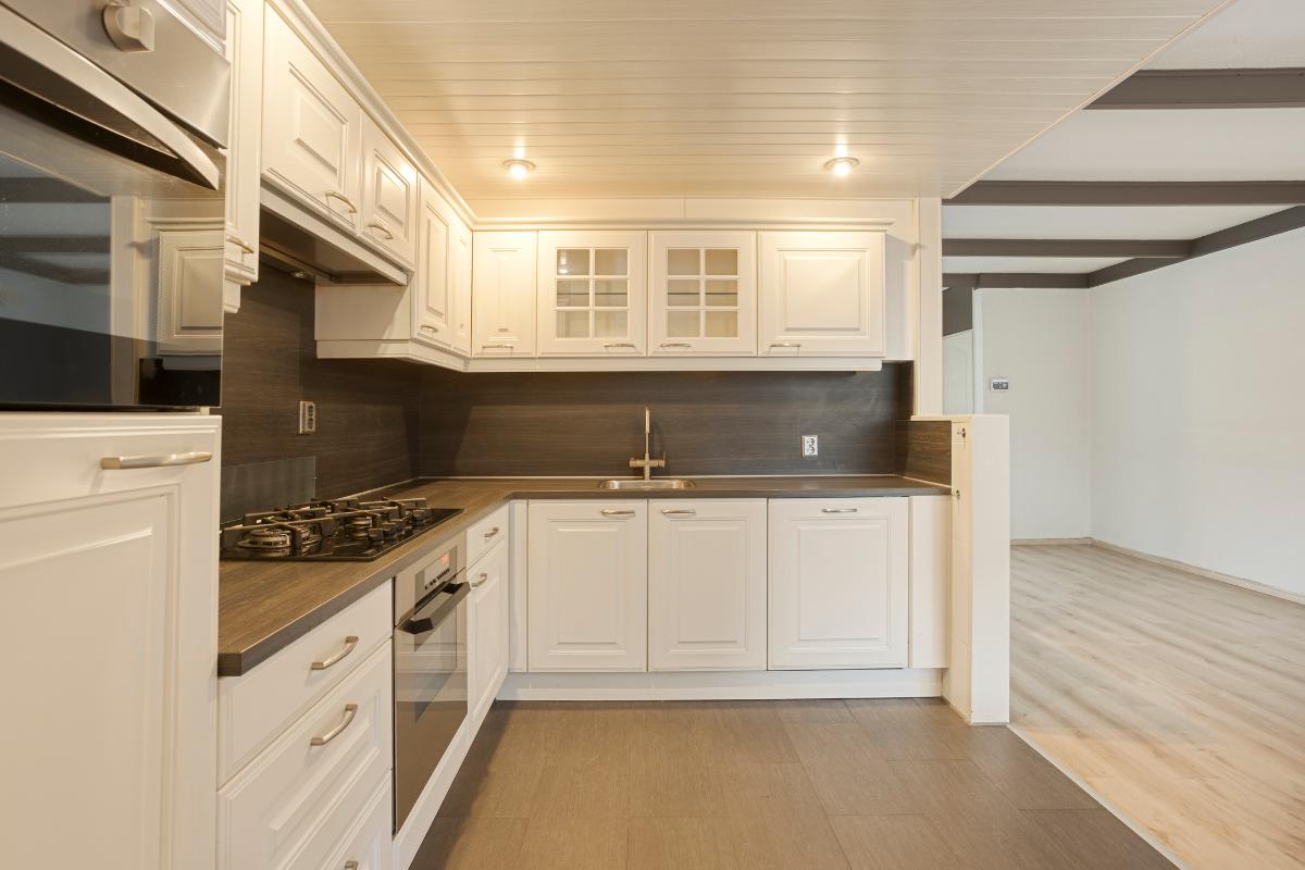 Bij binnenkomst kom je op de begane grond in de lichte woonkamer, een comfortabele leefruimte waar je je direct thuis voelt. De open keuken sluit hier naadloos op aan en is voorzien van diverse inbouwapparatuur, waardoor koken en samenzijn moeiteloos samengaan. Vanuit de keuken heb je toegang tot de praktische bijkeuken/berging en loop je zo door naar de achtertuin, een fijne plek om te ontspannen of te genieten van het buitenleven. Op de begane grond bevindt zich tevens een toilet met fontein. De woning is volledig voorzien van betonnen begane grond- en verdiepingsvloeren, wat bijdraagt aan het solide karakter en wooncomfort.