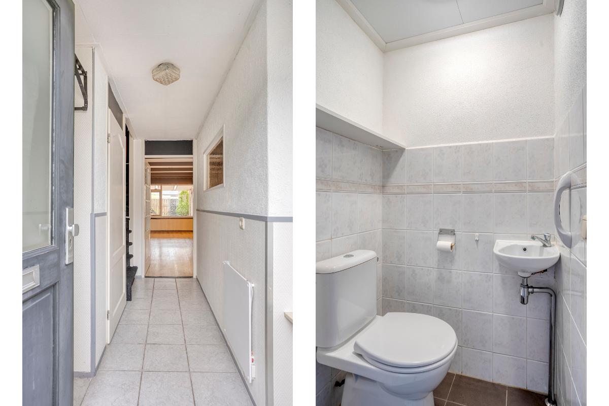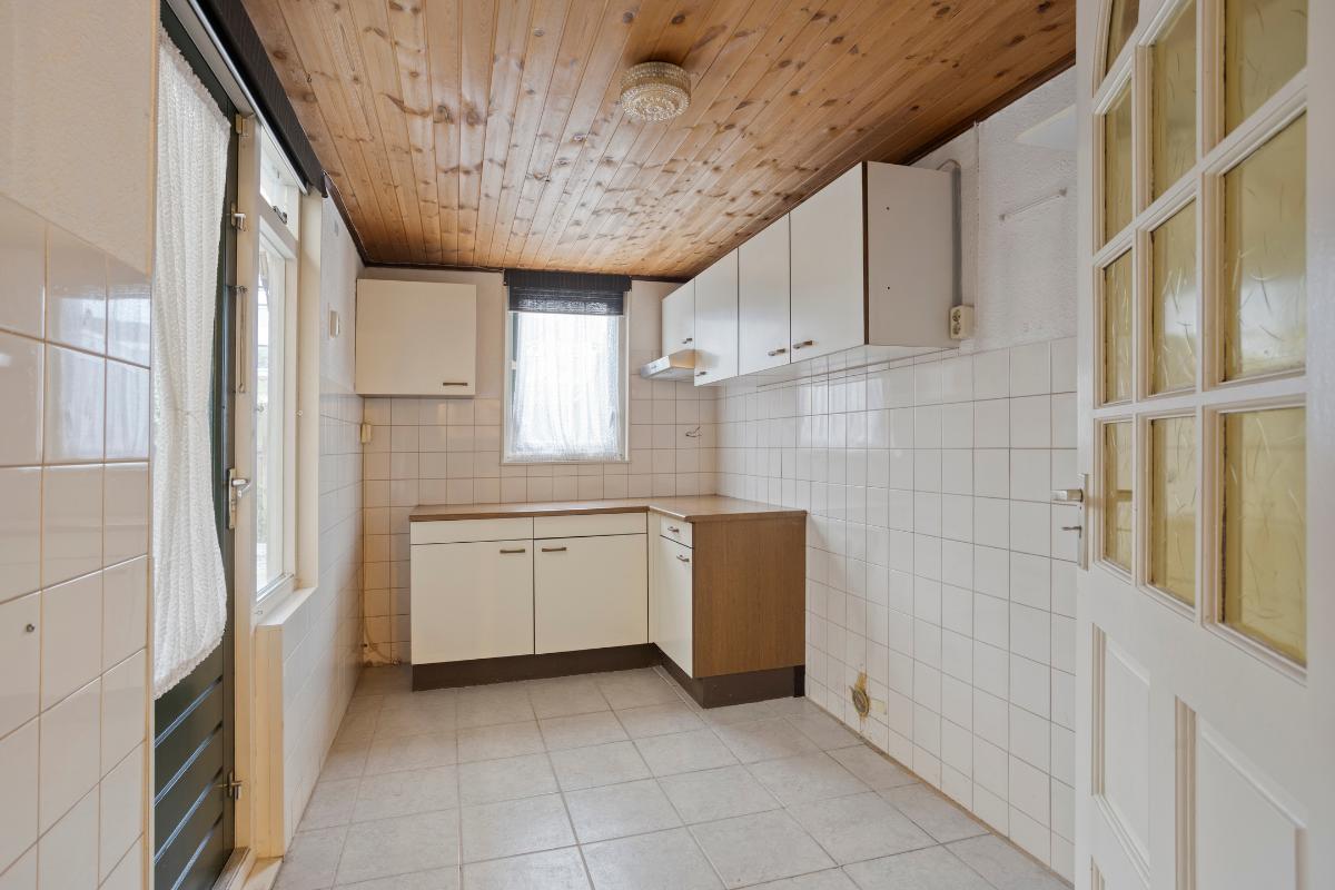 Indeling Begane grond: entree, hal, meterkast, toilet met fontein, trapopgang, toegang naar de woonkamer, trapkast, semi-open keuken v.v. inbouwapparatuur, toegang naar de bijkeuken (voormalige berging) en toegang naar de achtertuin.