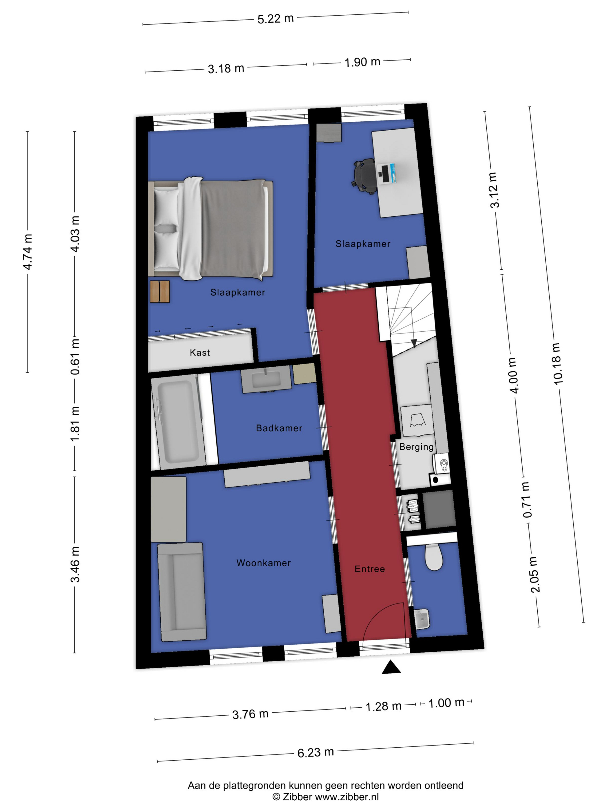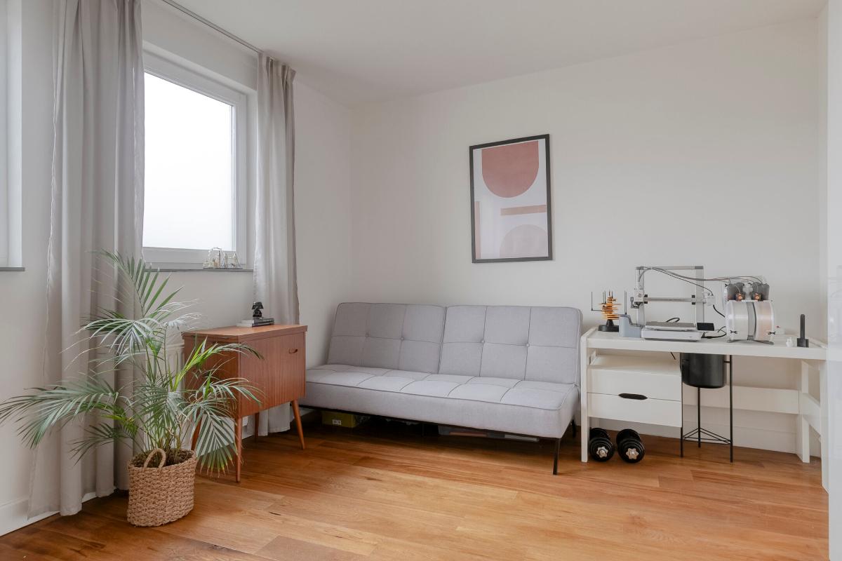 Ook deze woonlaag is voorzien van een houten vloer. Alle wanden en het plafond zijn gestuukt.