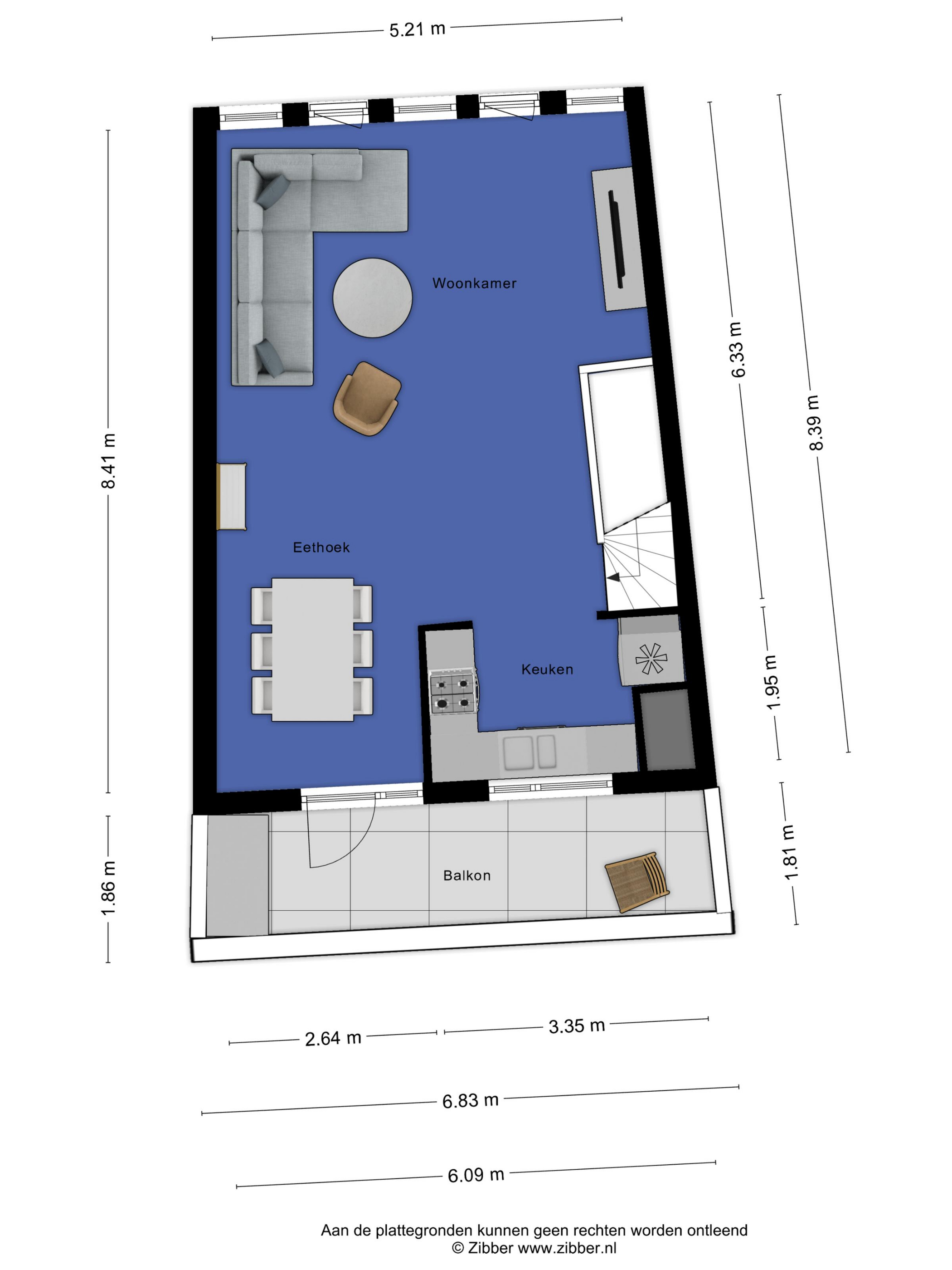 Logischerwijs is het gedeelte aan de voorzijde ingericht als sfeervolle zithoek. De achterzijde (bij de keuken) is in gebruik als eetgedeelte.