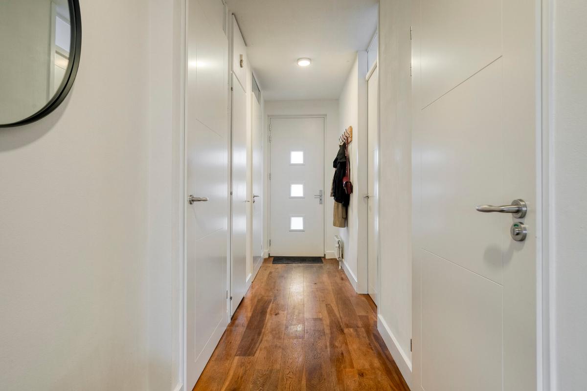 De hal is voorzien van een houten vloer. Alle wanden zijn gestuukt. De moderne strakke paneeldeuren geven de hal een sfeervolle uitstraling. Er is voldoende ruimte voor een garderobe.