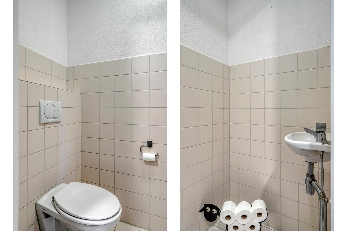 Toilet De separate toiletruimte is voorzien van een wandcloset en fonteintje. De wanden zijn deels betegeld in een neutrale kleurstelling.