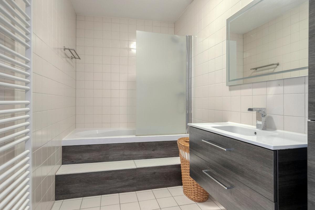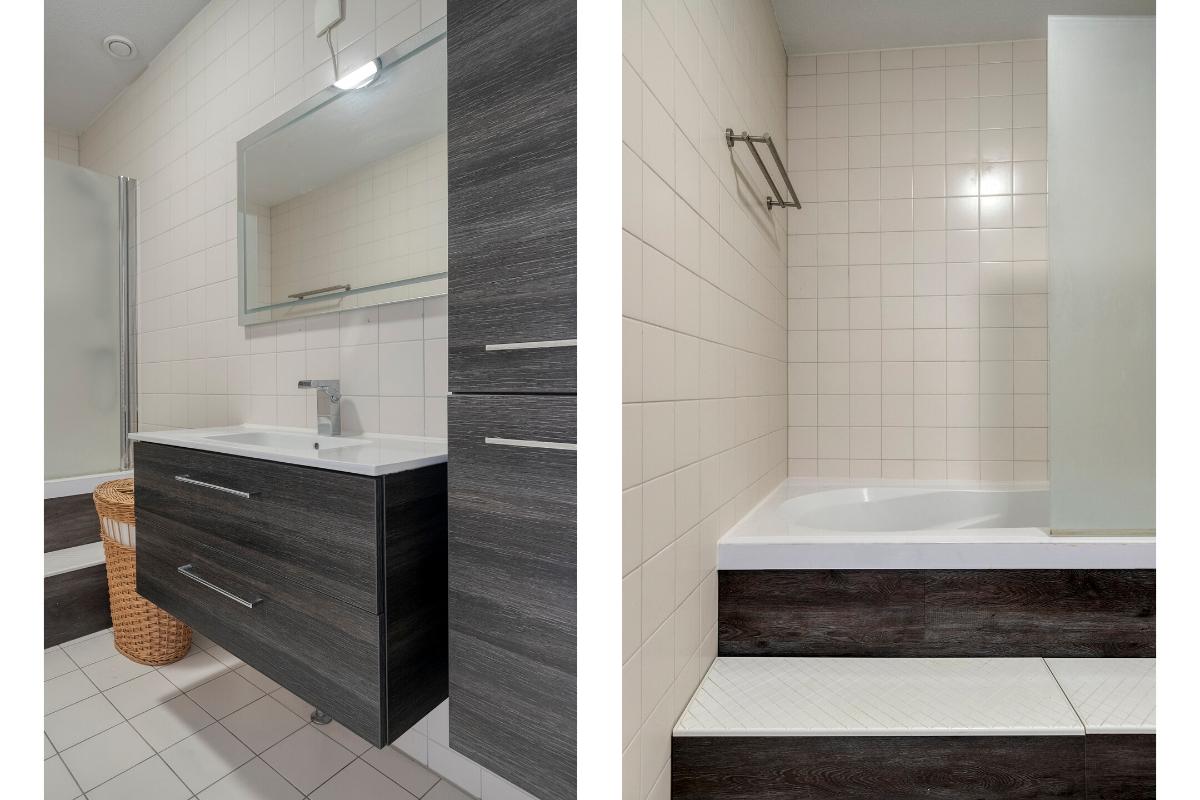 Badkamer De complete badkamer is ingericht met een ligbad-/douchecombinatie met glazen scherm, wastafelmeubel en designradiator. Alle wanden zijn volledig betegeld met een lichte tegel. Door het wastafelmeubel in houtlook en de afwerking van het bad in hetzelfde materiaal, krijgt de ruimte sfeer en warmte.