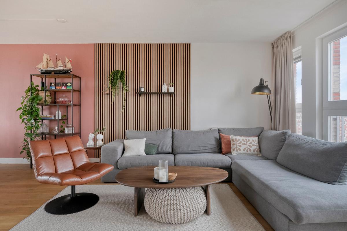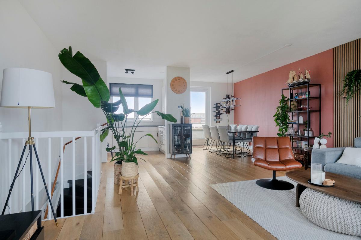Een vaste trap leidt naar de bovengelegen woonverdieping waar de woonkamer en keuken samen één ruime leefruimte vormen. Een heerlijke grote ruimte die op diverse manieren in te delen is. Blikvanger hier zijn toch wel de hoge raampartijen die een panoramisch uitzicht geven over de stad. Door de grote raampartijen aan zowel voor- als achterzijde, geniet de ruimte volop daglicht. De ruimte is niet alleen licht maar ook enorm sfeervol door de gekozen kleuren op de wand het houten wandpaneel. Echt een hele fijne ruimte om heerlijk te vertoeven!