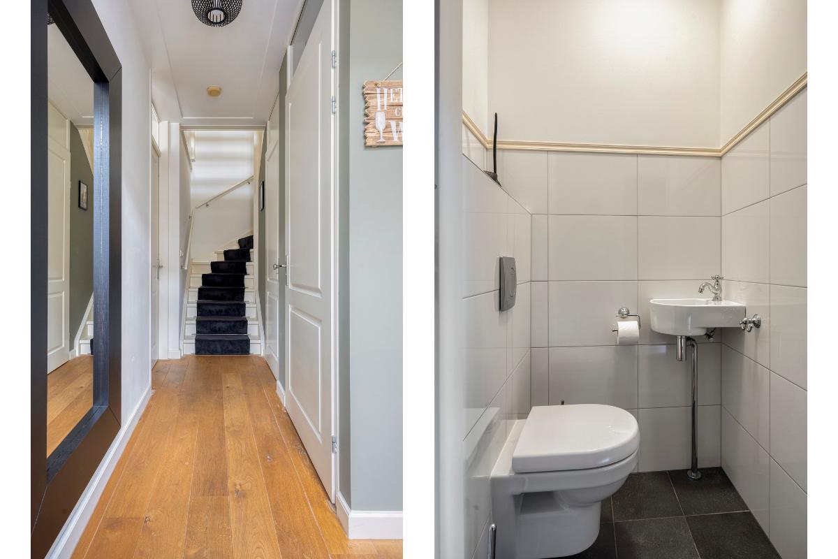 Entree Bij binnenkomst in de hal ervaar je direct de verzorgde afwerking van de woning. De luxe houten vloer loopt hier stijlvol door richting de woonkamer en zorgt voor een rustige basis. De wanden het het plafond zijn voorzien van strak stucwerk. In de hal vind je de meterkast, trapopgang en een toiletruimte.