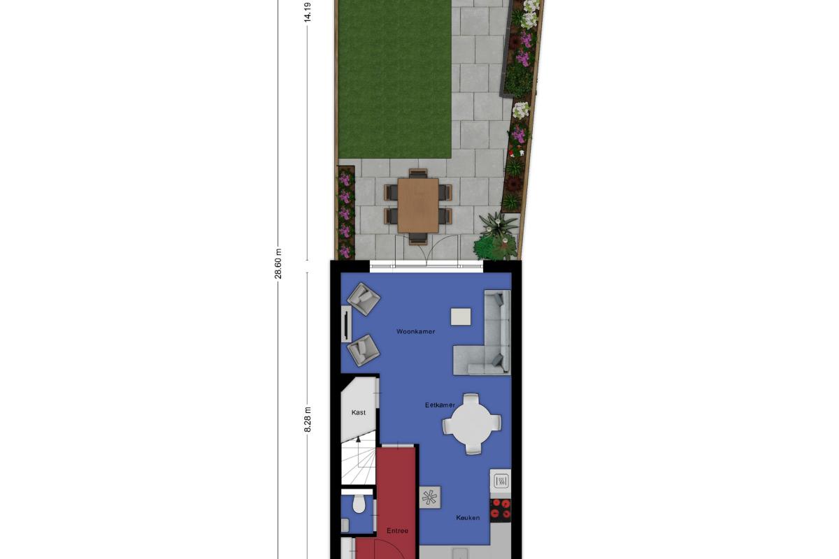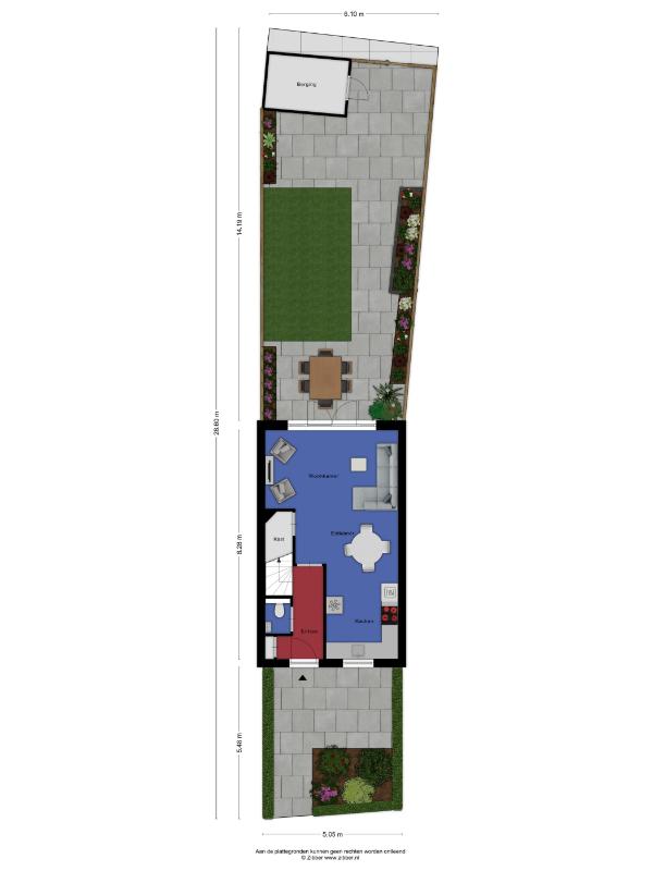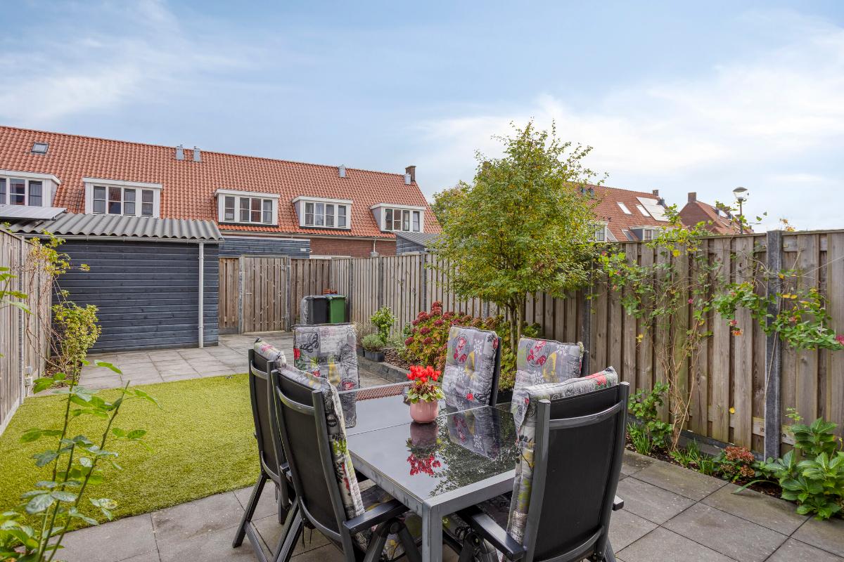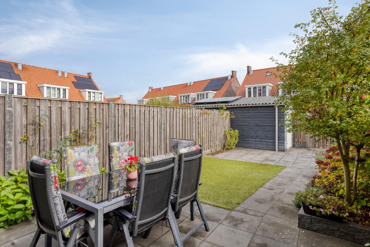 Tuin. De aangelegde achtertuin is ca. 13 meter diep en is aangelegd met kunstgras, borders met beplanting, elektra, terras met zonneluifel, achterom en houten berging met elektra.