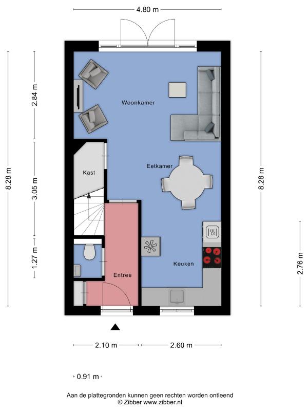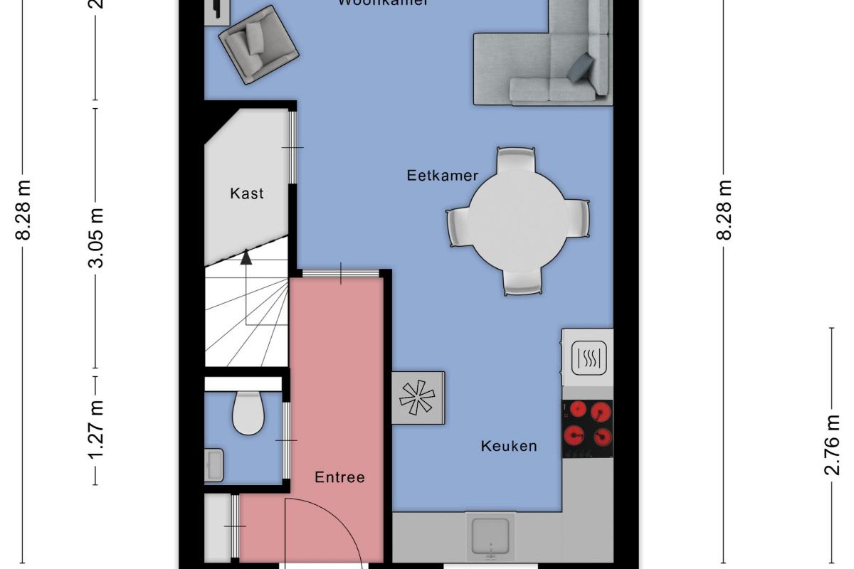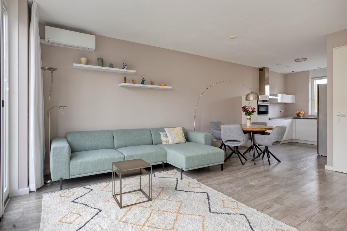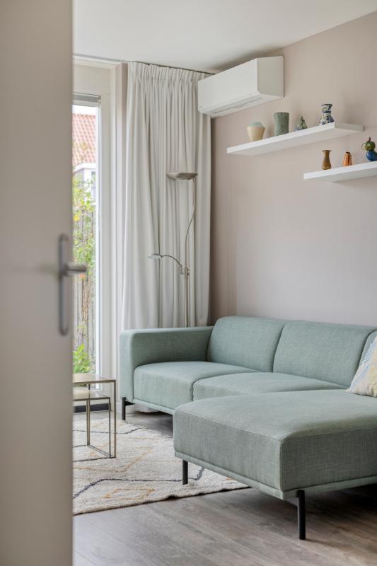 De L-vormige woonkamer beschikt over een nette laminaatvloer met vloerverwarming, gestuukte wand- en plafondafwerking en een airco-unit waarmee in de zomermaanden gekoeld kan worden en in de wintermaanden bij verwarmd kan worden. De tuindeuren aan de achterzijde zorgen voor een prettige lichtinval in de woning en bieden toegang tot de achtertuin. Een praktische trapkast zorgt voor extra bergruimte op de benedenverdieping.